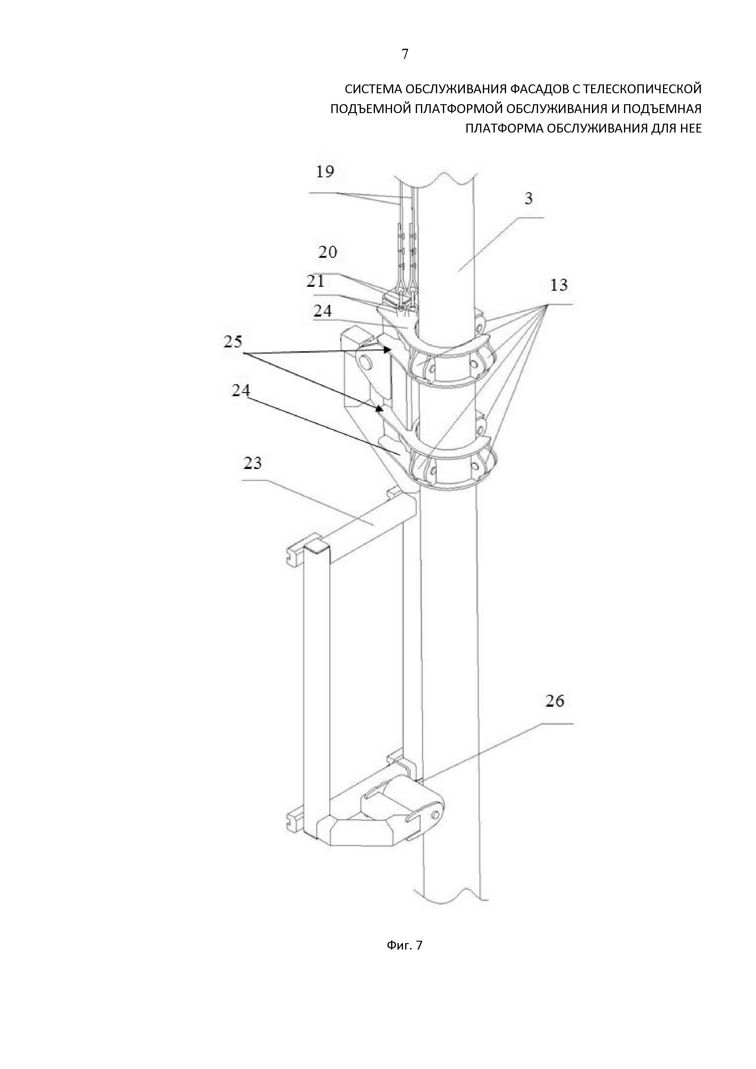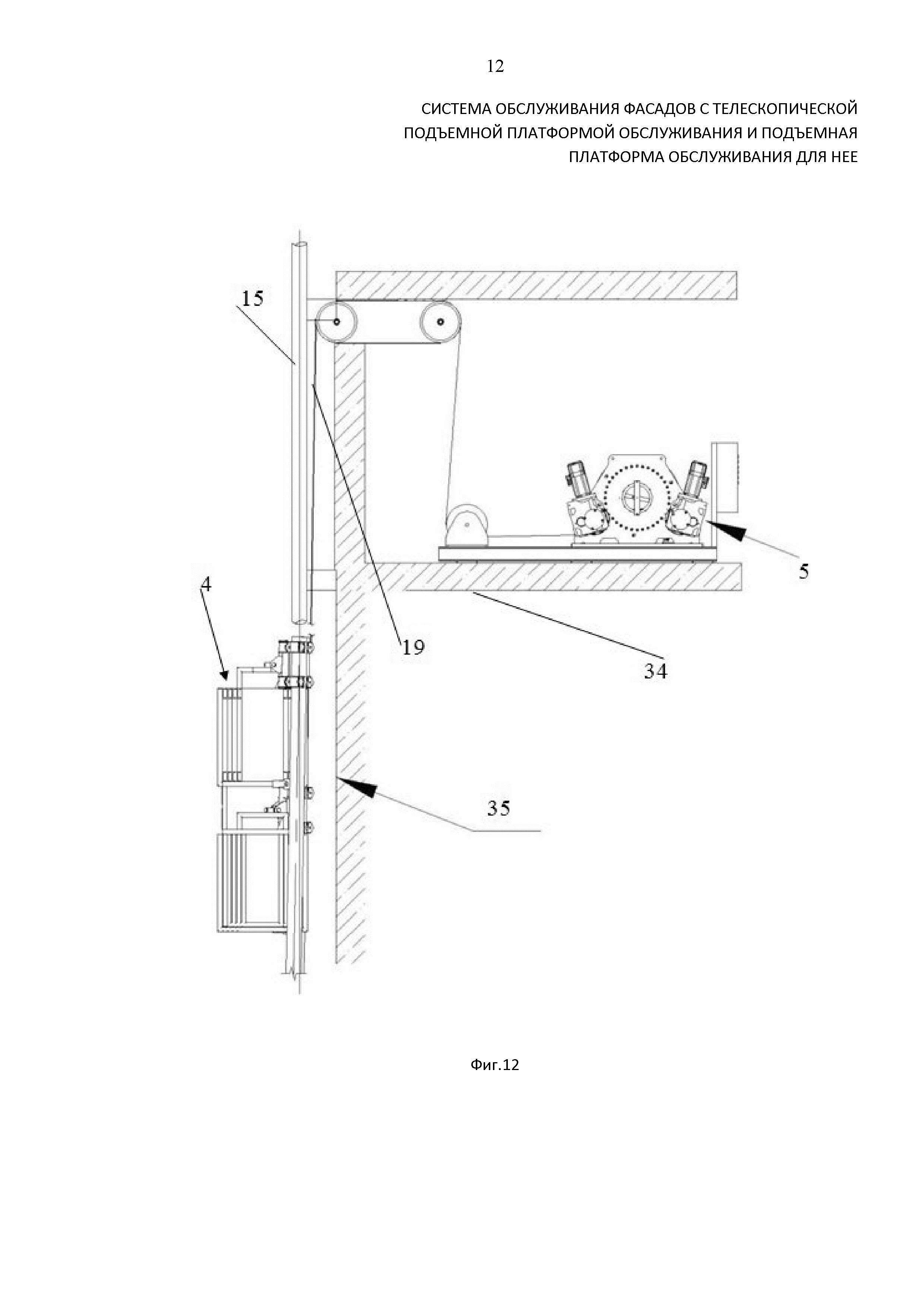 Как следует из представленных фиг. 1-12, система обслуживания фасадов содержит закрепленные на внешней поверхности фасада 1 здания, вдоль его ребер 2, фасадные направляющие 3, повторяющие траекторию ребер, подъемную платформу 4 обслуживания фасада и связанные с ними средства подъема подъемного устройства 5, расположенного на уровне здания 34, над поверхностью обслуживания фасада 35. Подъемная платформа 4 для обслуживания фасада выполнена секционной, содержащей по меньшей мере одну основную 6 секцию и по меньшей мере одну, предпочтительно две и более выдвижные в горизонтальном направлении, телескопические 7 секции, выполненные, например, ферменной конструкции. Каждая секция, включая основную и телескопические, содержит настил 8 по нижнему основанию и ограждающие борта 9 вдоль боковой поверхности. По торцевым сторонам 10 платформы ограждающие борта 9 содержат только концевые 11, телескопическую 7 или основную 6, секции, являющиеся смежными с фасадными направляющими 3, таким образом, что на любом этапе эксплуатации ограждение подъемной платформы 4 выполнено по ее внешнему контуру, а внутреннее пространство платформы не содержит никаких препятствий для перемещения персонала по всей рабочей площади. Настил 8 и/или ограждающие борта 9 по верхнему основанию снабжены линейными направляющими 12 и средствами перемещения телескопических 7 секций вдоль направляющих 12, выполненных в представленных на чертежах вариантах осуществления в виде роликов 14. Линейные направляющие 12 размещены вдоль боковых сторон секций (основной и телескопических), с верхней стороны настила 8, на ширину, не превышающую ширину смежной телескопической секции, размещаемой в сложенном состоянии платформы сверху. При размещении линейных направляющих по верхней кромке поверхности борта, предпочтительно, их размещение вдоль внутренней боковой стороны каркаса, ограничивающего борт секции (фиг. 10, 11). При этом смежные с линейными направляющими ролики или каретки, снабженные роликами, расположены соответственно по нижнему основанию настила или внешней боковой поверхности каркаса борта смежной телескопической секции, перемещаемой вдоль линейных направляющих сверху.