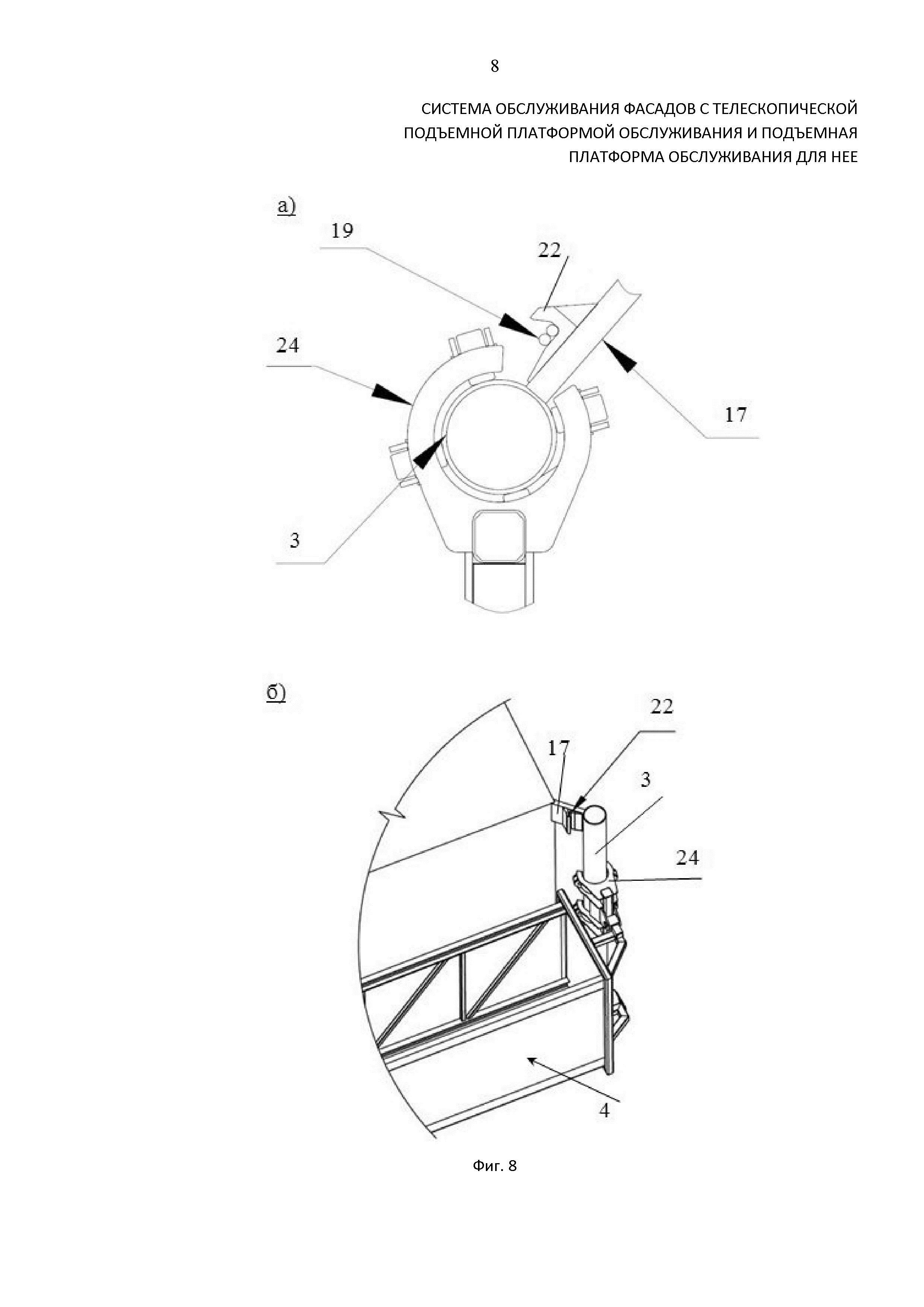 27. Система по любому из пп. 1-26, отличающаяся тем, что подъемная платформа выполнена одноуровневой с размещением телескопических секций с одной из торцевых сторон основной секции, причем со стороны второй торцевой стороны основная секция соединена со смежной ей фасадной направляющей средством крепления.