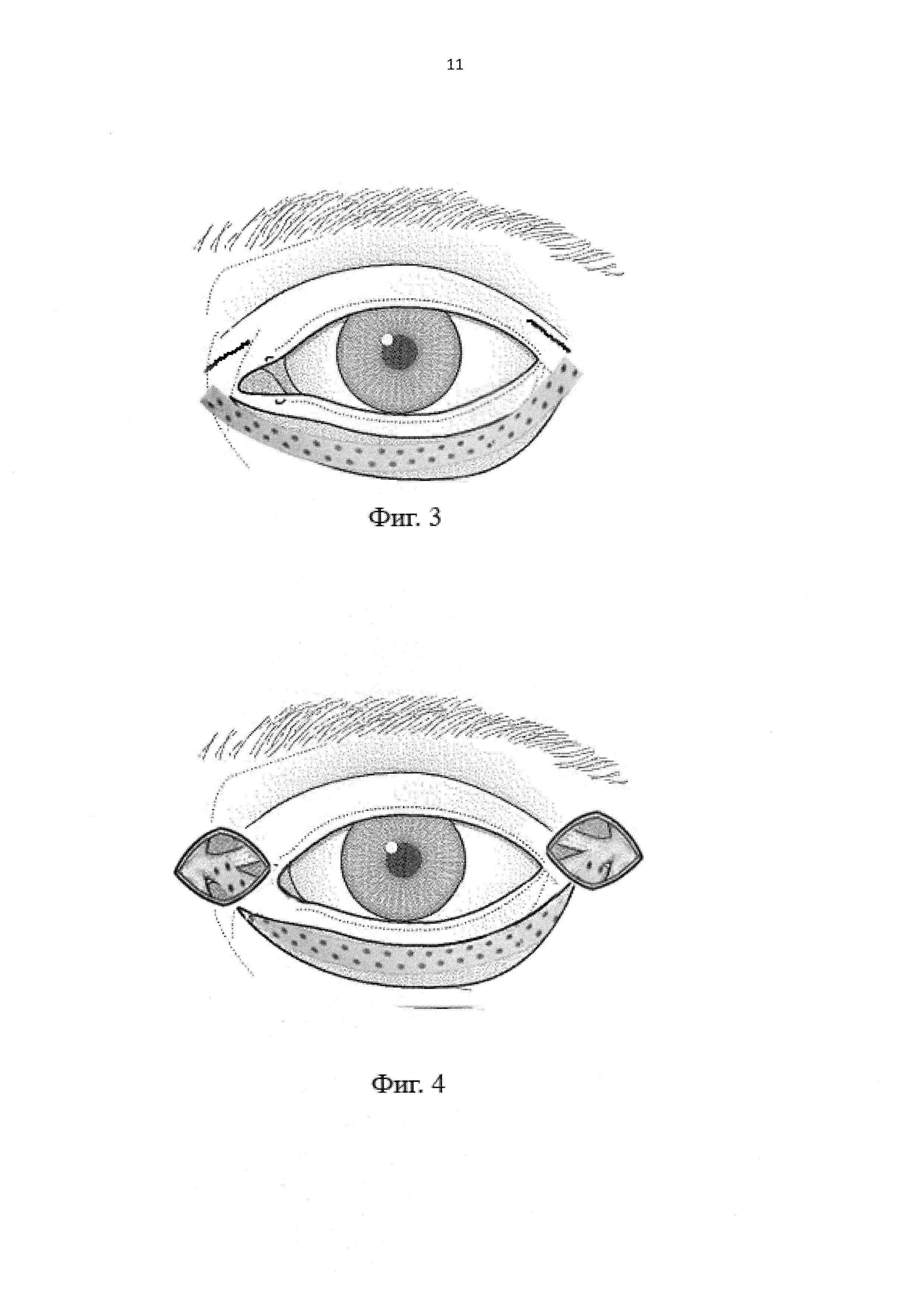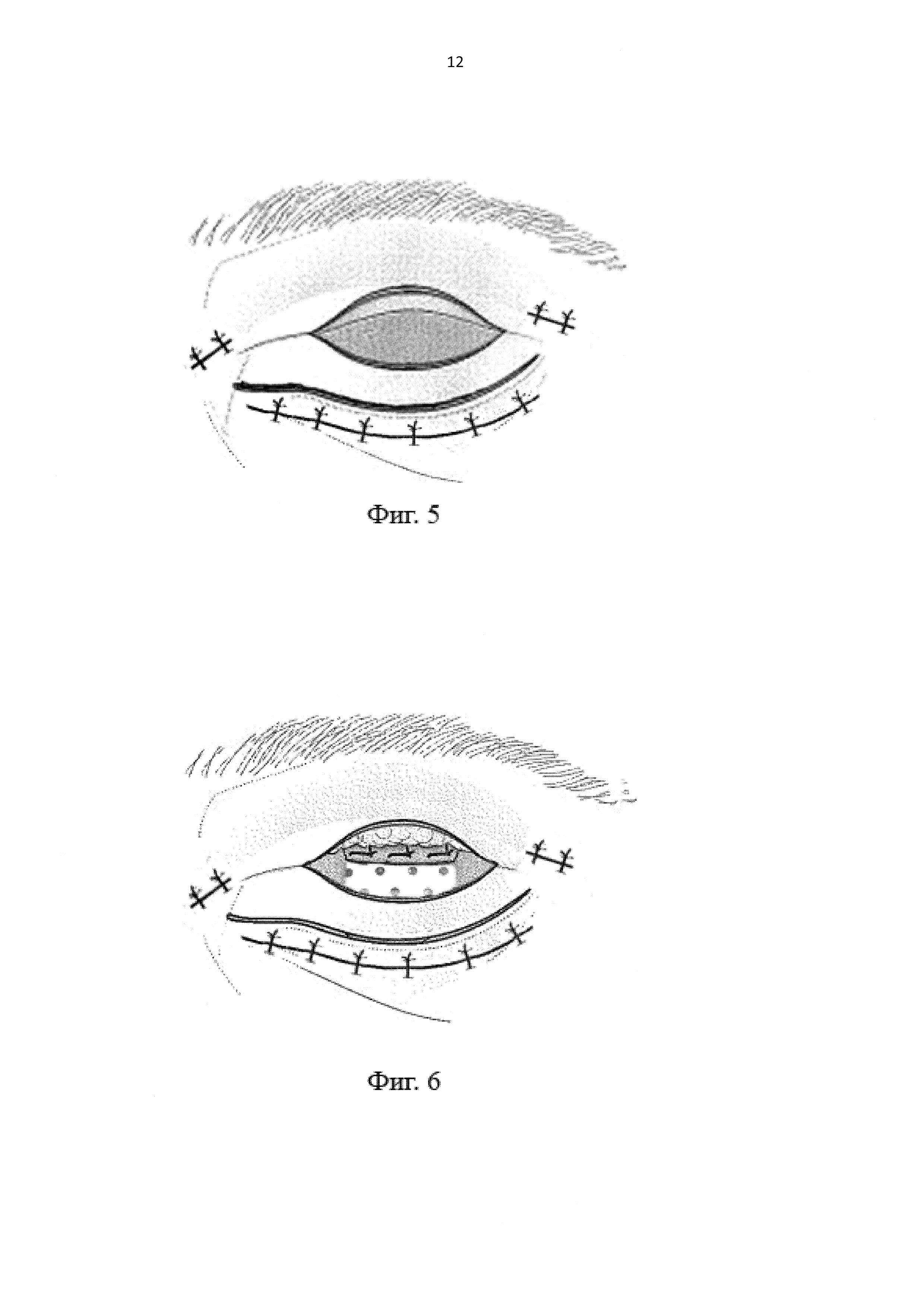 Изобретение относится к медицине, а именно к офтальмологии, и предназначено для хирургического устранения лагофтальма при нарушении иннервации мышц век, слабости и ретракции век. Одним из тяжелых состояний для наиболее чувствительной ткани глаза - роговицы - является паралич век, развивающийся при поражении ветвей лицевого нерва. Для лечения этой тяжелой патологии век предложен ряд методов: инъекция ботулотоксина, медиальная и латеральная канторафия, тарзорафия (полная и частичная), круговое проведение сухожильной и силиконовой нити, фиксация хряща нижнего века к надкостнице орбиты, имплантация грузов в верхнее веко, рецессия леватора, горизонтальное укорочение нижнего века (Филатова И.А. Хирургическое лечение пациентов с паралитическими веками после нейрохирургических операций. 2012). Известен способ устранения лагофтальма, при котором вводят биодеградируемый препарат для инъекционной контурной пластики на основе гиалуроновой кислоты или коллагена общим объемом 0,25-4,0 мл в верхнее и/или нижнее веко под претарзальную часть круговой мышцы и/или внутримышечно, и/или подкожно, и/или для верхнего века кпереди от сухожилия леватора (патент RU 2394538, 20.07.10). Однако данная методика дает кратковременный эффект и после рассасывания препарата (через несколько месяцев) возникает рецидив лагофтальма, кроме того, данные инъекции дорогостостоящие, а выполнять их приходится несколько раз в год. Из хирургических способов широко распространены различные виды блефаро- и тарзорафии (Волков В.В., Бржевский В.В., Ушаков Н.А. Офтальмохирургия с использованием полимеров. СПБ.: Гиппократ, 2003. Катаев М.Г. Выбор способа лечения паралитического лагофтальма. 2010). Применение тарзорафии и блефарорафии возможно в качестве временной или постоянной методики коррекции паралитического лагофтальма. Некровавая блефарорафия чаще выполняется по срочным показаниям как временная мера с целью защиты роговицы при остром процессе (Иванченко Ю.Ф. Хирургическая коррекция лагофтальма при хроническом параличе лицевого нерва: дисс. канд. мед. наук. - М., 2011). Хотя эти операции достаточно эффективны и позволяют значительно снизить проявления экспозиционной кератопатии, основными их недостатками являются травматичность, ограничение поля зрения в некоторых случаях и плохой косметический результат (Филатова И.А. Хирургическое лечение пациентов с паралитическими веками после нейрохирургических операций. Актуальные вопросы нейроофтальмологии. М., 2012 г.; Волков В.В., Бржевский В.В., Ушаков Н.А. Офтальмология с использованием полимеров. - СПБ.: Гиппократ, 2003 г). Довольно часто при паралитическом лагофтальме прибегают к сужению глазной щели с помощью проведения различного типов нитей (силиконовой, аллонити, лески) через верхнее и нижнее веко с фиксацией ее концов в натянутом состоянии. Известен, например, способ устранения лагофтальма, при котором осуществляют вкол иглы-носителя с нитью из полидиаксанона с двунаправленными насечками для тредлифтинга в области наружного края орбиты перпендикулярно поверхности кожи до надкостницы. Проводят иглу-носитель в мягких тканях нижнего века вдоль ресничного края параллельно поверхности кожи и заканчивают продвижение иглы-носителя в проекции слезной борозды. Иглу выводят из тканей, осуществляют лифтинг мягких тканей подглазнич