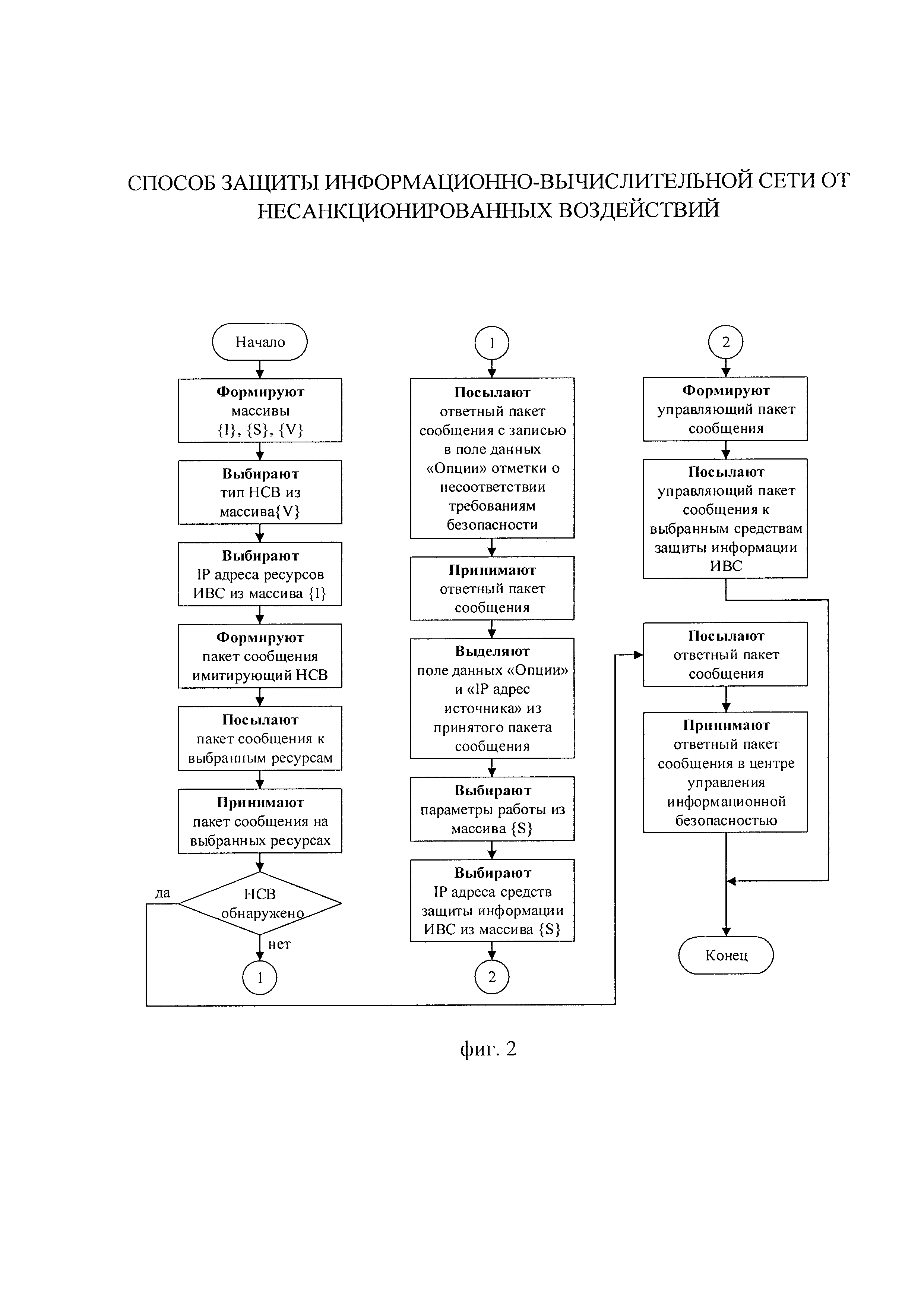 Способ защиты информационно-вычислительной сети (ИВС) от несанкционированных воздействий, заключающийся в том, что предварительно формируют массивы исходных данных, формируют имитационный пакет сообщения, включающий IP адреса элементов ИВС, подлежащих проверке на устойчивость к несанкционированным воздействиям, отправляют сформированный имитационный пакет сообщения в ИВС, принимают в центре управления информационной безопасностью ответный пакет сообщения от соответствующих элементов ИВС, отличающийся тем, что дополнительно в качестве формируемых массивов исходных данных используют массив {I} - «Ресурсы ИВС», массив {S} - «Средства защиты информации ИВС» и массив {V} - «Вид несанкционированных воздействий на ИВС», а в формируемый имитационный пакет сообщения дополнительно включают вид несанкционированного воздействия из массива {V} и IP адреса из массива {I} соответствующих элементов ИВС, подлежащих проверке, причем имитационный пакет сообщения отправляют в ИВС в режиме ее функционирования, в случае необнаруженного несанкционированного воздействия на соответствующих элементах ИВС, после приема от этого элемента в центре управления информационной безопасностью ответного пакета сообщения из него выделяют поля данных «Опции» и «IP адрес источника», затем из массива {S} выбирают параметры работы соответствующего средства защиты информации и его IP адрес, из которых формируют управляющий пакет сообщения и отправляют его в ИВС, а в случае обнаружения несанкционированного воздействия на элементах ИВС отправляют от этого элемента ответный пакет сообщения, который принимают в центре управления информационной безопасностью.