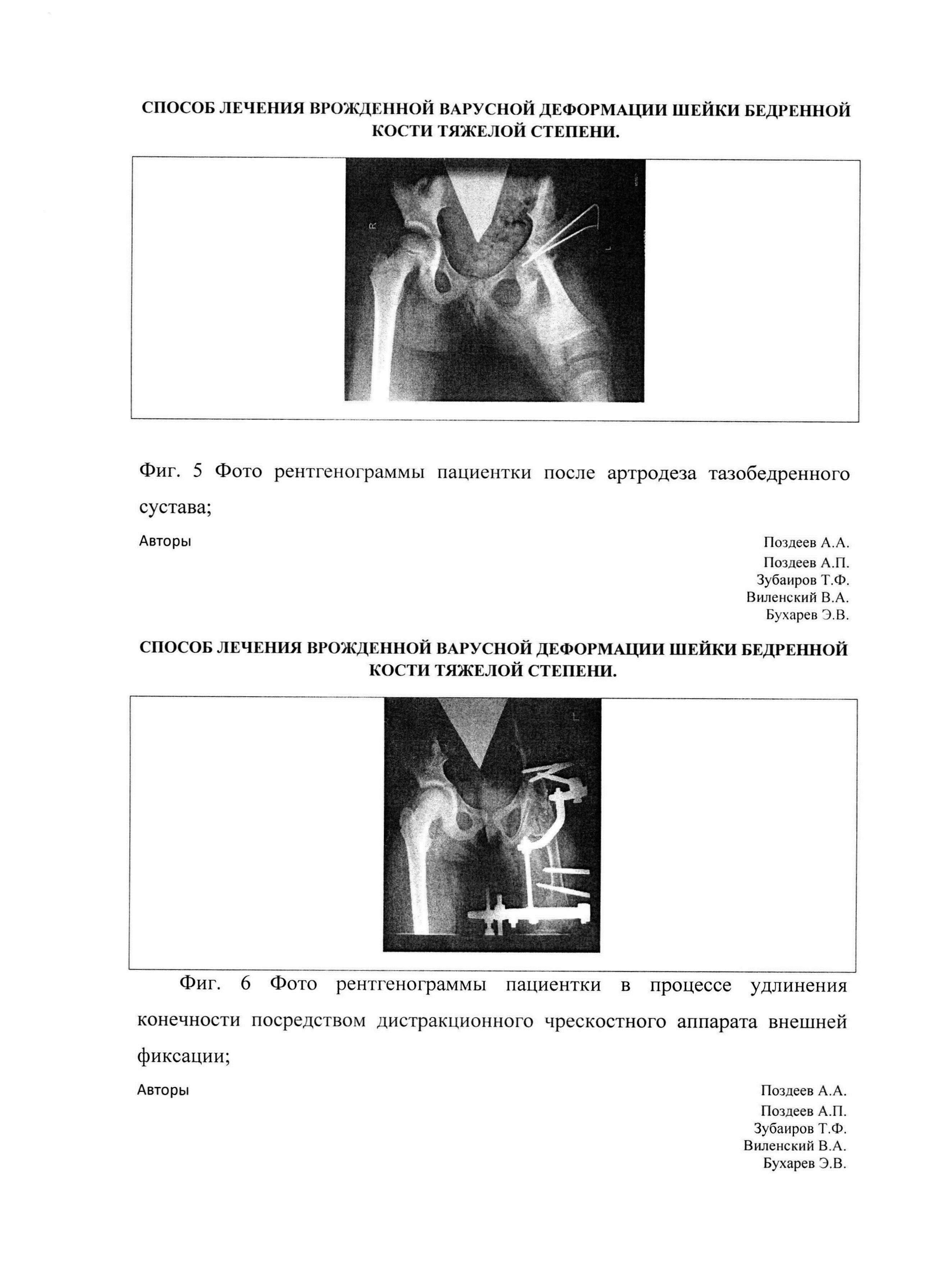Изобретение относится к медицине, а именно к ортопедии. Известен способ лечения врожденной варусной деформации шейки бедренной кости тяжелой степени (ВВДШБКТС) по van Ness [Tachdjian's pediatric orthopaedics/from the Texas Scottish Rite Hospital for Children; edited by John Anthony Herring. - 5th ed., 2014, p. 2965-2986]. Тяжелые формы врожденной варусной деформации шейки бедренной кости, соответствующие IV степени по классификации Aitken [Aitken G: Proximal femoral focal deficiency: A congenital anomaly. In: Aitken GT, ed. A Symposium on Proximal Femoral Focal Deficiency: A Congental Anomaly, Washington, DC: National Academy of Sciences; 1969: 1.] или группы "В" по классификации Hamanishi [Hamanishi С: Congenital short femur: Clinical, genetic and epidemiological comparison of the naturally occurring condition with that caused by thalidomide. J Bone Joint Surg Br 1980; 62: 307], сопровождаются значительным недоразвитием головки, шейки бедренной кости, отрицательным шеечно-диафизарным углом и выраженным укорочением бедренной кости (на 20 см и более). Данный способ лечения заключается в том, что выполняется разворот голени на уровне коленного сустава на 180 градусов и артродезирование коленного сустава в достигнутом положении. При этом стопа оказывается обращенной пальцами назад, а пяткой вперед. Суть метода - подготовка конечности к экзопротезированию. При данном варианте лечения голеностопный сустав берет на себя функцию коленного сустава, а врожденно укороченное бедро единым блоком с нормально развитой голенью формируют опорную культю бедра, что создает благоприятные условия для экзопротезирования. Данный способ на сегодняшний день является единственным вариантом лечения детей с указанной патологией. Недостатками способа следующие: - Пациент обречен всю жизнь использовать при ходьбе экзопротез. - Косметический дефект (уродство) нижней конечности, является зачастую причиной психологической травмы у детей. - При выполнении артродеза коленного сустава увеличивается укорочение конечности. - Неправильные взаимоотношения в области тазобедренного сустава приводят к порочному положению нижней конечности (формируется сгибательно-приводящая контрактура), что в дальнейшем вызывает хромоту и болевой синдром. Задачей предлагаемого изобретения является повышение эффективности оперативного лечения путем последовательного лечения, состоящего из низведения бедренной кости, создания артродеза тазобедренного сустава и удлинения конечности на уровне состоявшегося артродеза методами чрескостного остеосинтеза. Технический результат поставленной задачи достигается тем, что способ лечения ВВДШБКТС включает низведение бедренной кости с помощью дистракционного чрескостного аппарата внешней фиксации, артродез тазобедренного сустава, а после достижения консолидации в области артродеза производят остеотомию таза и удлинение конечности посредством дистракционного чрескостного аппарата внешней фиксации. На фиг. 1 представлена схема низведения бедренной кости с помощью дистракционного чрескостного аппарата внешней фиксации. На фиг. 2 представлена схема артродезирования тазобедренного сустава. На фиг. 3 представлена схема удлинения конечности посредством дистракционного чрескостного аппарата внешней фиксации на уровне артродеза. На фиг. 4 представлены фото рентгенограммы пациентки до лечения. На фиг. 5 представлены фото рентгенограммы пациентки после артродеза тазобедренного сустава. На фиг. 6 представлены фото рентгенограммы пациентки в процессе удлинения конечности