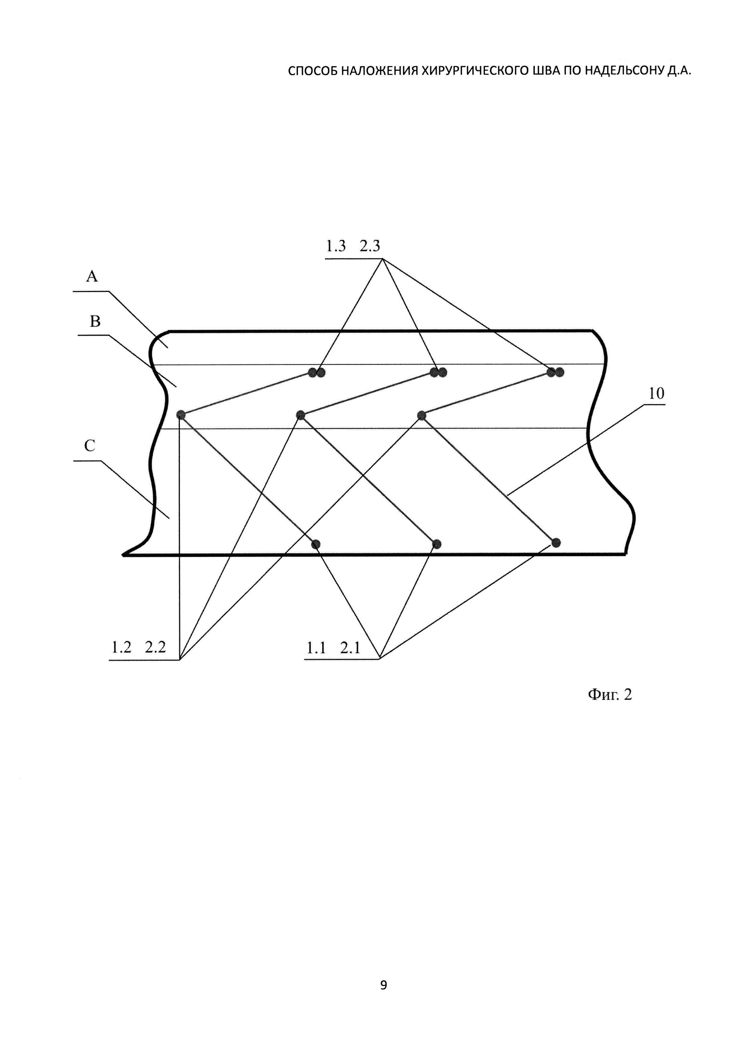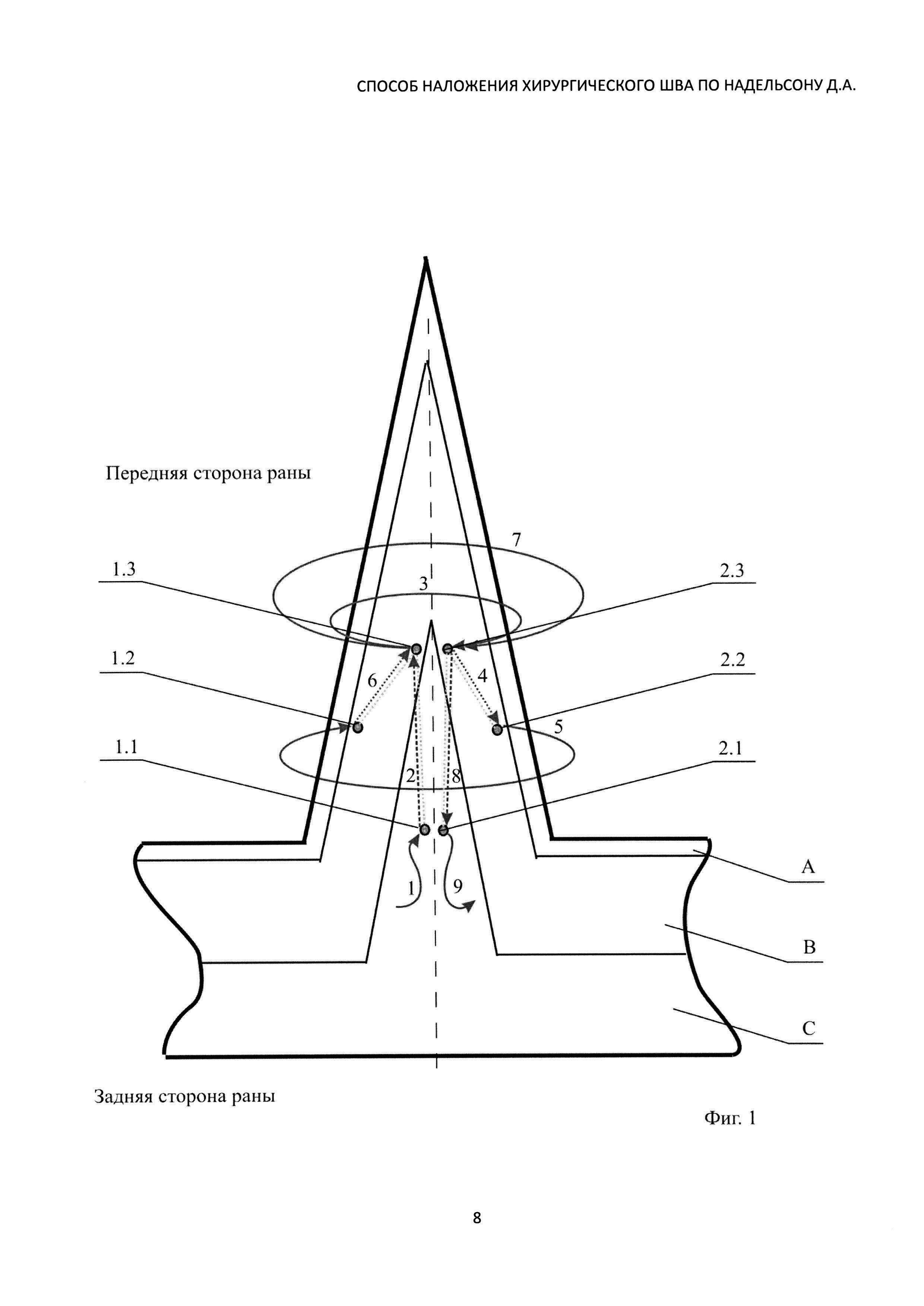 Способ наложения хирургического шва, включающий проведение нити через кожу и подкожно-жировую клетчатку обоих краев раны с образованием поперечного стежка, завязывание концов нитей узлом, отличающийся тем, что после вкола иглы (1) в слой гиподермы одного края раны проводят иглу косовертикально (2) с выходом через низ дермы той же стороны вблизи границы гиподермы, переходят (3) на другую сторону раны, здесь через вкол на одноименном уровне проводят иглу косовертикально (4) в обратном направлении снизу вверх с выходом иглы через дермы этой стороны вблизи границы эпидермиса, далее производят переход (5) на другую сторону, через вкол (6) вблизи границы эпидермиса, затем проводят иглу внутри дермы косовертикально сверху вниз с выходом в месте уже имеющегося прокола, переходят на другую сторону, образуя (7) второй стежок, через вкол в месте уже имеющегося прокола вблизи границы гиподермы проводят иглу в косонисходящем (8) к первому вколу направлении сверху вниз с выходом иглы (9) через глубокий слой гиподермы, после чего завязывают последовательно три двойных узла, адаптируя края раны.