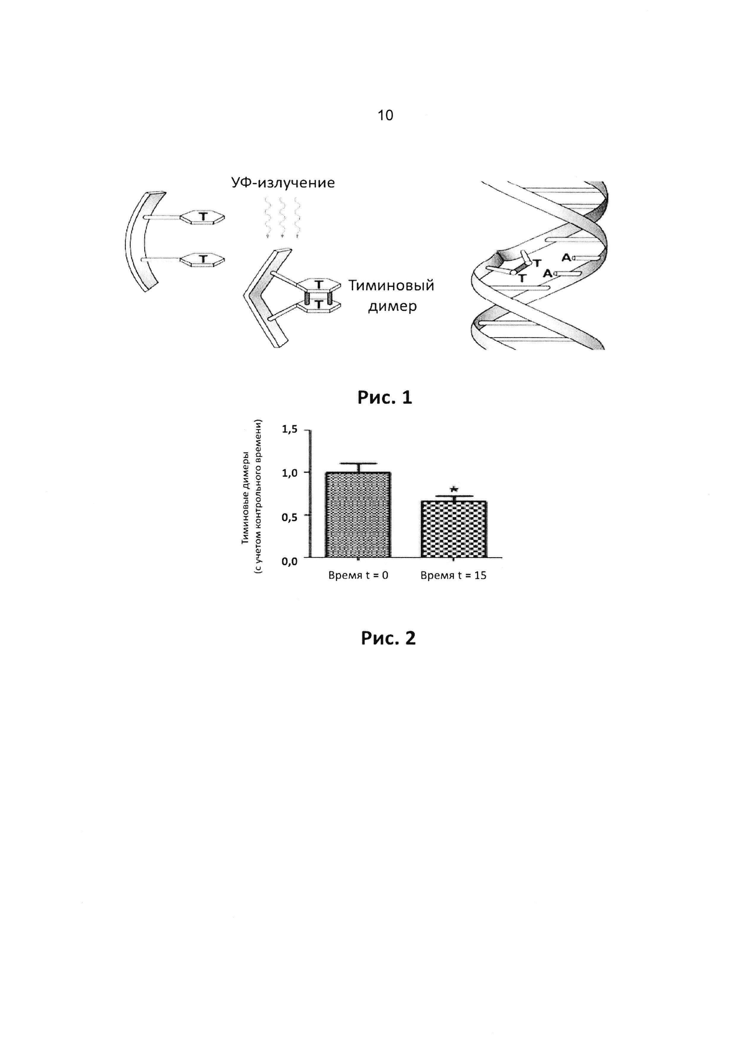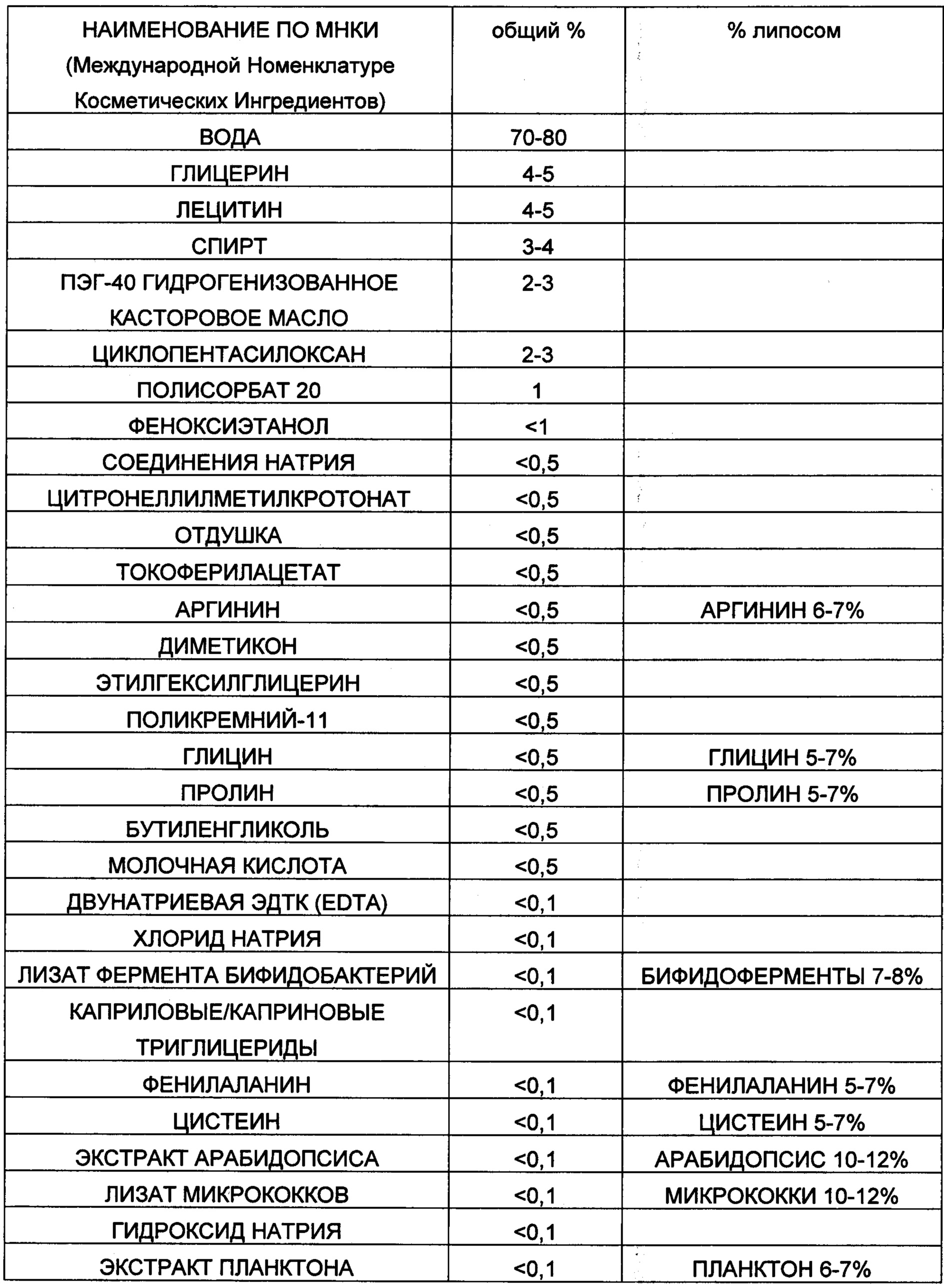 1. Косметический продукт со свойствами репарации ДНК клеток кожи, содержащий: - активный ингредиент, состоящий из набора липосом, в которых содержатся репаративные ферменты, такие как арабидопсис, экстракт планктона, лизат фермента бифидобактерий, лизат микрококков; - второй активный ингредиент, состоящий из набора липосом, инкорпорирующих такие аминокислоты, как аргинин, глицин, пролин, фенилаланин, цистеин, серии, тирозин, глютамин, или метионин; - третий активный ингредиент - соль цинка, также инкапсулированная в липосомы. 2. Косметический продукт, обладающий свойствами репарации ДНК клеток кожи, согласно п. 1 характеризуется тем, что в липосомы инкапсулируют отдельно аминокислоты, репаративные ферменты и соль цинка. 3. Косметический продукт, обладающий свойствами репарации ДНК клеток кожи, согласно п. 1 характеризуется тем, что в состав набора липосом входит фосфатидилхолин с чистотой более 94%. 4. Косметический продукт, обладающий свойствами репарации ДНК клеток кожи, согласно п. 1 характеризуется процентным содержанием липосом с инкорпорированными аминокислотами, составляющими от 5 до 10%. 5. Косметический продукт, обладающий свойствами репарации ДНК клеток кожи, согласно п. 1 характеризуется процентным содержанием соли цинка, составляющим от 10 до 15%.