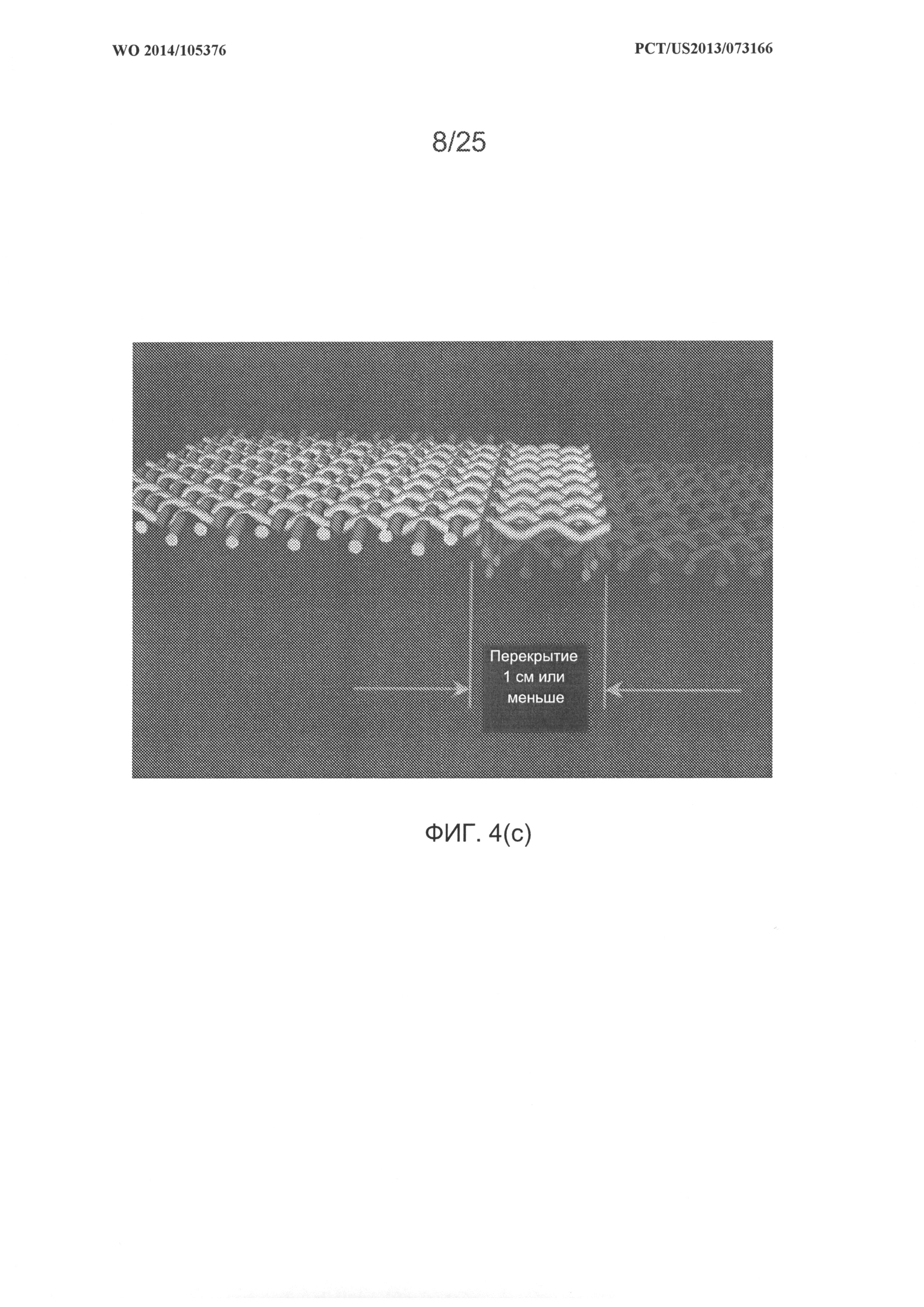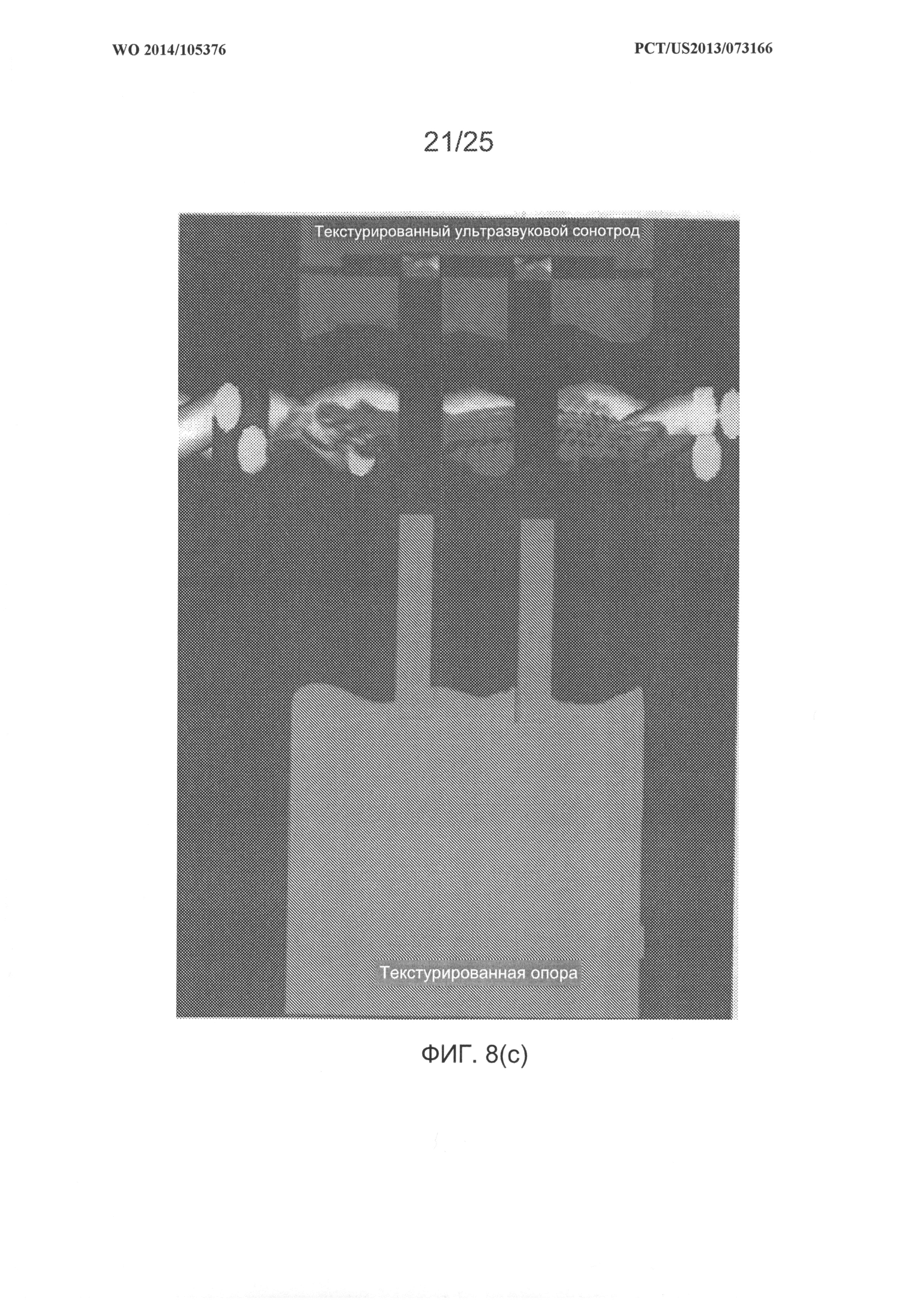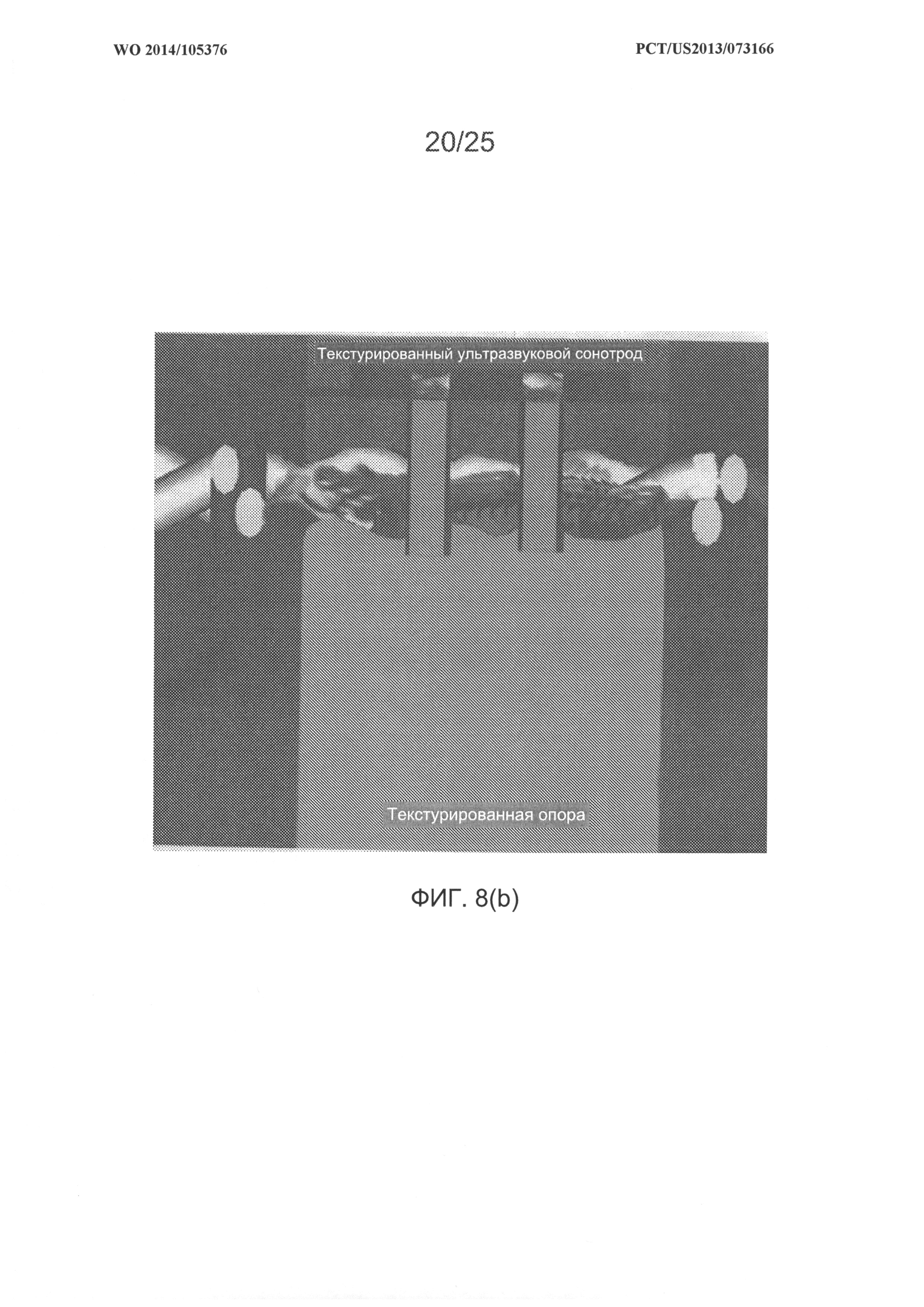 Согласно фиг. 2(с) сонотрод имеет гладкую поверхность на лицевой стороне выпуклой области, которая будет приводить в результате к образованию сварного шва ткани с гладкой сглаженной областью. Однако, если требуется сохранение исходной топографии или формы нитей, то может быть использована текстурированная выпуклая область. Этот способ является способом достижения сварного шва регулируемой глубины с увеличенным временем сварки без использования механического ограничителя. Этот способ также мог быть использован в случаях, в которых неприменим механический ограничитель.