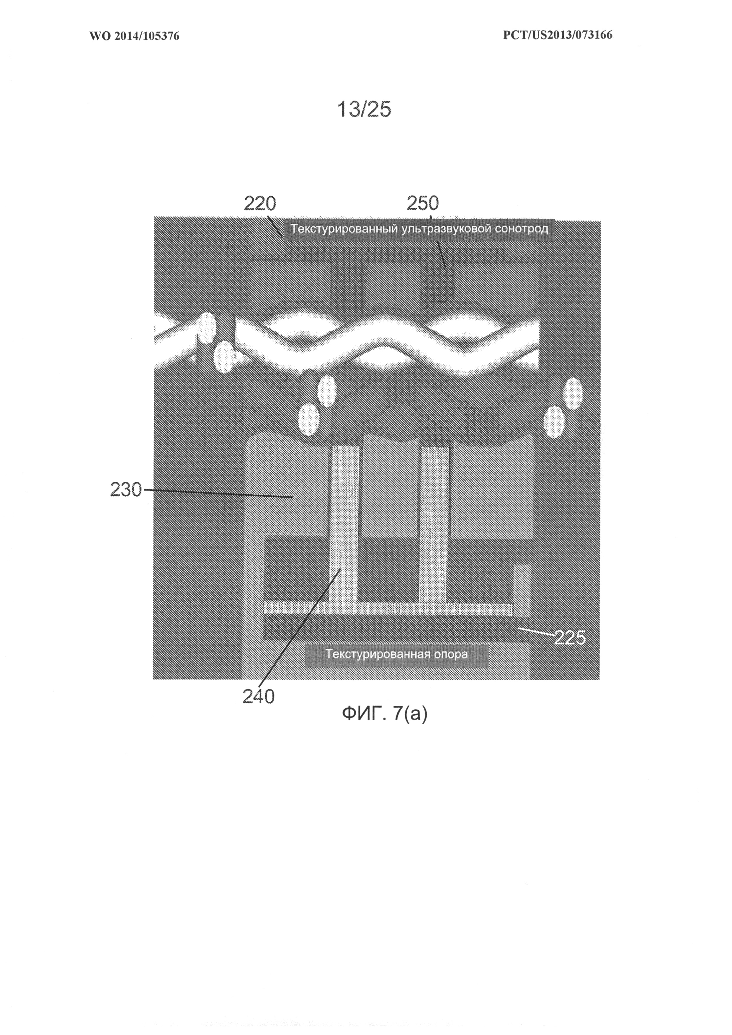 Согласно одному варианту реализации в течение выдержки механическая сила (кулачок, тяга или давление воздуха) вызывает прохождение ряда штампов или выступов 240 (плоские, заостренные, цилиндрические, прямоугольные и т.д.), которые встроены в любом сонотроде 220 или опоре 230, наружу, через ткань и в штамп на противоположной части 250, как, например, показано на фиг. 7(а). При этом выступы 240 сжимают небольшую часть материала 218 между противостоящими выступами, которые могут контактировать или не контактировать друг с другом при сведении сонотрода и опоры, когда сфокусированная ультразвуковая энергия быстро расплавляет материал 218 и вызывает вытекание указанного материала из зоны между выступами, оставляя отверстие или полость 224 непосредственно в ткани 260, как показано, например, на фиг. 7(f). Согласно фиг. 7(b)-(d) такие штампы были бы расположены в соответствии с рисунком текстурирующей опоры, то есть созданные отверстия расположены в тех местах, в которых были бы расположены проницаемые каналы в несваренной ткани. Другая возможность состоит в том, что материал 218, оказавшийся между выступами, может расплавиться не полностью, и может остаться тонкая пленка. В этом случае некоторая другая энергия (сжатый воздух, химически растворение, лазерная энергия) может быть использована для удаления пленки на более позднем этапе, как показано, например на фиг. 7(е).