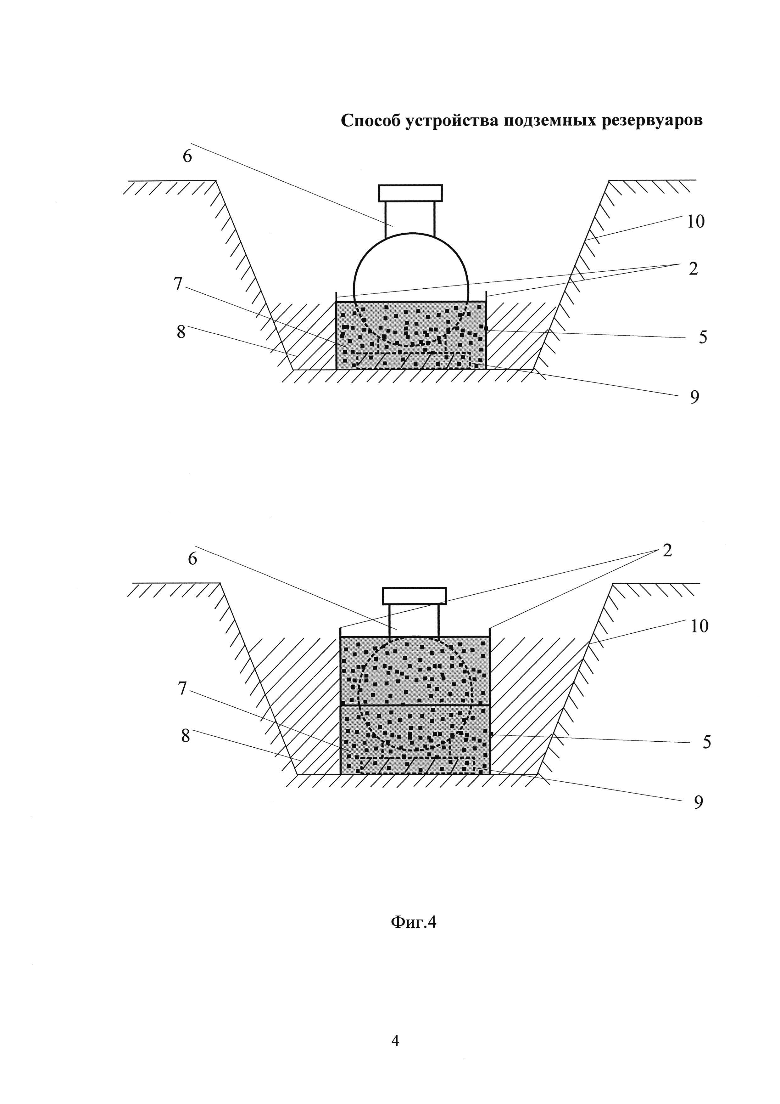 Изобретение относится к строительству, а именно к устройству подземных резервуаров, преимущественно для хранения сжиженных газов. Способ устройства подземных резервуаров заключается в рытье котлована под резервуар, установке фундамента, установке резервуара в котлован и креплении его к фундаменту, испытании смонтированного резервуара, размещении на дне котлована вокруг резервуара сборной перемещаемой опалубки, снабженной элементами для захвата и перемещения опалубки в верхней части и засыпке пространства между резервуаром и котлованом. Опалубка является сборной, выполненной из набора боковых и торцевых элементов, а засыпку осуществляют послойным заполнением пространства между опалубкой и резервуаром - песком, а между опалубкой и котлованом - грунтом с последующей их трамбовкой каждого слоя. Затем производят повторное заполнение опалубки песком и котлована грунтом после перемещения опалубки вверх, вдоль резервуара до полной засыпки котлована и извлечения опалубки. Технический результат состоит в повышении экономичности монтажа резервуара за счет применения сборной опалубки, снижении трудоемкости, снижении расхода песка. 3 з.п. ф-лы, 4 ил.