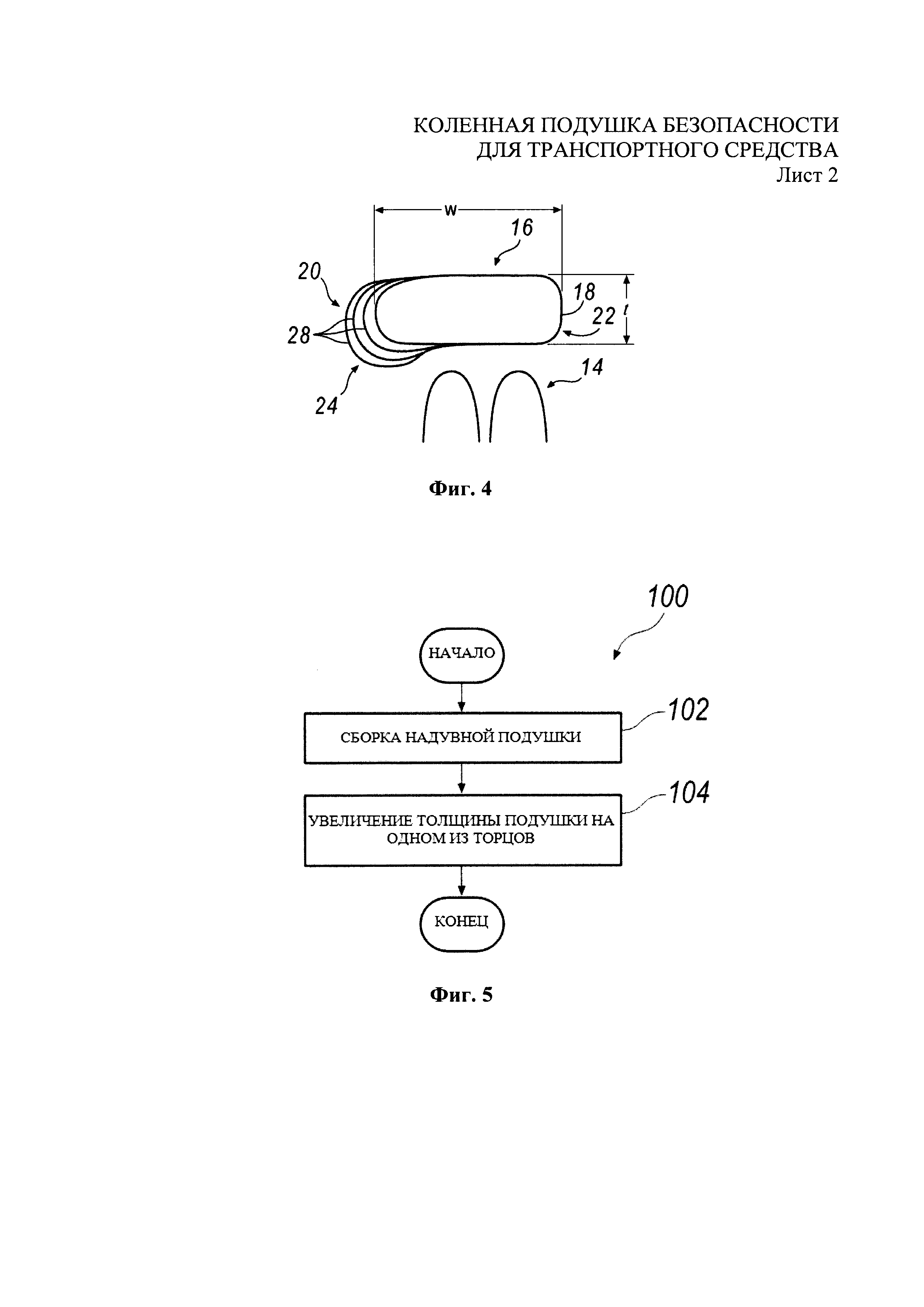 На Фиг. 5 представлен процесс 100 изготовления коленной подушки 16 безопасности. На этапе 102 процесс 100 может включать в себя сборку надувной подушки 18, включая вставку по меньшей мере одного ограничителя 26 внутрь подушки 18 таким образом, чтобы он проходил главным образом в поперечном направлении от первого торца 20 до второго торца 22. Воздушная подушка 18 может быть надута так, что она при раскрытии приобретает некоторую толщину t1, как было сказано выше. На этапе 104 процесс 100 может включать в себя увеличение толщины надувной подушки 18 на одном из торцов 20 или 22. В одном варианте это можно осуществить путем расположения по меньшей мере одного ограничителя 26 со смещением от центра в сторону противоположного торца 22 или 20 надувной подушки 18. Альтернативно или дополнительно увеличение толщины на одном торце 20 или 22 может заключаться в закреплении хотя бы одной панели 28 по меньшей мере на участке наружной поверхности надувной подушки 18 на данном торце 20 или 22. Панель обычно имеет определенную толщину. Это можно осуществить путем пришивания хотя бы одной панели 28 к надувной подушке 18. Кроме того, по меньшей мере одна панель 28 может охватывать лишь часть длины надувной подушки 18 или всю ее длину, как было сказано выше. После этапа 104 процесс 100 завершается.