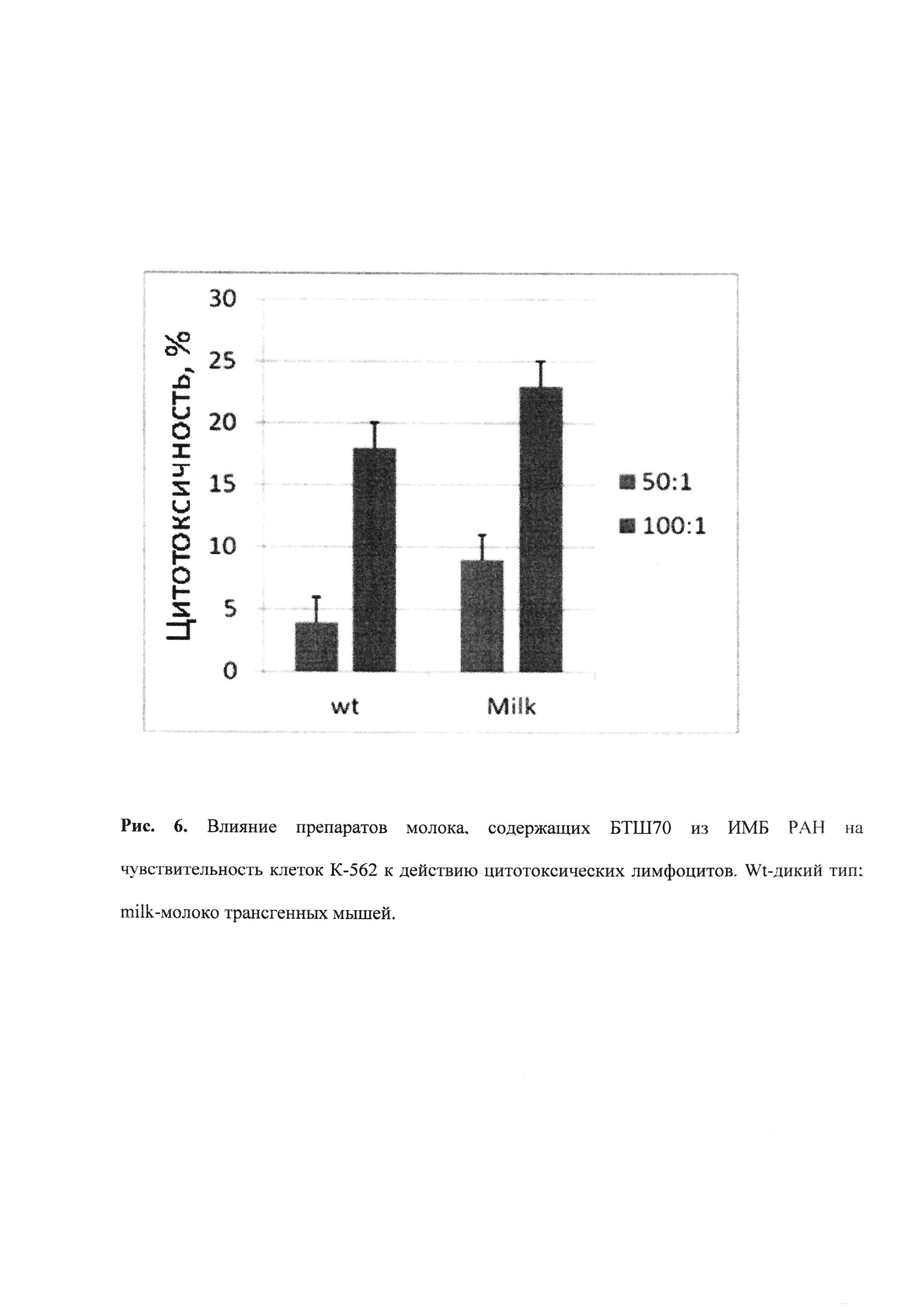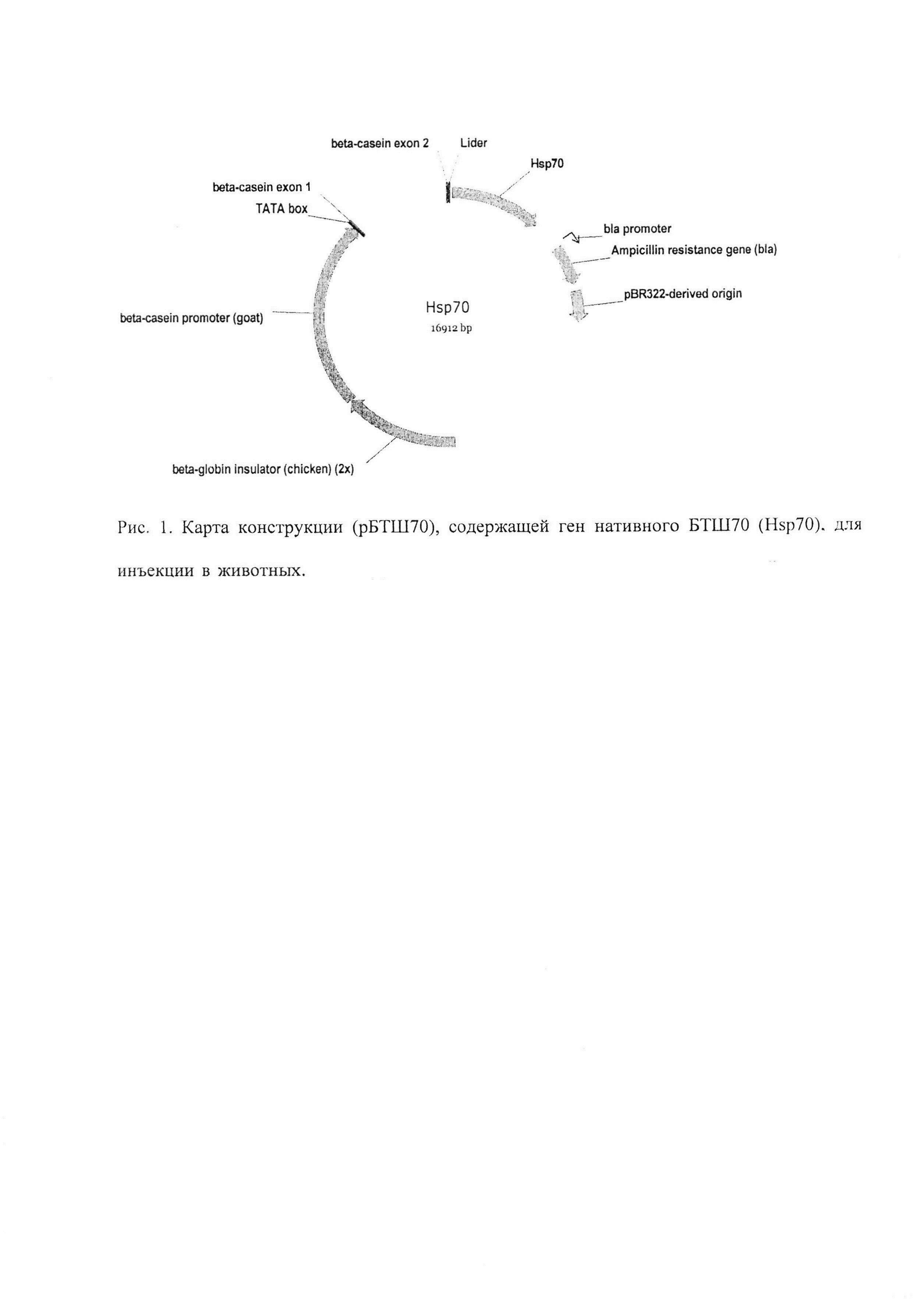 Область техники Изобретение относится к биотехнологии, молекулярной биофармакологии и может быть использовано для получения биологически активного белка теплового шока 70 (БТШ70) с использованием генно-инженерно модифицированных животных в качестве биореакторов. Белки теплового шока 70 играют важнейшую роль в развитии организма млекопитающих в нормальных условиях и при различных стрессовых воздействиях, и в перспективе могут быть использованы в качестве терапевтического средства для лечения некоторых форм нейродегенеративных заболеваний человека, связанных с неправильным синтезом и укладкой белков («протеинопатии»), а также при сепсисе (1, 2). Поэтому наработка эукариотического БТШ70 в количествах, достаточных для дальнейшего применения в терапии, является важной задачей. Белки теплового шока играют важную роль для обеспечения гомеостаза организма на всех стадиях его развития, особенно в случае воздействия стресса, токсинов, радиации, сублетальной температуры, ацидоза, гипоксии или гипероксии, энергетического истощения клетки, а также при старении и микробных инфекциях. Уровень техники В настоящее время достаточно подробно изучены основные функции внутриклеточных стрессовых белков, которые обычно называют белками теплового шока (БТШ), связанные с участием этих молекул в процессах синтеза, фолдинга, транспорта, репарации внутриклеточных протеинов (шаперонные функции) и их важной ролью в системе защиты клеток от повреждающих воздействий внешней среды (протективные функции). Особо важную роль в гомеостазе клетки в норме и при различных вредных воздействиях играет древнее и весьма консервативное семейство белков теплового шока с молекулярной массой 70 килодальтон (БТШ70). В настоящее время известно более 10 представителей БТШ70 эукариот. Описаны также бактериальные ортологи БТШ70 (3). Структура и функции БТШ70 в настоящее время хорошо изучены. У этого семейства белков аминоконцевая часть молекулы содержит консервативный АТФазный домен (44 кДа), а в карбокситерминальной части молекулы локализован субстрат-связывающий домен (~25 кДа), необходимый для узнавания и связывания БТШ70 с полипептидами. Эти домены необходимы для эффективного связывания и транспортировки самых различных клеточных белков в норме и при различных патологиях. Основными функциями белков семейства БТШ70 являются повышение клеточной термотолерантности к целому спектру повреждающих факторов, включая тепловой шок, гипоксию и пр. БТШ70 участвует в ренатурации и поддержании целостности структуры клеточных белков и обладает выраженным антиапоптотическим действием. Помимо этого он участвует в деградации белков с нарушенной структурой, препятствует образованию белковых агрегатов внутри клетки, а также играет важную роль в процессах ассоциации-диссоциации белков, а также их транслокации через мембраны внутриклеточных компартментов и органелл (4, 5). Важнейшими функциями БТШ70 являются способность этих белков предотвращать образование агрегатов поврежденных и/или денатурированных белков, а также способность выступать в роли носителей иммуногенных пептидов. В частности, зарегистрирована поверхностная локализация БТШ70 у ряда линий опухолевых клеток, у вирус-инфицированных лимфоцитов, у активированных макрофагов и Т-лимфоцитов, а также обнаружено с