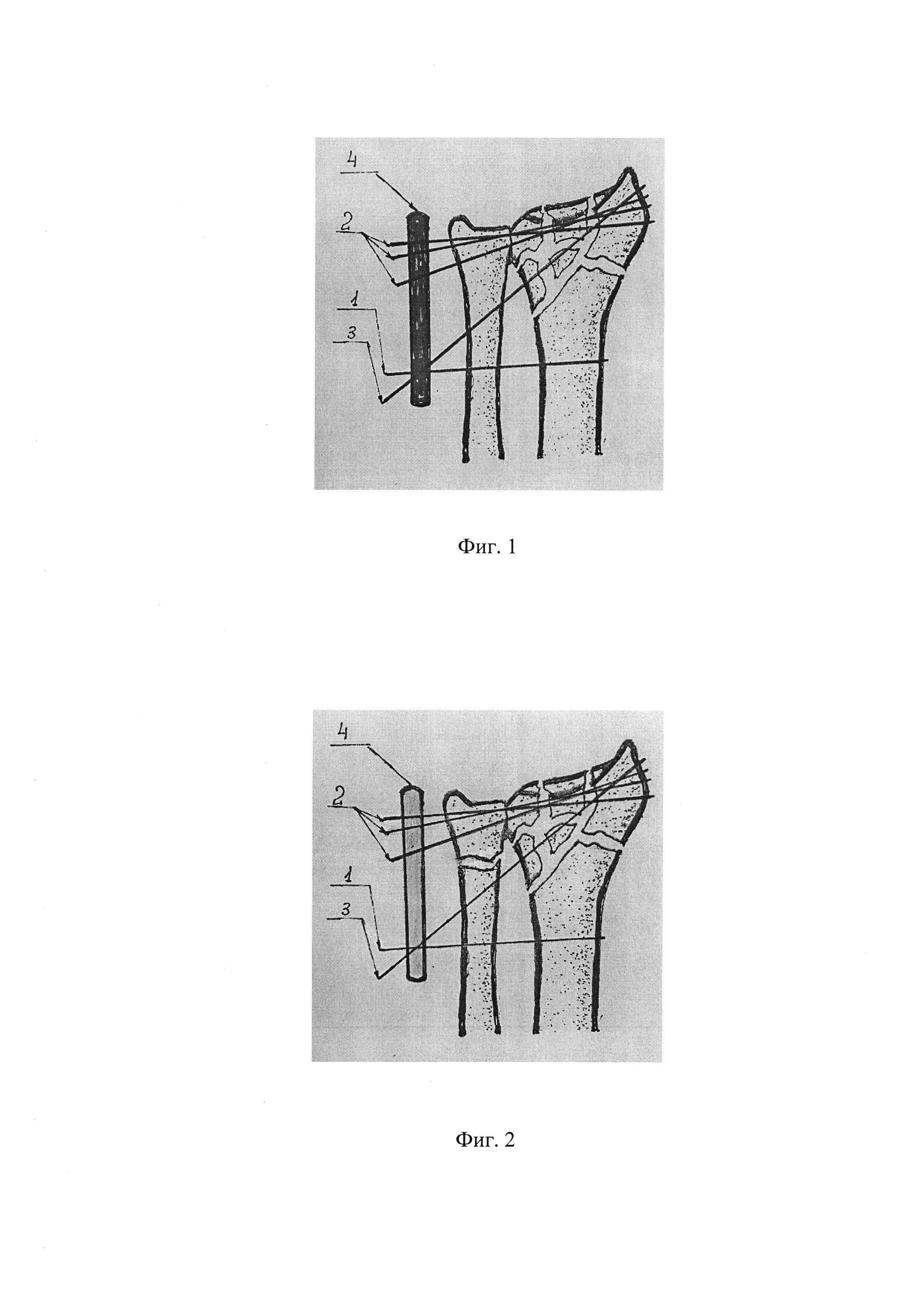 Осуществление способа показано на Фиг. 1 при переломе лучевой кости и на Фиг. 2 в случае переломов обеих костей предплечья.