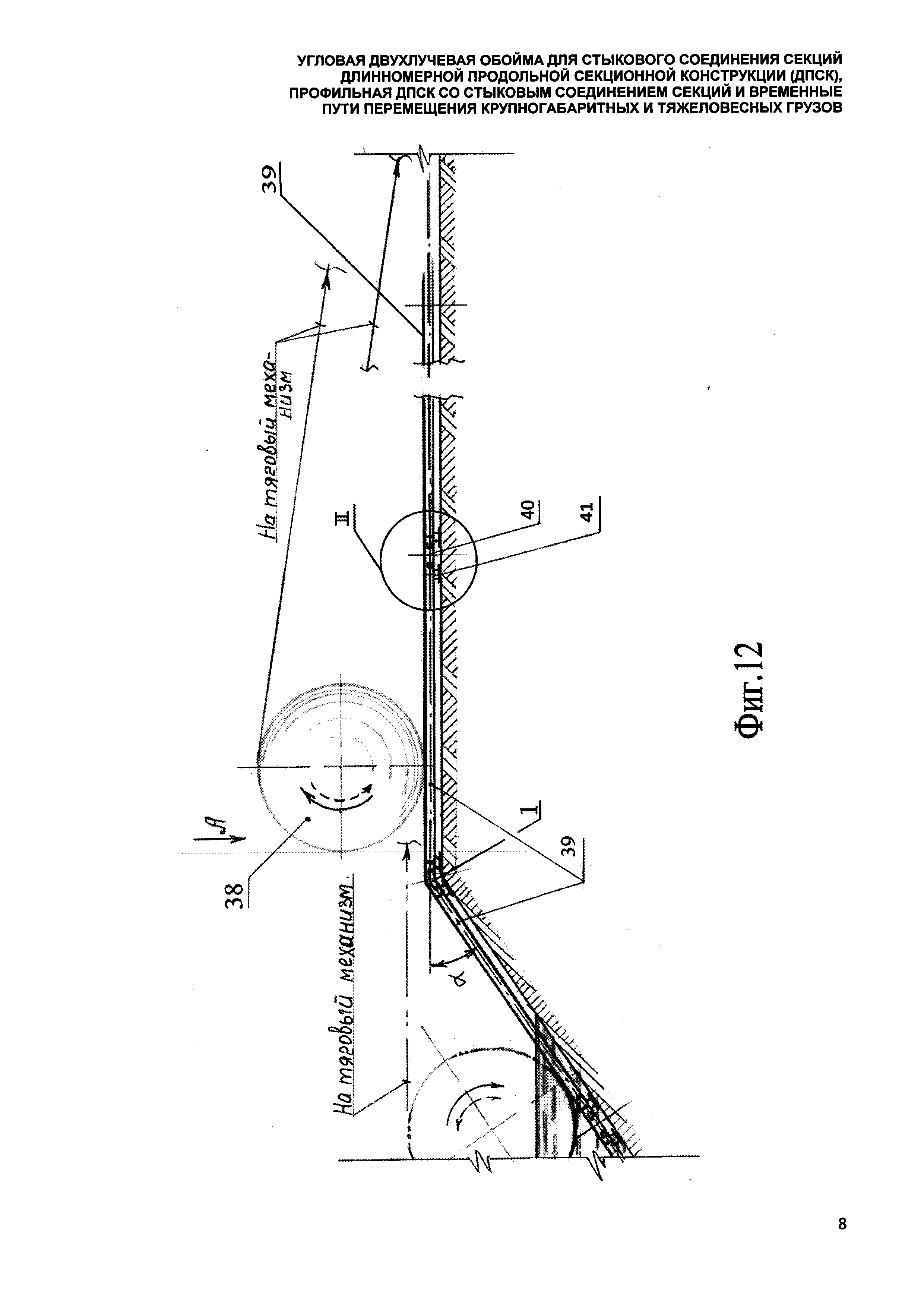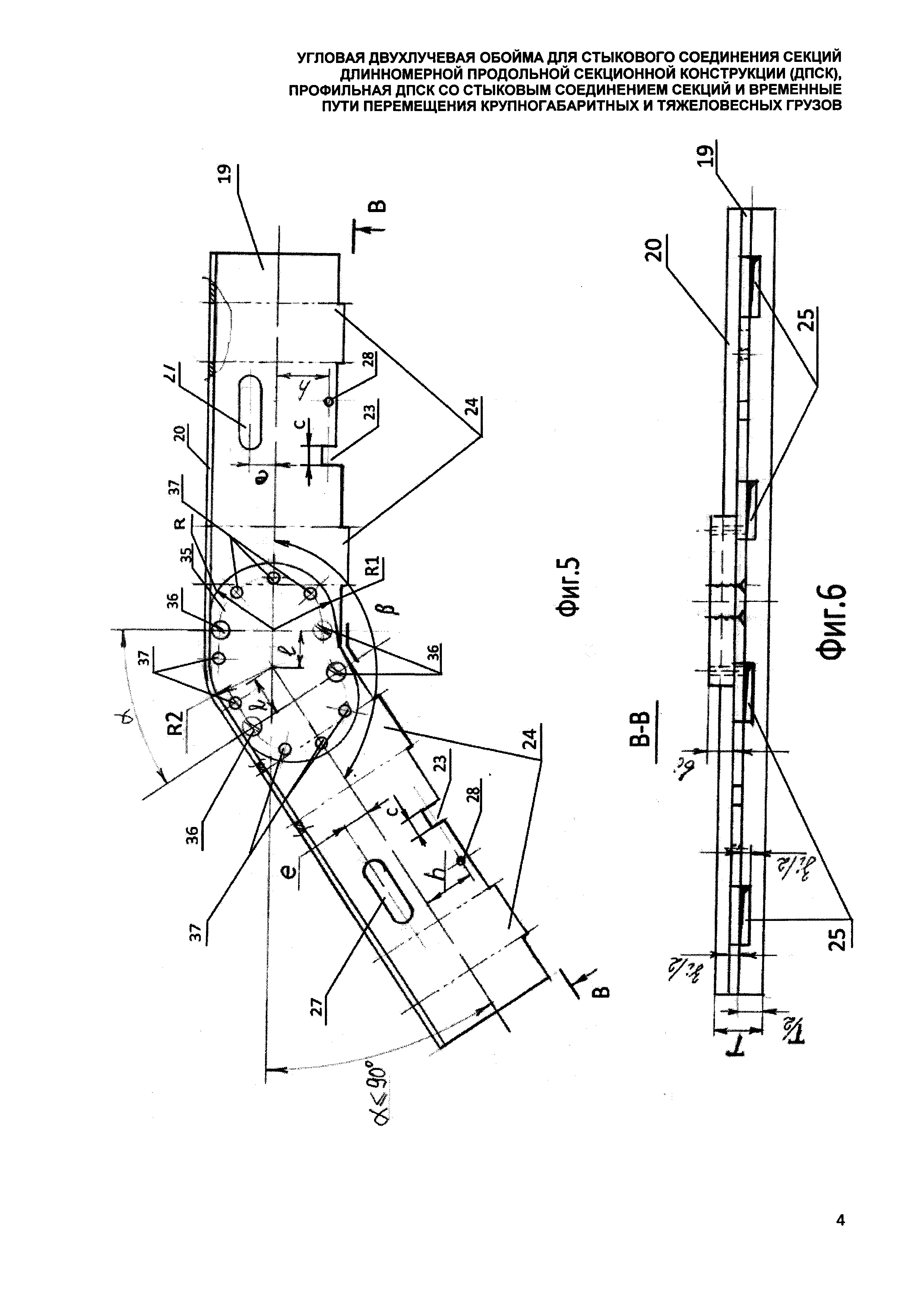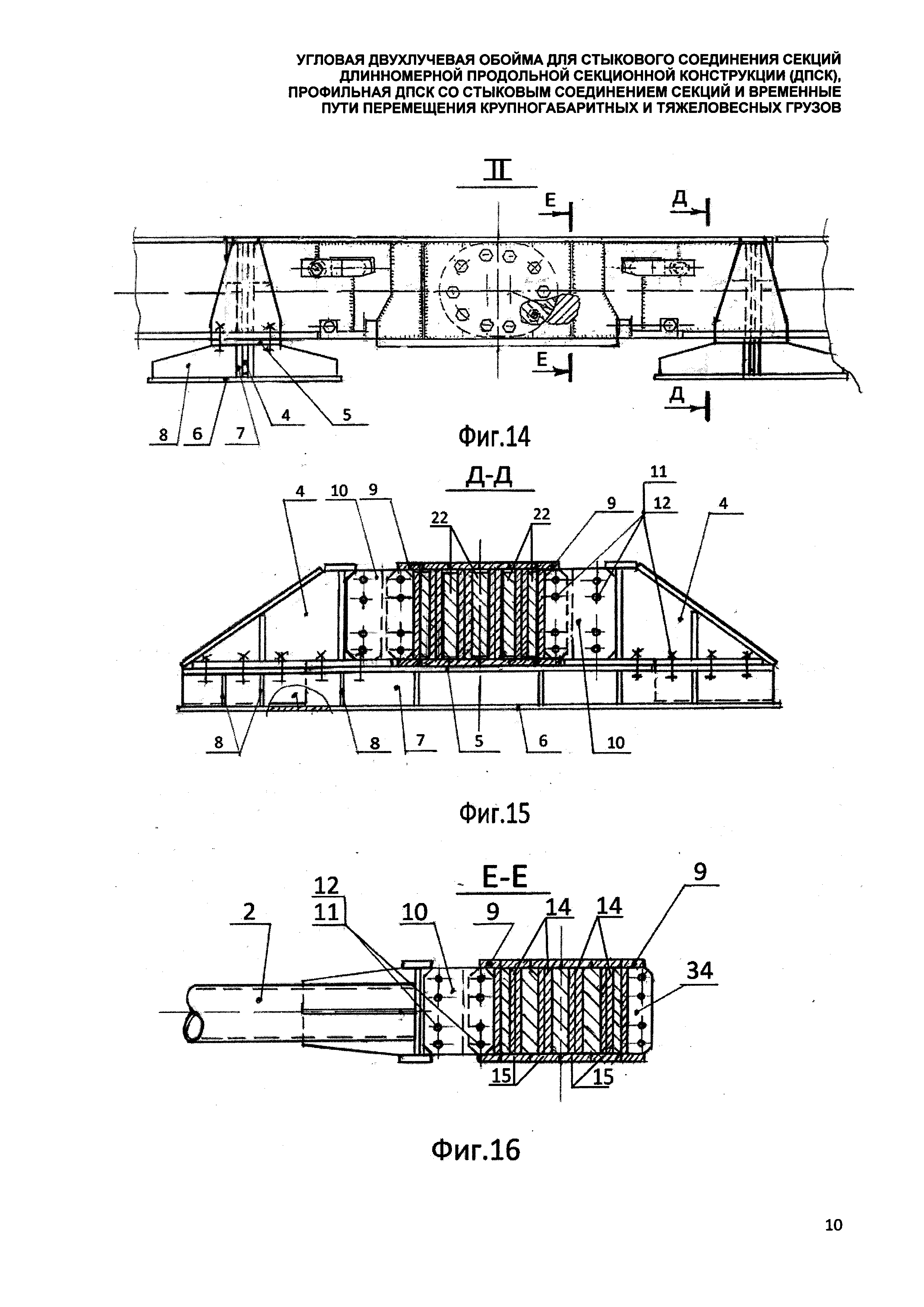 Настоящее изобретение относится к машиностроению, а именно к длинномерной продольной секционной конструкции (далее - ДПСК) и устройству для стыкового соединения секций ДПСК - угловой двухлучевой обойме (УДО). Единый технический результат состоит в возможности создания профильных участков ДПСК и достигается за счет того, что в ДПСК, состоящей из двух и более параллельно расположенных продольных элементов, имеющих каждый, по меньшей мере, одну пару стыкуемых секций, последние соединены между собой и объединены с соответствующими стыкуемыми секциями соседнего продольного элемента, образуя пару смежных секций ДПСК, с помощью УДО, состоящей из набора связей, включающего выполненные в форме тавра внутренние связи, каждая пара из которых образует стыковочный узел, и две наружные силовые связи (НСС), выполненные, каждая, в виде швеллера и снабженные маячковыми накладками, где в средней части пластины ребра ВУС и пластины ребра НСС со стороны, обращенной к оконечностям пары стыкуемых секций соответствующего продольного элемента ДПСК, размещаемым в продольных полостях обоймы, образующихся при ее сборе между стыковочным узлом и НСС или между соседними стыковочными узлами и крайними стыковочными узлами и НСС, установлены разделяющие указанные оконечности друг от друга дистанционные упорные пластины, а также из элементов крепления обоймы в виде пары регулируемых сердечников и пары упорных вкладышей, НСС и ВУС изогнуты каждая в средней части, в плоскости расположения пластины ребра на угол изгиба (α), являющийся углом отклонения полки/полок связи от горизонтали, а каждая внутренняя запирающая связь в стыковочном узле обоймы составлена (составная ВЗС) из двух являющихся зеркальным отражением друг друга отдельных частей, торцевые кромки каждой из которых, отстоящие в стыковочном узле обоймы друг от друга на величину зазора, срезаны под углом (α/2) к вертикали с вершиной угла на свободной кромке пластины ребра, где (0<α</=90°). Конструкции ДПСК, для соединения смежных секции которых применены, в том числе УДО, использованы в качестве направляющих путей повторяющих профиль берегового откоса временных путей перемещения крупногабаритных и тяжеловесных грузов. 3 н. и 15 з.п. ф-лы, 16 ил.