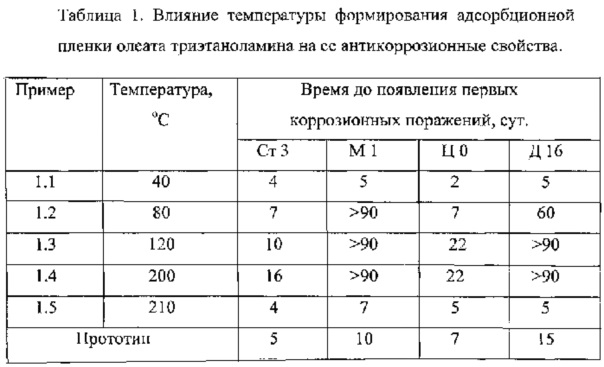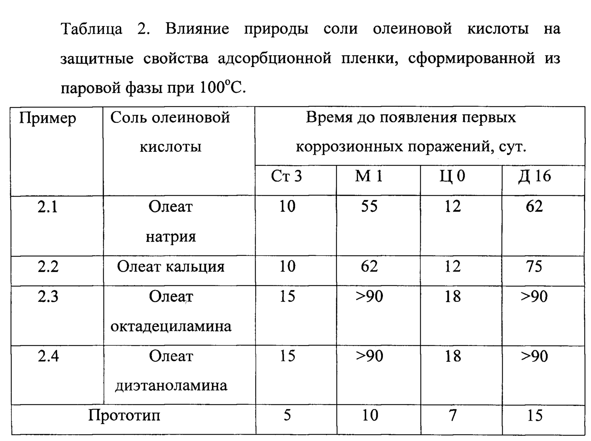 Изобретение относится к технике защиты металлов от атмосферной коррозии с помощью ингибиторов и может быть использовано для временной защиты металлоизделий. Известно много способов ингибиторной защиты металлов от атмосферной коррозии /Виноградов П.А. Консервация изделий машиностроения. - Л.: Машиностроение, 1986. - 270 с./. Широко распространен способ, связанный с созданием на поверхности металлоизделий органических покрытий, содержащих контактные ингибиторы коррозии. Толщина таких покрытий колеблется от нескольких десятков до сотен микрометров. Это определяет их главный недостаток: для сохранения точных размеров перед монтажом прецизионных металлоизделий такие покрытия подлежат трудоемкому удалению (расконсервации). Этого недостатка лишен способ, основанный на использовании т.н. летучих ингибиторов /Розенфельд И.Л., Персианцева В.П. Ингибиторы атмосферной коррозии. - М.: Наука, 1985. - 278 с./ - аналог предлагаемого изобретения. Он включает формирование на поверхности металлов тончайшей (наноразмерной) адсорбционной пленки ингибиторов из паровой фазы при комнатной температуре. В качестве ингибиторов используют соединения с высоким давлением насыщенного пара (выше 10-5 мм рт.ст. при 20°С), которые способны самопроизвольно испарятся и в виде паров достигать защищаемой поверхности. Однако высокая летучесть ингибиторов определяет и недостаток этого метода. Из-за нее адсорбционная пленка обладает низкой устойчивостью. Летучие ингибиторы десорбируются и легко испаряются с защищаемой поверхности. Чтобы избежать этого защищаемые изделия изолируют от окружающей среды барьерным материалом, внутри которого создают атмосферу, насыщенную парами ингибитора. Необходимость герметизации защищаемого изделия совместно с источником ингибитора на все время хранения на практике создает серьезные неудобства и является недостатком этого способа временной защиты. Наиболее близким по технической сущности к предлагаемому способу является способ, в соответствии с которым адсорбционная пленка на поверхности металлов формируется из водных растворов /Виноградов П.А. Консервация изделий машиностроения. - Л.: Машиностроение, 1986. - 270 с./. Для этого используют нелетучие ингибиторы (давление насыщенного пара ниже 10-5 мм рт.ст. при 20°С), например олеат триэтаноламина /Розенфельд И.Л., Гавриш Н.М., Персианцева В.П. Промышленные испытания универсальных ингибиторов атмосферной коррозии класса олеатов аминоспиртов. В кн. "Ингибиторы коррозии" Тула, изд. Тульского политехнического института. 1970/ (прототип). Однако и такие адсорбционные пленки не обладают длительным последействием и не обеспечивают эффективную защиту металла от атмосферной коррозии в жестких условиях. Целью настоящего изобретения является разработка способа формирования на поверхности металла адсорбционной пленки ингибитора, обладающей длительным защитным действием в жестких условиях. Поставленная цель достигается за счет создания на поверхности металлов адсорбционной пленки нелетучих ингибиторов, которая формируется из паровой фазы при повышенной температуре. В качестве нелетучих ингибиторов используются соли олеиновой кислоты. Диапазон температур формирования адсорбционной пленки составляет 50-200°C. Ниже приводятся примеры защиты металлов предлагаемым способом и подробное 