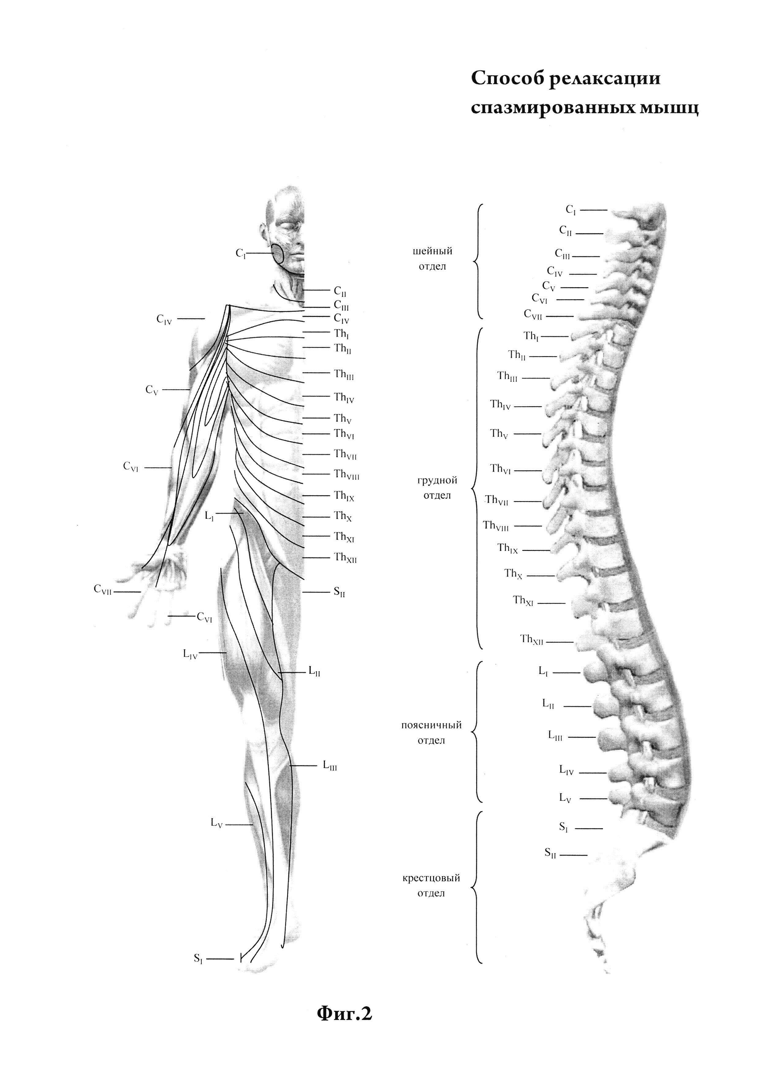 Изобретение относится к медицине, в частности, физиотерапии, неврологии, травматологии, ортопедии, реабилитации, спортивной медицине для релаксации спазмированных мышц при лечении больных с различными заболеваниями опорно-двигательной, нервной систем, а также для профилактики в социальной сфере. Изобретение может быть использовано для снятия патологического мышечного спазма, восстановления физиологической структуры опорно-двигательного аппарата, купирования болевого синдрома в период миоспазмирования, предотвращения усугубления деструктивных процессов в следствие частого и длительного миоспазмирования, восстановления нормальной двигательной активности пациента и его адаптации к социально-бытовым условиям жизнедеятельности. Изобретение может быть использовано для лечения заболеваний: - в неврологии: - спастические мышечно-суставные деформации при детских церебральных параличах, - состояния после травм опорно-двигательного аппарата, - болевые синдромы, связанные со спазмами скелетной мускулатуры в различных участках тела человека, в том числе центрального генеза, - нарушения статики и динамики позвоночника, связанные с миоспастическим синдромом, - вертеброгенные миалгии (миофасциальные синдромы), - врожденные аномалии опорно-двигательного аппарата с хроническим болевым синдромом, - боли «слабой осанки»; - в спортивной медицине: - патологическое перенапряжение скелетной мускулатуры в следствие интенсивных спортивных нагрузок, - профилактическая тонусная адаптация мышечно-связочного аппарата к последующим физическим нагрузкам, - комплексная реабилитация после спортивных травм; - в социальной сфере: - профилактическая тонусная регуляция после рабочих физических нагрузок (в комнатах функциональной разгрузки), - для улучшения качества жизни, в частности, нормализация сна в условиях пансионатов, домов отдыха, домов престарелых. Известен способ мышечной релаксации спазмированных мышц, включающий стимулирующее электроимпульсное воздействие на расслабленную мышцу-антагониста, а также вибрационное стимулирующее воздействие на связки, капсулу сустава или сухожилие, посредством которых спазмированная мышца-агонист крепится к позвоночнику, WO №2011/067327, опубл. 09.06.2011. Недостатком известного способа является то обстоятельство, что вибрация относится к факторам, обладающим высокой биологической активностью. Вибрационное воздействие является стимулирующим воздействием, таким образом, при стимулировании спазмированной мышцы-агониста происходит процесс ее дальнейшего сжатия, и, как следствие, взаимного торможения (расслабления) и до того уже расслабленной мышцы-антагониста, т.е. расслабление спазмированной мышцы не происходит. Кроме того, локальная вибрация вызывает спазмы сосудов, нарушая кровоснабжение конечностей, вызывает снижение кожной чувствительности, деформирует и уменьшает подвижность суставов. При локальной вибрации также нарушается деятельность центральной нервной системы. Что объясняется тем, что вибрация способна к распространению, отражаясь на нервной и опорно-двигательной систем. От длительной вибрации страдает сердечно-сосудистая система и особенно - микроциркуляторное русло (мелкие сосуды, в которых идет непосредственная отдача кровью кислорода и утилизация из тканей углекислог