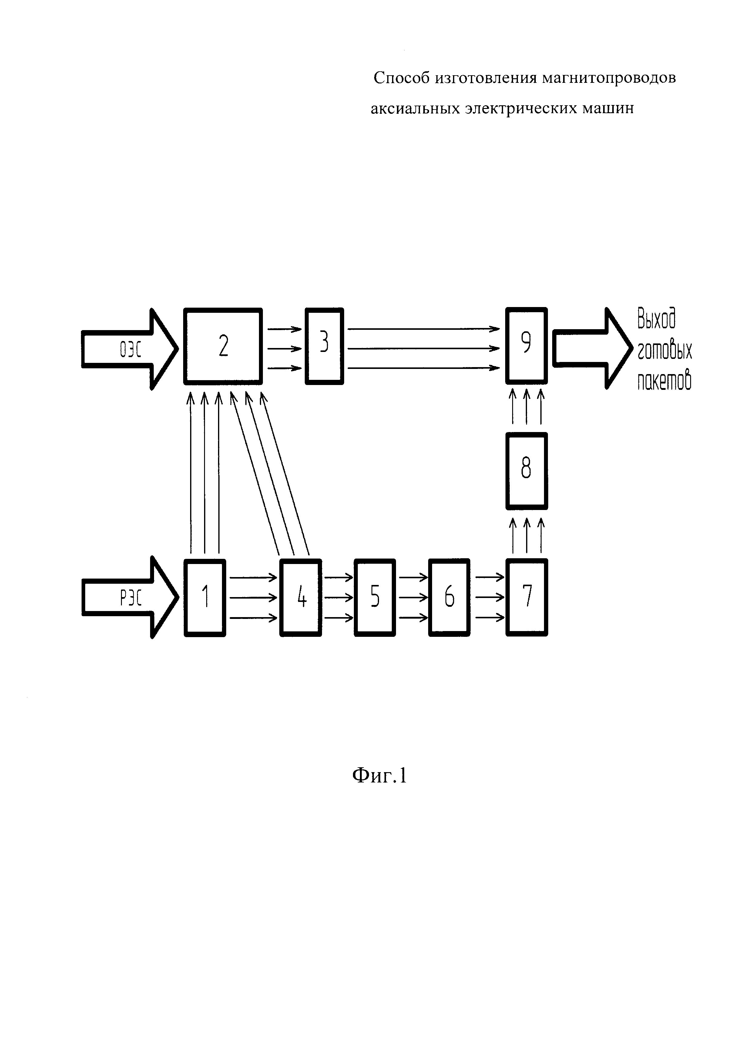 Изобретение относится к области электротехники, а именно к технологии изготовления электрических машин, и может быть использовано при изготовлении магнитопроводов пакетов статора и ротора для аксиальных электрических машин, особенностью которых является отсутствие насыщения магнитной системы, например пакетов статора аксиальной магнитотерапевтической установки. Известен способ изготовления магнитопроводов аксиальных электродвигателей (пат. РФ №2316877, Гайтова Т.Б., Гайтов Б.Х., Таршхоев Р.З.), заключающийся в том, что рулонную холоднокатаную электротехническую сталь в движении протяжкой разрезают одновременно на расчетное количество полос расчетной ширины и количества, до сборки осуществляют в полосах вырубку пазов и отжиг, затем наматывают каждую полосу на свое внутреннее ферромагнитное кольцо расчетного диаметра с последующей напрессовкой требуемого количества наружных ферромагнитных колец соответствующих диаметров на стальной пакет расчетного наружного диаметра. Данный способ изготовления применим для аксиальных электрических машин, работающих как в режиме насыщения, так и в для аксиальных электрических машин, особенностью которых является отсутствие насыщения магнитной системы (например, в «Магнитотерапевтической установке», пат. RU №2066214 С1, (авторы Гайтов Б.X., Синицкий С.Д.) насыщение магнитной системы не происходит из-за того, что тела пациентов имеют большое магнитное сопротивление, которое ограничивает основной магнитный поток). Однако при таком способе изготовления не обеспечивается равномерное магнитное сопротивление в радиальном направлении, которое особенно сильно проявляется при насыщении магнитопровода (магнитный поток пронизывает изменяющуюся геометрию зубцов и ярма вдоль его активной длинны (Игнатов В.А., Вильданов К.Я. Торцевые асинхронные электродвигатели интегрального изготовления. – М.: Энергоатомиздат, 1988 - 304 с., с. 217, 219)), что приводит к неполному использованию магнитного материала, увеличению тока холостого хода, необходимости увеличения диаметра обмоточного провода, повышенному нагреву наиболее насыщенных участков магнитопровода и, как следствие, к уменьшению срока службы изоляции проводов и ухудшению массогабаритных показателей электрической машины в целом. Выравнивание индукций областей, находящихся ближе к внутреннему и внешнему диаметрам, возможно путем увеличения тока холостого хода, однако это приведет к значительному уменьшению энергетических показателей: коэффициента мощности cos ϕ и КПД η. Степень неравномерности магнитного насыщения ярма можно регулировать путем увеличения его поперечного сечения за счет увеличения его высоты. Увеличение же сечения ярма за счет увеличения его высоты приводит к существенному увеличению размеров электрической машины в осевом направлении. Все это приводит к существенному увеличению массогабаритных и стоимостных показателей аксиальных электрических машин, магнитопроводы которых изготовлены данным способом. Кроме того, при изготовлении магнитопроводов данным способом неизбежны потери дорогостоящей электротехнической стали (при резке полос из электротехнической стали, вырубке пазов), которые идут в общий свал металлических отходов, что не позволяет эффективно использовать их в дальнейшем производстве магнитопроводо