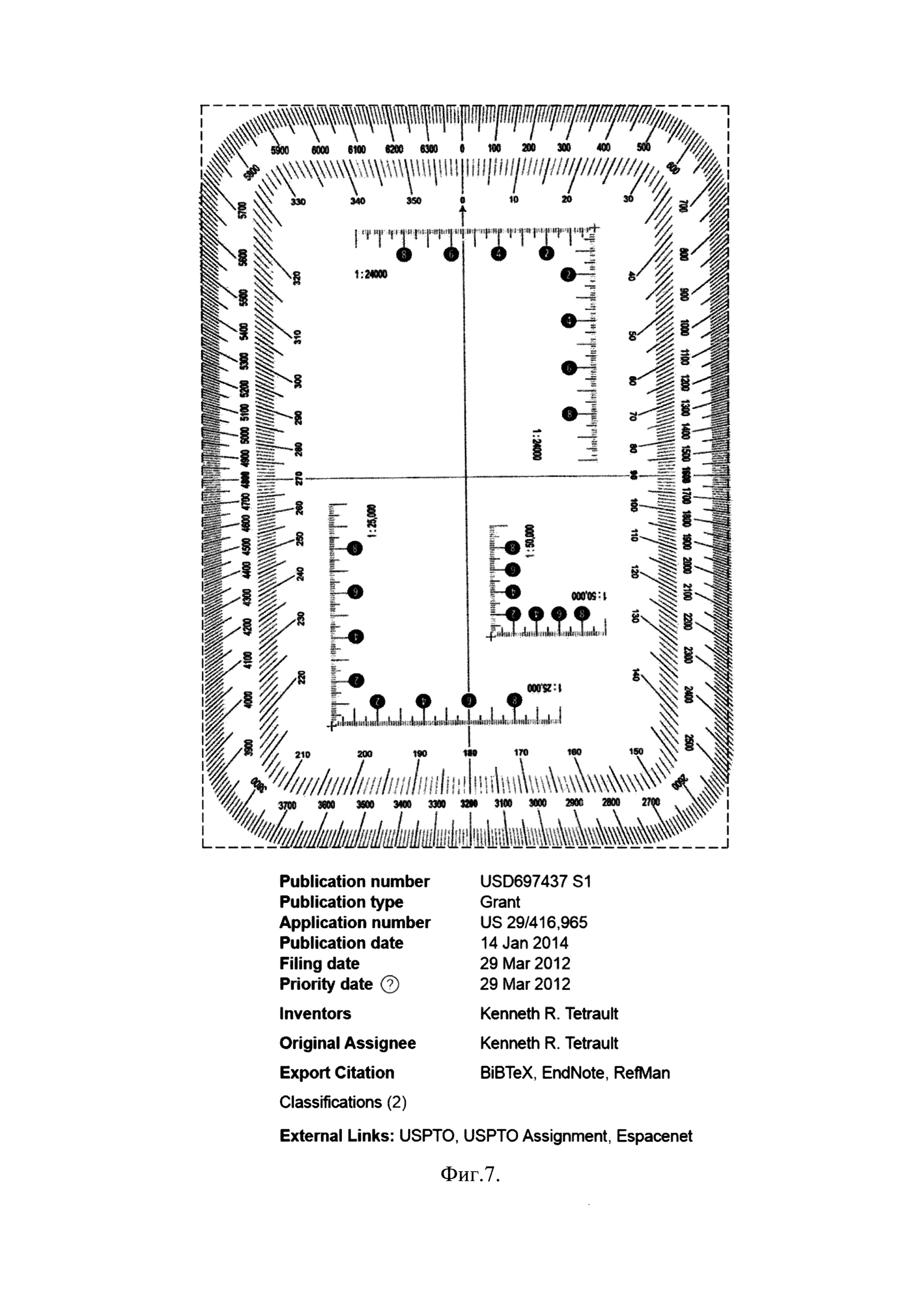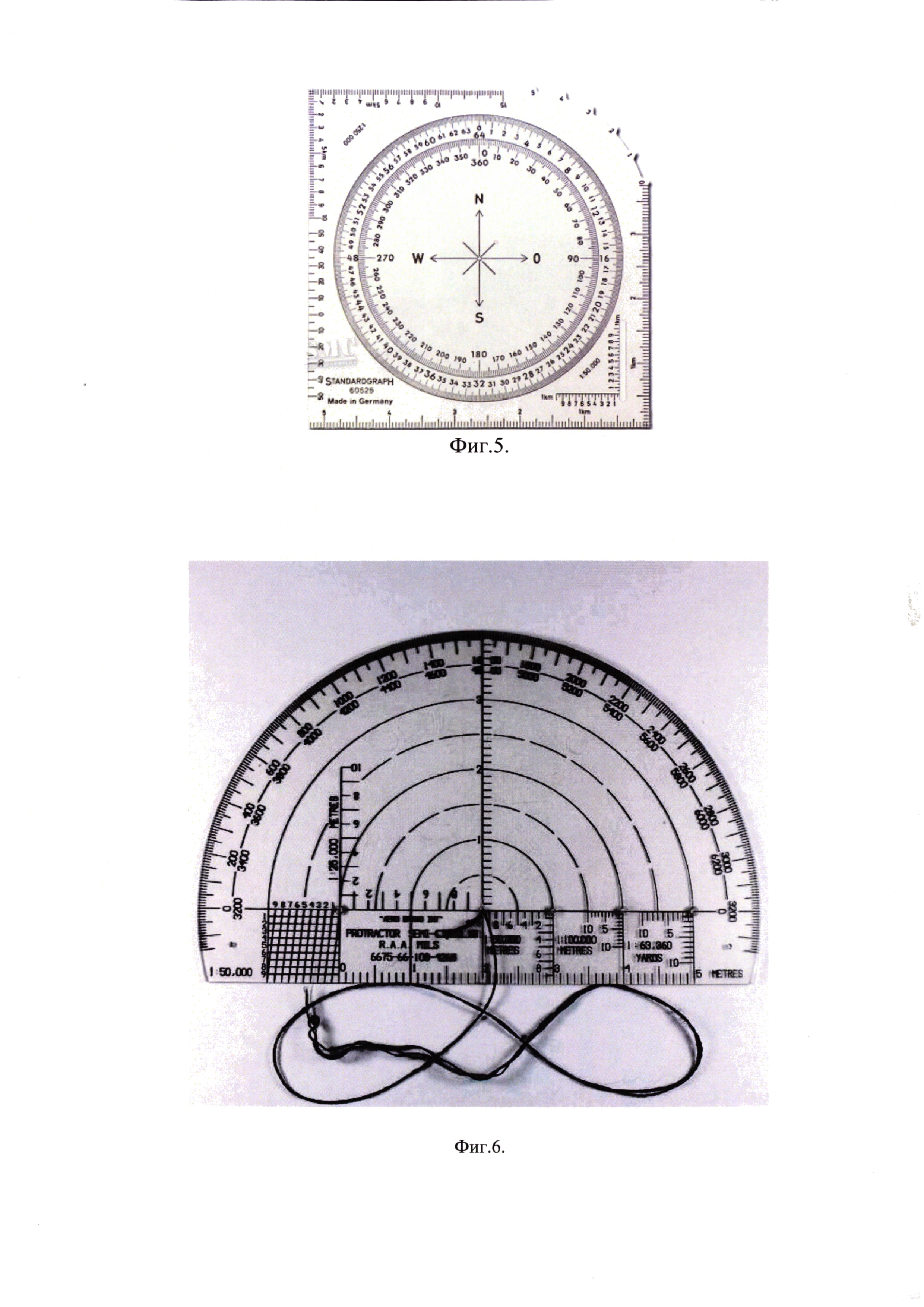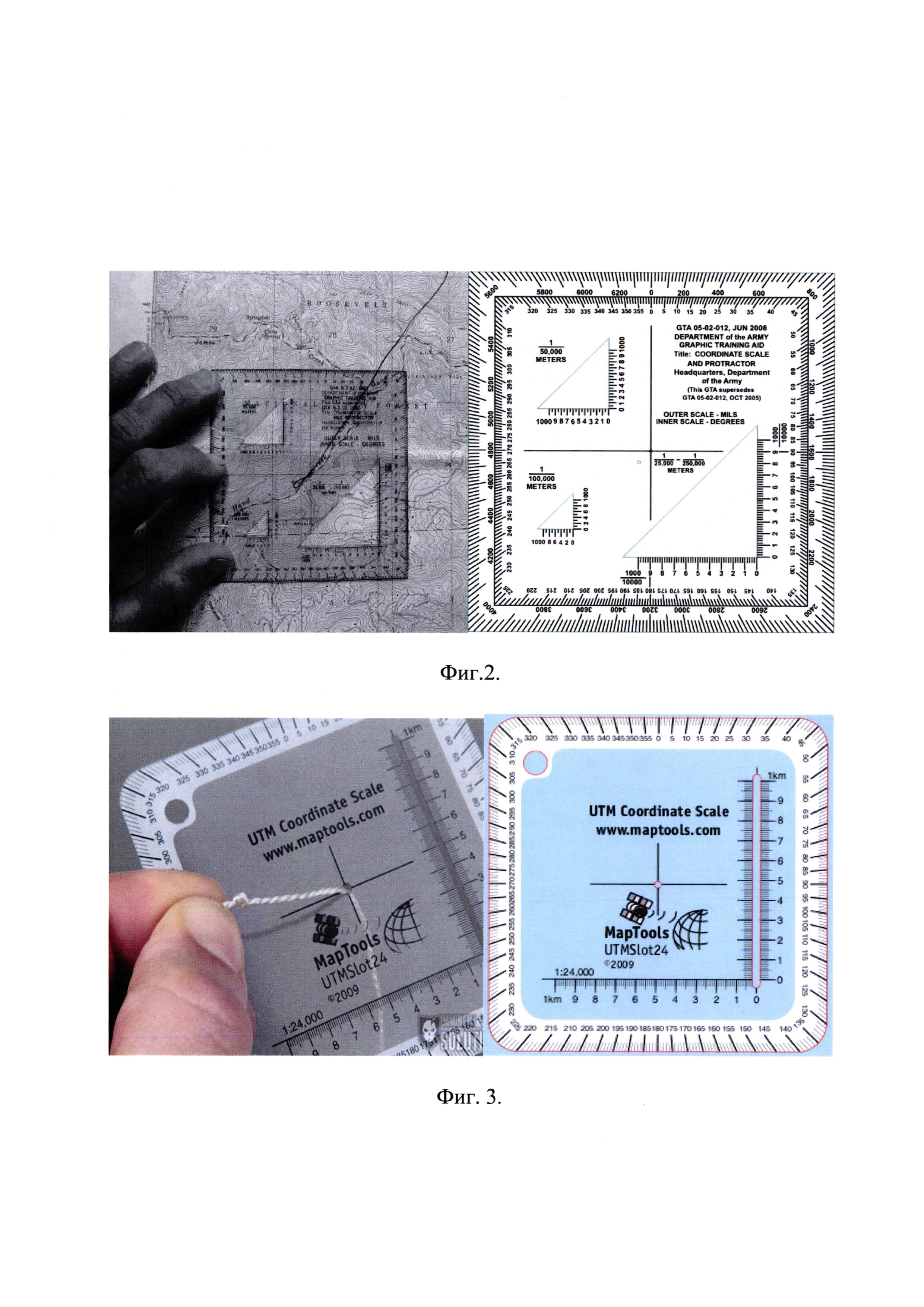 ОБЛАСТЬ ТЕХНИКИ Изобретение Фигура 1 относится к топографическим приборам и принадлежностям, письменным и чертежным принадлежностям, чертежно-измерительным инструментам. Используемые при работе с аналоговыми носителями информации о местности (топографические карты генерального штаба) масштабов 1:50000; 1:25000; 1:10000. А также, с аэрофотоснимками, специальными картами, фотосхемами, фотопланами, фотокартами различных масштабов, в том числе масштабов 1:8000; 1:4000. Для определения плоских прямоугольных и географических координат различных объектов, ориентиров, целей, точки стояния. Определения направления движения, прямого и обратного дирекционного угла и азимута. Определения координат цели и корректировки огня. Топогеодезической привязки к местности. Определения расстояний в метрах, километрах. Для нанесения на графические документы и карты тактических условных знаков. УРОВЕНЬ ТЕХНИКИ В настоящее время в вооруженных силах различных стран мира используются аналоги данного изобретения. В США транспортир Coordinate Scale and Protractor - GTA 05-02-012, OCT 2005 фирмы MapTools Фигура 2. Изготовленный из гибкого, прозрачного пластика, в нем используется нить для определения угловых величин в градусах и милях, линейные шкалы для подсчета расстояния в метрах по картам масштабов 1:100000; 1:50000; 1:10000. Недостатками данной модели являются его большой размер, острые углы которые не позволяют быстро поместить транспортир в карман и вынуть из кармана, отсутствие линейной шкалы миллиметров и сантиметров, нет резинового ползунка - фиксатора на нити, отсутствуют трафареты тактических условных знаков. Этой же фирмой выпускается группа различных транспортиров. В некоторых моделях, как в модели UTM coordinate scale Фигура 3, не используется нить. В центре транспортира находится отверстие, через которое в случае необходимости продевается шнурок. Недостатком данной модели является то, что продевается достаточно крупный шнурок, что сказывается на точности измерений угловых величин. Он имеет большой размер, острые углы которые не позволяют быстро поместить транспортир в карман и вынуть из кармана, отсутствие линейной шкалы миллиметров и сантиметров, нет резинового ползунка - фиксатора на нити, отсутствуют трафареты тактических условных знаков. В германии во время ВОВ немецкими войсками использовался транспортир W.H. 39 и артиллерийский круг входящие в набор "Karten Winkelmesser 27" Фигура 4. В которых, использовались шнурок и нить для определения угловых величин. В настоящее время в германии используется транспортир Karten-Winkelmesser Фигура 5. Недостатком данной модели является крупный размер, острые углы которые не позволяют быстро поместить транспортир в карман и вынуть из кармана, отсутствие ползунка - фиксатора на нити, отсутствуют трафареты для нанесения на карту и другие графические документы тактических условных знаков. В армии Австралии используется транспортир ВСВ RA Mils Protractor Фигура 6. недостатком данной модели являются: отсутствие ползунка - фиксатора на нити, для измерения угловых величин, нанесена не градусная шкала, а национальная мера - мили, отсутствуют трафареты для нанесения на карту и другие графические документы тактических условных знаков. Близким к данному изобретению является полезная модель чертежно-измерительный инструмент Сергиевского О.Г. номер международной заявки PCT/RU 2015/0001