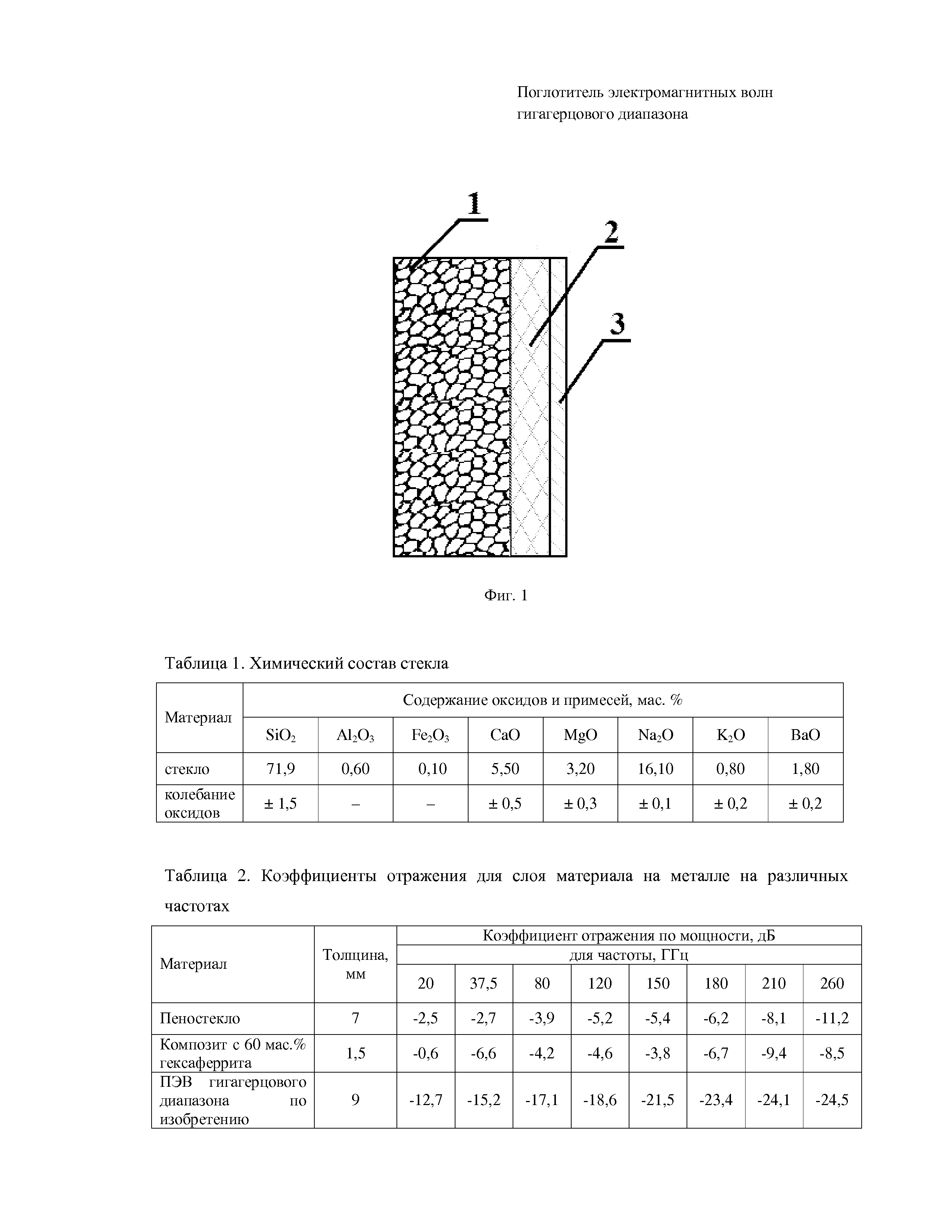 Поглотитель электромагнитных волн гигагерцевого диапазона, состоящий из слоев диэлектрического материала, магнитного материала и металлической подложки, отличающийся тем, что диэлектрический материал представляет собой плоское радиопоглощающее пеностекло толщиной 7 мм, полученное из пенообразующей смеси, содержащей 1 мас.% сажи, магнитный материал представляет собой закрепленный на металлической подложке слой композита толщиной 1,5 мм, содержащего 60 мас.% высокочастотного радиопоглощающего гексаферрита BaFe12O19, связанного полимерным связующим, при этом поглотитель имеет коэффициент отражения по мощности в пределах от -12,7 до -24,5 дБ в диапазоне частот от 20 до 260 ГГц.