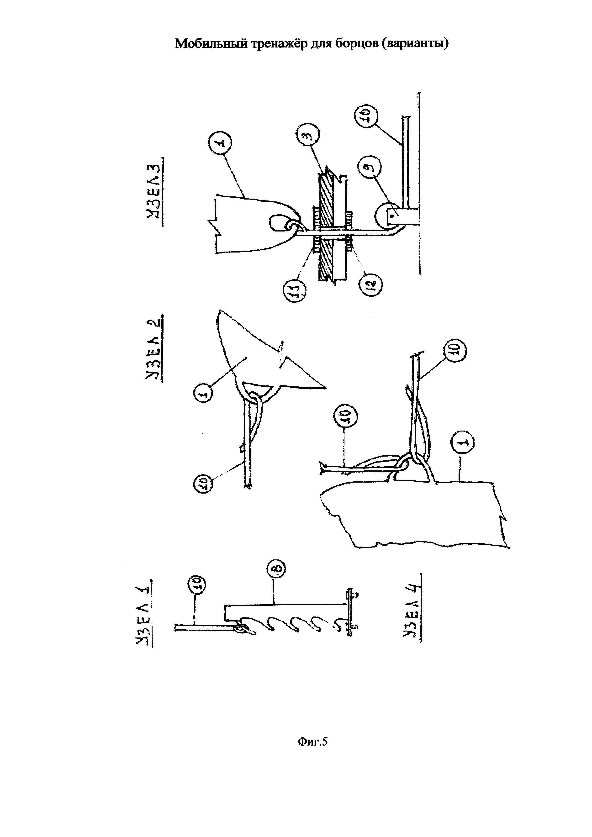 Предлагаются варианты мобильного тренажера для борцов, содержащего вертикальные и горизонтальные стойки, образующие каркас, посредством которых установлен манекен в виде тела человека, закрепленный гибкими элементами на плоском основании и через блочный механизм - на каркасе. При этом каркас представляет собой прямоугольный параллелепипед, состоящий из вертикальных и горизонтальных профилей, с одной стороны которого по центру на плоском основании, между вертикальных профилей на плоском основании, установлен манекен в виде тела человека. По первому варианту каждая нога, центр спины и каждая плечевая часть манекена фиксируются гибкими тягами через ролики блочного механизма к своей регулируемой ступенчатой стойке или набору противовесов. По второму варианту каждая нога, центр спины и каждая плечевая часть манекена фиксируются гибкими тягами к конструкции каркаса и основания. Технический результат - простота конструкции при одновременной улучшенной подвижности конструкции манекена, уменьшение времени сборки разборки тренажера. 2 н. и 5 з.п. ф-лы, 6 ил.