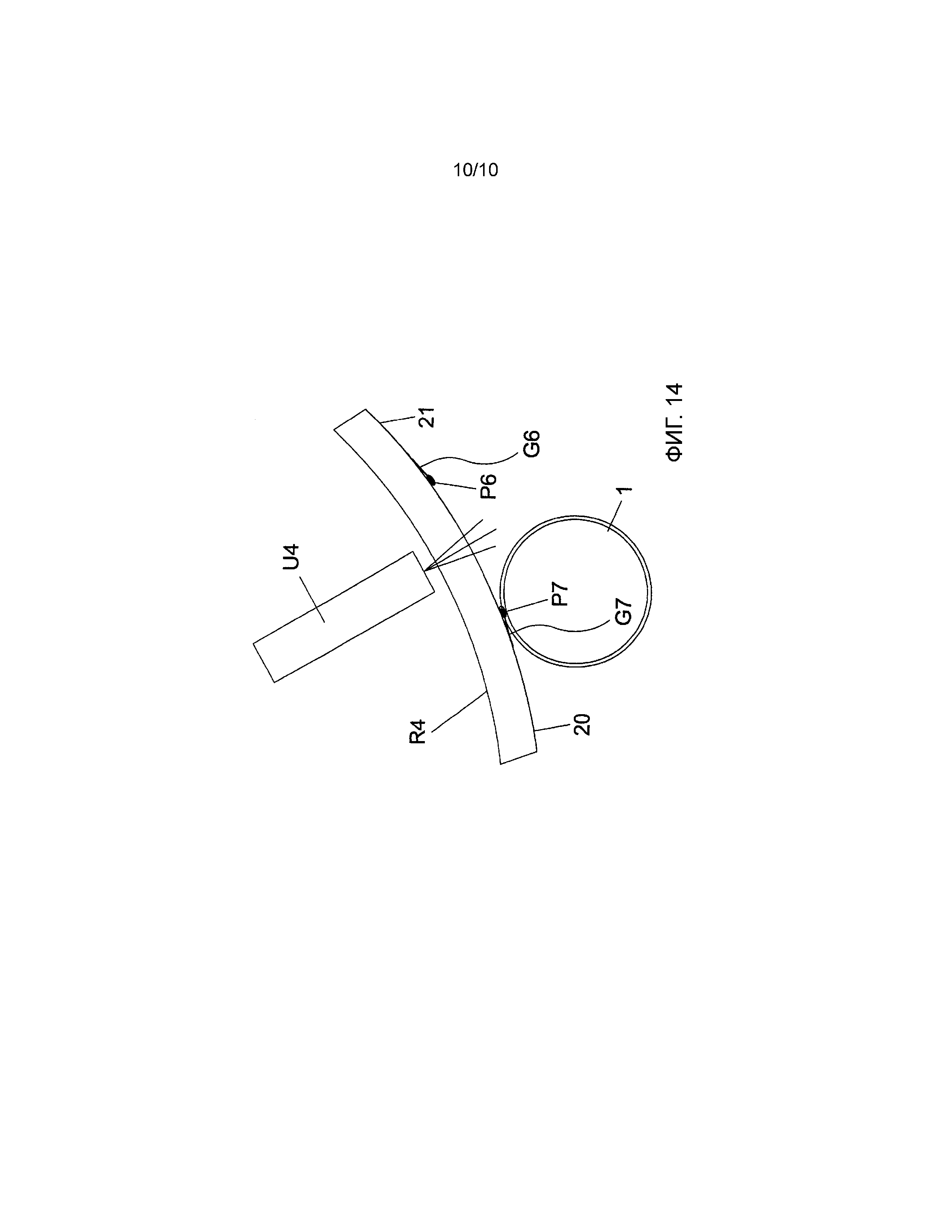 Со ссылкой на Фиг.13 видно, что точки (Р6) и (Р7) ограничивают угловой сектор (AS) сечения втулки (1), чья угловая величина составляет менее 180°, и хвосты клеевых линий (G6) и (G7) ориентированы по направлению друг к другу. Внутри канала (СН) втулка (1) соприкасается с бумажной лентой (2) и, поскольку валок (R4) поворачивается, как обозначено стрелкой "F4", втулка принудительно прокатывается вдоль этого канала (СН). Клей (G6), нанесенный соплами (60) первого ряда, смачивает ленту (2) ближе по ходу от линии предварительно надреза, в то время как клей (G7), нанесенный соплами (70) второго ряда, смачивает ленту (2) дальше по ходу от той же линии предварительного надреза.