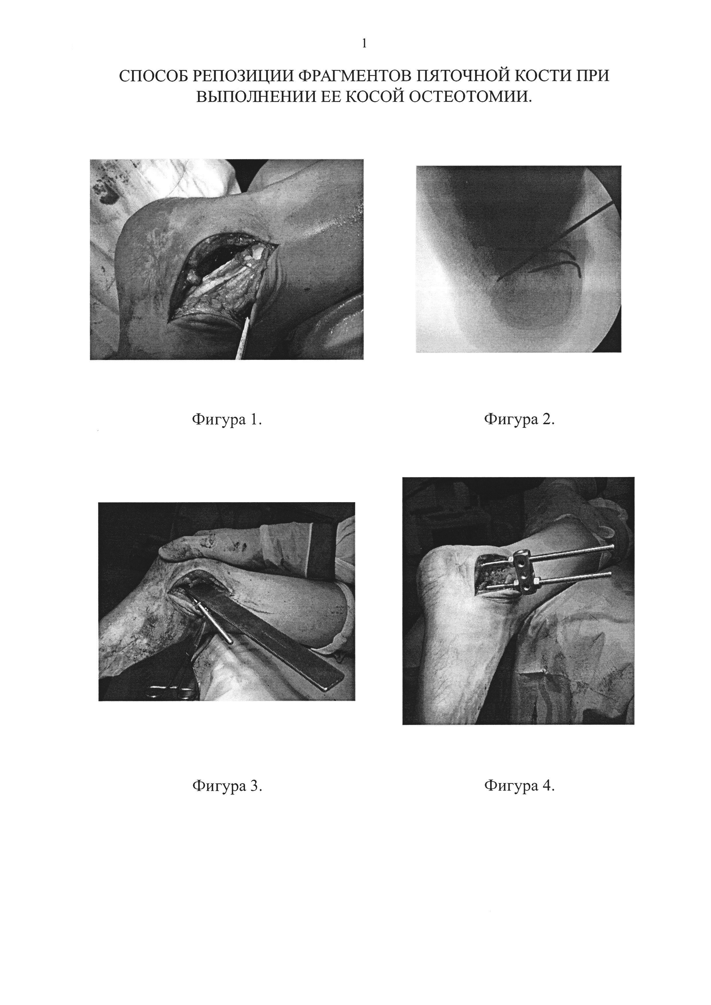 Способ репозиции фрагментов пяточной кости при выполнении ее косой остеотомии, включающий репозицию остеотомированного фрагмента при помощи стержня-шурупа, металлоостеосинтез, отличающийся тем, что в полученный в результате остеотомии передний фрагмент пяточной кости параллельно плоскости остеотомии вводят стержень-шуруп в направлении, соответствующем направлению смещения заднего фрагмента пяточной кости, определенному в ходе предоперационного планирования, на который навинчивают гайку и крайним отверстием насаживают кубический фиксатор, свободный край которого ориентируют на бугристость пяточной кости и фиксируют в таком положении второй гайкой, далее через выбранное направляющее отверстие фиксатора вводят стержень-шуруп в задний фрагмент пяточной кости, затем навинчивают гайку на второй стержень-шуруп на уровень гайки первого стержня-шурупа, предварительно сняв фиксатор, после чего его окончательно фиксируют гайкой на первом стержне, а затем, вращая гайку на стержне-шурупе, введенном в задний фрагмент пяточной кости, смещают упомянутый фрагмент на запланированное расстояние, при этом под контролем ЭОП добиваются сопоставления латеральных кортикальных пластинок заднего и переднего фрагментов пяточной кости, после чего выполняют металлоостеосинтез винтами.