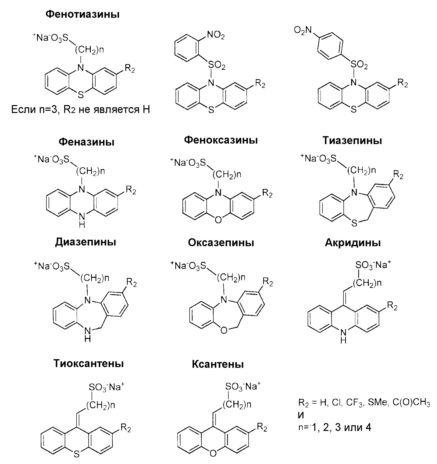 ОБЛАСТЬ ТЕХНИКИ, К КОТОРОЙ ОТНОСИТСЯ ИЗОБРЕТЕНИЕ Настоящее изобретение относится к трициклическим производным фенотиазинов, феноксазинов, феназинов, акридинов, оксазепинов, диазепинов, ксантенов, тиоксантенов, а также к их применению. ПРЕДПОСЫЛКИ ИЗОБРЕТЕНИЯ Фенотиазиновые антипсихотические и антигистаминные препараты прохлорперазин, хлорпромазин и промазин продемонстрировали синергетическое взаимодействие с широким спектром антимикробных агентов. Минимальные ингибирующие концентрации антибиотиков в присутствии фенотиазинов в некоторых случаях снижались до 8000 раз. Кроме того, известно, что фенотиазины повышают отношение NADH/NAD в Mycobacterium tuberculosis за счет ингибирования NADH:менахинон-оксидоредуктазы типа II. Таким путем фенотиазины способны усилить восстановленное состояние клетки, действуя синергетически с лекарственными средствами, которым для активации необходим микотиол, например, изониазидом и этионамидом. Такая комбинированная терапия помогает ограничить появление устойчивости к антимикробным агентам. Было доказано, что фенотиазины, например тиоридазин, проявляют активность против мульти- и экстремально резистентных к лекарственным средствам форм Mycobacterium tuberculosis. Фенотиазины продемонстрировали широкий спектр биологической активности, хотя изначально они применялись в основном в качестве нейролептических препаратов. Эти нейролептические свойства ограничивают антимикробное применение данных препаратов при таких заболеваниях, как туберкулез, поскольку они могут вызывать нежелательные побочные эффекты в центральной нервной системе в тех дозировках, которые применяются для борьбы с микобактериями. Таким образом, существует необходимость в модифицированных производных фенотиазина, которые не демонстрируют или демонстрируют минимальное нежелательное побочное воздействие на ЦНС. СУЩНОСТЬ ИЗОБРЕТЕНИЯ Согласно настоящему изобретению, разработано трициклическое производное формулы (1) где R1 представляет собой алкилсульфонатную или сульфонамидную группу; R2 представляет собой водород, галоген, замещенную алкильную группу, тиоэфирную или ацетильную группу; Y представляет собой N или C; X представляет собой S, SO, SO2, N, O, CH2, C(O), CO2, NHCO; и цикл B представляет собой 6, 7 или 8-членный циклоалкил. Если производное (1) является производным фенотиазина, R2 не является H. В предпочтительном варианте осуществления изобретения R1 представляет собой (CH2)nSO3M, где n=1, 2, 3 или 4, и M = Na, K или H, или R1 представляет собой SO2Ar, где Ar необязательно является замещенным; R2 представляет собой H, Cl, Br, SMe, C(O)CH3 или CF3; Y представляет собой N или C; и X представляет собой S, SO, SO2, N, O, CH2, C(O), CO2, NHCO, и цикл B представляет собой 6, 7 или 8-членный циклоалкил. Заместители фрагмента Ar, если R1 представляет собой SO2Ar, включают орто- и пара-заместители, выбранные из NO2, NH2, SO3M, CO2R, где M = Na, K или H, и R = алкил. Другие производные по настоящему изобретению, относящиеся к трициклическим производным, могут быть выбраны из: Дополнительные производные по настоящему изобретению, относящиеся к трициклическим производным, могут быть выбраны из: Настоящее изобретение относится к трициклическим производным формулы (1), которые определены выше, в т.ч. производным фенотиазина формулы (1), где n=3 и R2=H, для применения в лечении туберкулеза, предпочтительно чувствительных и резистентных к л
