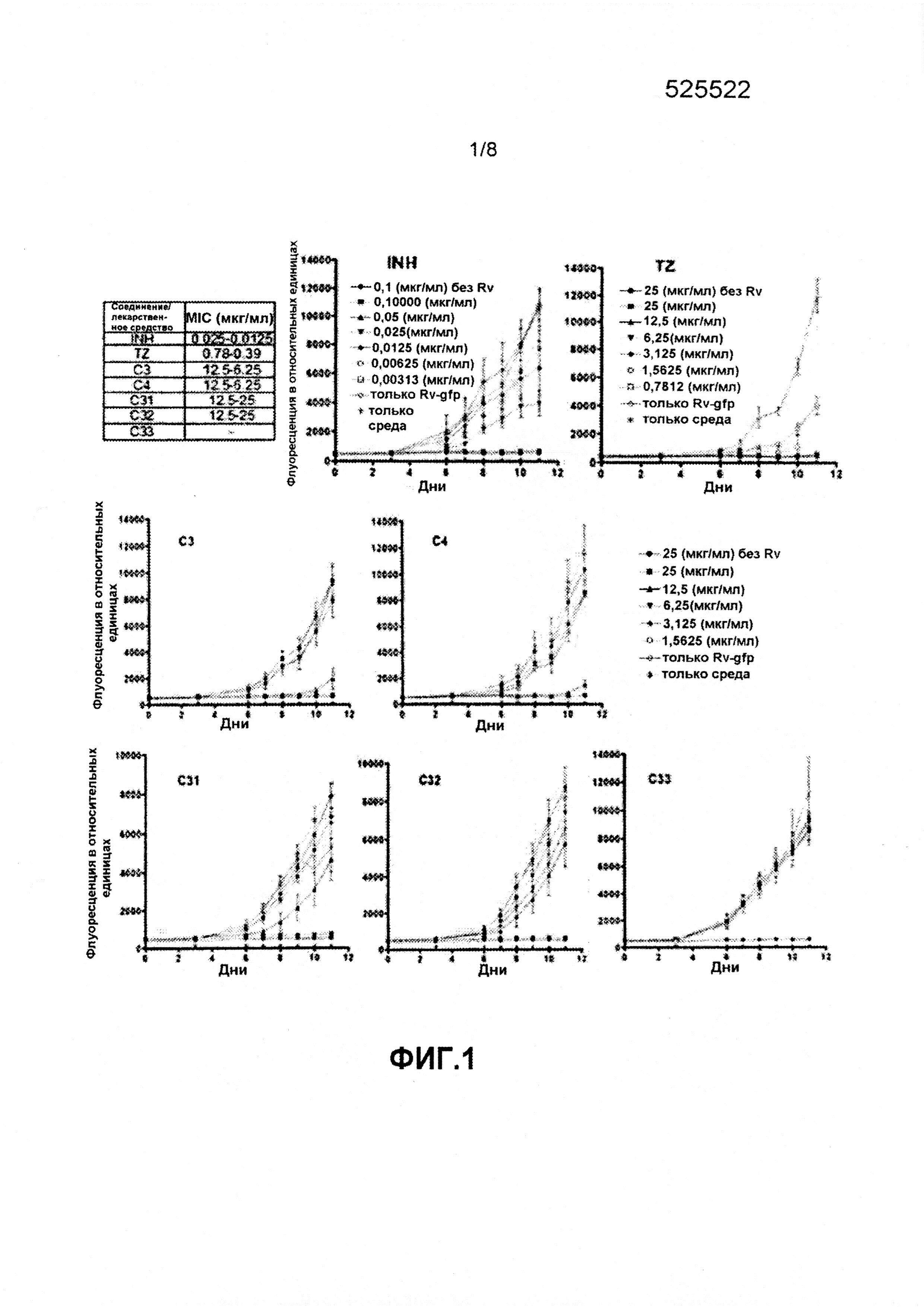 Цитотоксичность тестируемых соединений в отношении макрофагов. Макрофаги обрабатывали соединениями в течение 5 дней и оценивали выживаемость клетокКонцентрация Выживаемость клеток TZ C3 C4 C31 C32 C33 0,1953 мкг/мл 99,89 100,00 99,78 96,86 100,00 99,88 0,3906 мкг/мл 99,93 98,80 98,72 98,93 100,00 98,29 0,7813 мкг/мл 99,15 100,00 99,13 98,36 100,00 96,01 1,5625 мкг/мл 98,75 100,00 100,00 96,62 100,00 96,02 3,125 мкг/мл 87,45 99,95 97,96 100,00 98,85 98,76 6,25 мкг/мл 0,00 100,00 97,92 100,00 99,54 96,11 12,5 мкг/мл 0,00 100,00 97,87 100,00 100,00 99,34 25 мкг/мл 0,00 98,36 98,05 98,41 100,00 98,99