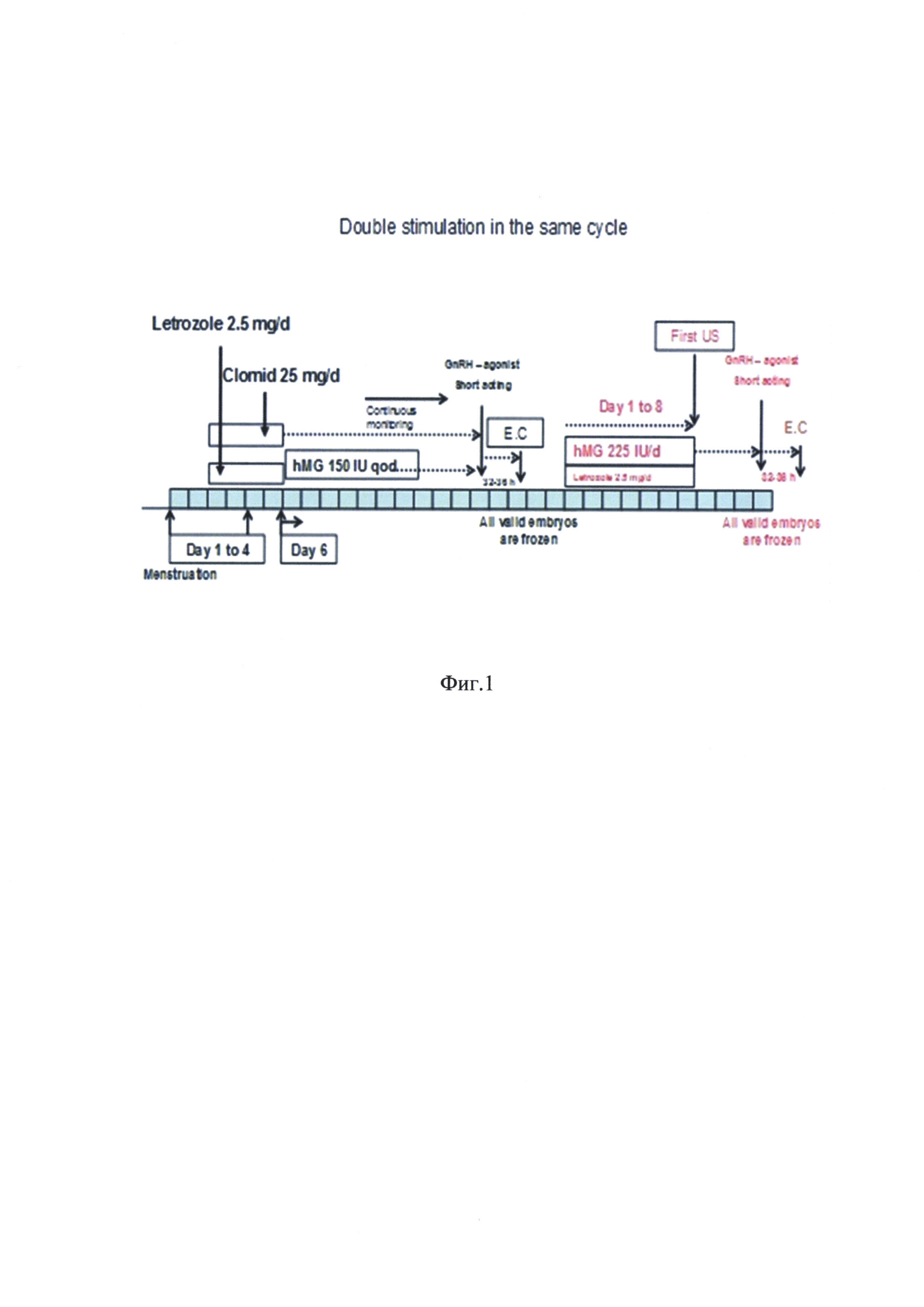 Изобретение относится к медицине, а именно к акушерству и гинекологии, и может быть использовано для стимуляции роста фолликулов в программе экстракорпорального оплодотворения у пациенток с бесплодием и «бедным ответом на стимуляцию». Для этого проводят две последовательные стимуляции яичников, при этом для стимуляции яичников в 1-м цикле вводят кломифен в дозе 100 мг в день в течение 5 дней и параллельно - фоллитропин альфа в дозе 150 ME в день в течение 5 дней; если на 6-й день фолликулы достигли диаметра 12-13 мм, то дозировка фоллитропина альфа остается прежней, если фолликулы не достигли этого диаметра - дозировку фоллитропина альфа увеличивают до 225 ME в сутки до достижения фолликулами диаметра 17-19 мм, после чего на 10-й день введение фоллитропина альфа прекращают и вводят триггер овуляции трипторелин в дозе 0,2 мг, через 36 часов проводят трансвагинальную пункцию фолликулов с витрификацией яйцеклеток, вводят дидрогестерон перорально в дозе 30 мг в сутки в течение 7 дней и эстрадиол трансдермально 2 мг в сутки в течение 10 дней; с 10-го дня после пункции начинают 2-й цикл стимуляции с введением фоллитропина альфа в дозе 225 ME в сутки в течение 9 дней, на 10-й день вводят триггер овуляции овитрель 6500 ME п/к, затем через 36 часов проводят трансвагинальную пункцию фолликулов с назначением микронизированного прогестерона в дозе 600 мг в сутки до результата теста на беременность, размораживают яйцеклетки, полученные в 1-м цикле стимуляции, однократно выполняют процедуру оплодотворения яйцеклеток, полученных в двух циклах стимуляции, и процедуру культивирования эмбрионов, а для синхронизации фолликулов перед началом стимуляции их роста назначают эстрадиола валерат 4 мг в сутки с 21-го дня менструального цикла до 2-го дня менструального цикла перед 1-м циклом стимуляции, и с 1-го дня после пункции фолликулов до 1-го дня менструального цикла перед 2-м циклом стимуляции. Способ позволяет достичь повышения количества получаемых яйцеклеток высокого качества, следствием чего является повышение частоты наступления беременности в программах ЭКО. 3 ил.