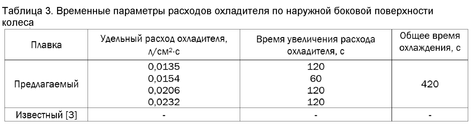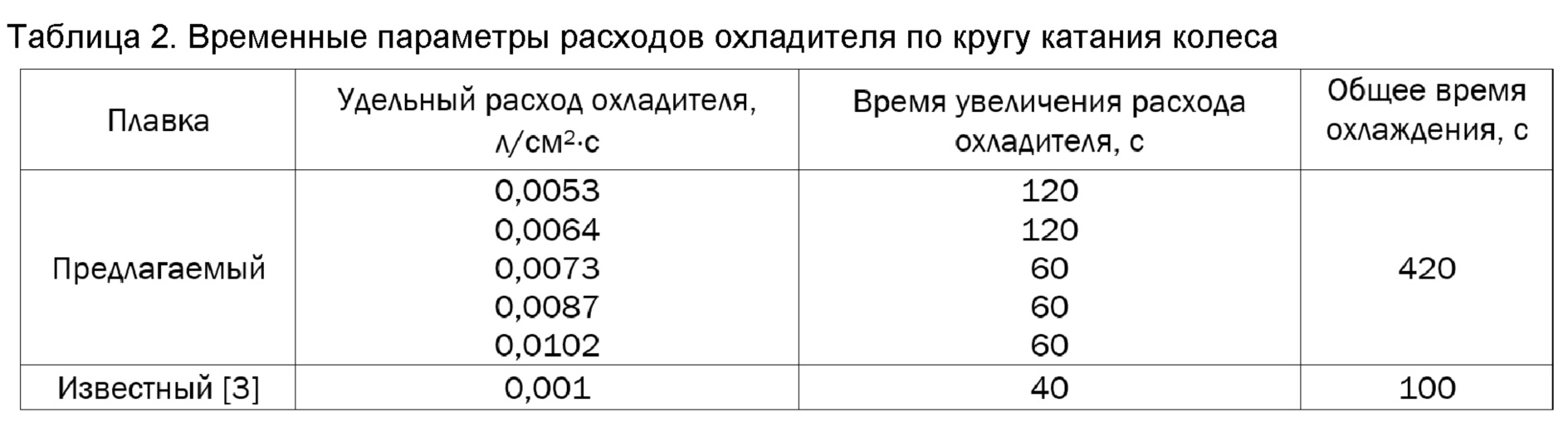 Способ термической обработки железнодорожных колес из стали, содержащей, мас.%: С 0,75-0,77, Mn 0,82-0,9, Si 0,3-0,4, Cr 0,18-0,25, Ni 0,15 -0,25, V 0,02-0,04, Mo 0,04-0,06, включающий нагрев колеса до температуры аустенизации, охлаждение поверхностного обода колеса, последующую выдержку колеса на воздухе и отпуск, отличающийся тем, что охлаждение поверхностного слоя обода колеса осуществляют в течение 420 с, при этом охлаждение элементов обода осуществляют водой с регулированием ее расхода на отдельные элементы обода в период охлаждения, соответственно по кругу катания от 0,005 до 0,006 л/(см2⋅с) в первый период 120 с, от 0,006 до 0,007 л/(см2⋅с) в период 120 с, от 0,007 до 0,008 л/(см2⋅с) в период 60 с, от 0,008 до 0,009 л/(см2⋅с) в период 60 с, от 0,009 до 0,012 л/(см2⋅с) в период 60 с и по наружной боковой поверхности обода колеса от 0,013 до 0,015 л/(см2⋅с) в первый период 120 с, от 0,015 до 0,017 л/(см2⋅с) в период 60 с, от 0,020 до 0,022 л/(см2⋅с) в период 120 с, от 0,022 до 0,024 л/(см2⋅с) в период 120 с, а внутреннюю боковую поверхность обода колеса охлаждают водовоздушной смесью с расходом воздуха 0,015 м3/(см2⋅с) и расходом воды 0,0055 л/(см2⋅с) в течение 420 с.