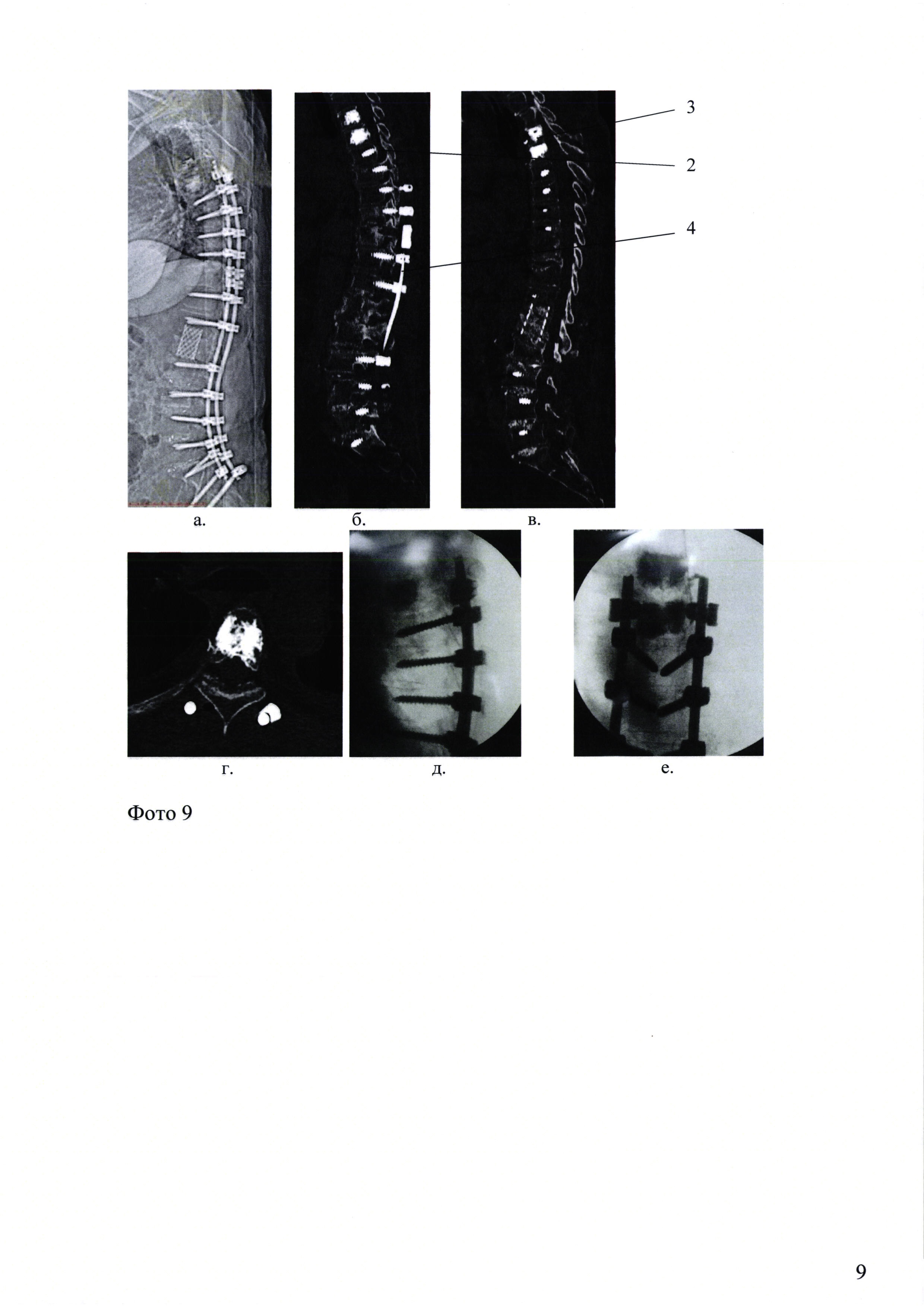 Изобретение относится к травматологии, ортопедии, нейрохирургии и может быть применимо для профилактики переломов смежных позвонков при транспедикулярной фиксации на фоне остеопороза. В тела позвонков, смежных с поврежденным, вводят костный цемент в объеме 7-8 мл в каждый позвонок. Устанавливают транспедикулярно винты в тела позвонков и стержни в головки винтов, также осуществляют фиксацию полимерной лентой с зажимом и фиксирующим винтом за дугу позвонка слева и справа от остистого отростка и верхние концы стержней металлоконструкции. Способ позволяет увеличить механическую прочность тел краниально расположенных позвонков, уменьшить нагрузку на тела краниально расположенных позвонков. 1 пр., 12 ил.