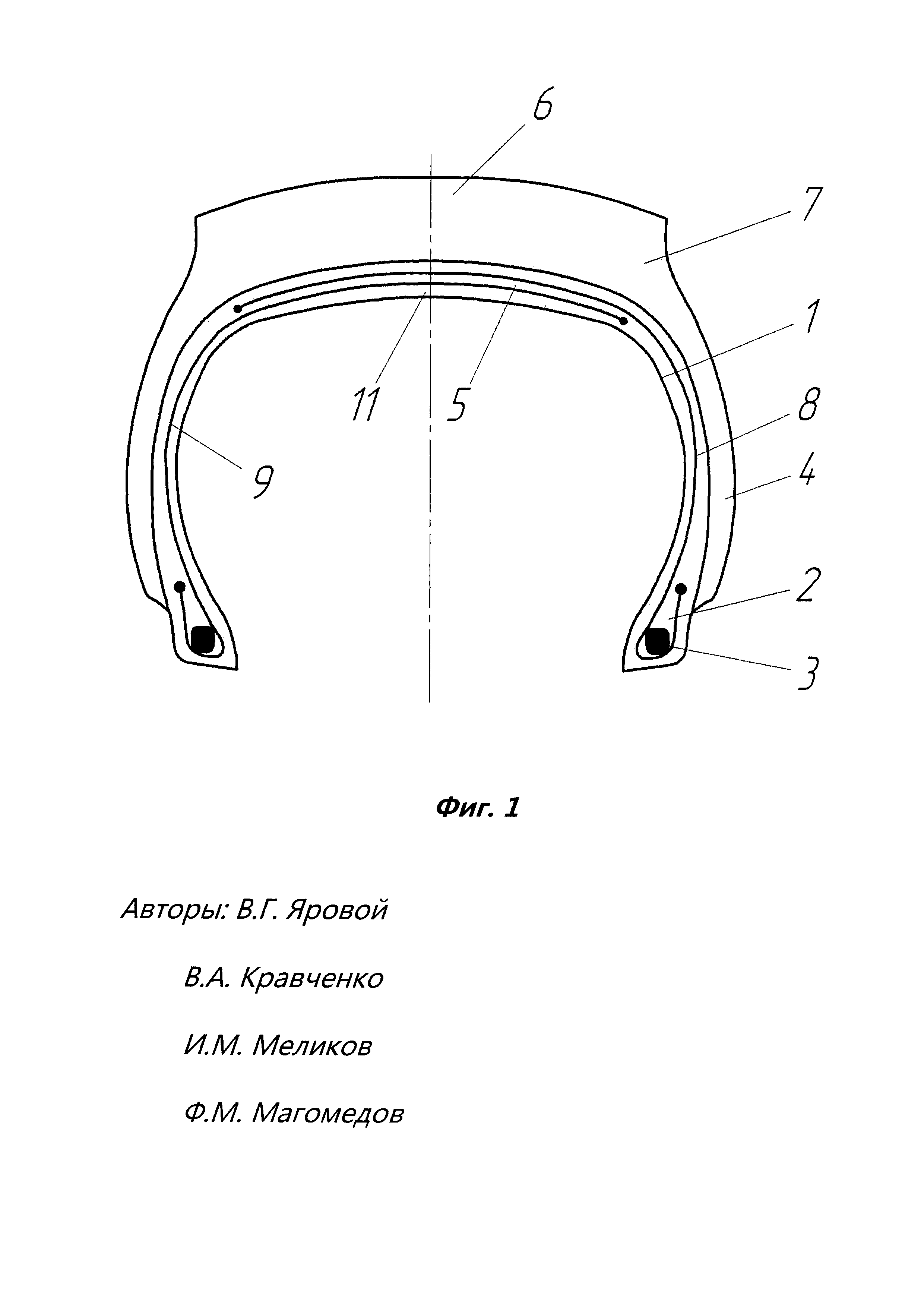 Пневматическая шина, включающая боковины, протектор и борта, каркас с несколькими слоями параллельных кордных нитей, составленных из двух полуслоев, при этом нити упомянутых полуслоев расположены с перекрещиванием в подпротекторной зоне и направлены в сторону, противоположную преимущественному направлению вращения шины, причем одна кромка каждого из полуслоев расположена в зоне бортов, а другая - в противоположной части коронной зоны, в зоне боковин нити корда расположены под углом 25-45° относительно меридионального направления, отличающаяся тем, что для каждого слоя корда по мере приближения к протектору эта кромка приближается к экватору шины; расстояние между окончаниями полуслоев, наиболее удаленных от протектора, составляет 90-95% от ширины шины, а для последующих слоев это расстояние уменьшается на 5-7%.