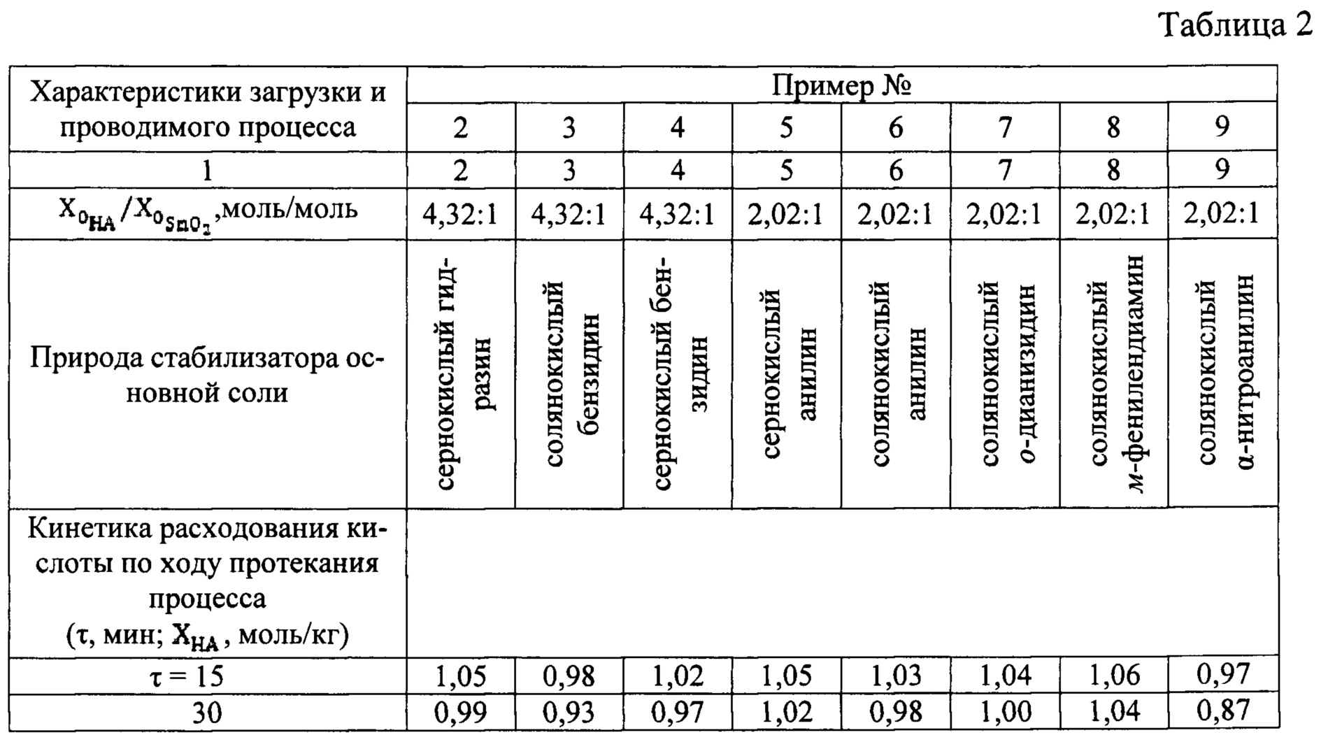 Изобретение может быть использовано в неорганической химии. Получение основного нитрата олова (IV) Sn(OH)(NO)ведут путем прямого взаимодействия оксида олова (IV) с азотной кислотой в растворе этилцеллозольва при комнатной температуре в условиях интенсивного механического перемешивания. Перемешивание проводят в присутствии стеклянного бисера в качестве перетирающего агента и солянокислых гидроксиламина, анилина, n-нитроанилина, о-дианизидина, м-фенилендиамина, бензидина, сернокислых гидразина, анилина или бензидина в качестве стабилизатора основной соли. Оксид олова (IV) загружают в количестве 0,1-0,6 моль/кг в мольном соотношении с кислотой (1:2,02)÷(1:11). Процесс начинают с интенсивного механического перемешивания, контролируют по расходованию кислоты и прекращают, когда указанное расходование приближается к удвоенной начальной мольной загрузке оксида олова (IV). После этого перемешивание прекращают, проводят отделение перетирающего агента и его отмывку от остатков реакционной смеси. Отделенную реакционную смесь фильтруют. Осадок на фильтре промывают промывным растворителем и сушат на воздухе до постоянного веса. Изобретение позволяет упростить получение основного нитрата олова (IV) при повышении селективности по целевому продукту. 2 з.п. ф-лы, 4 табл., 26 пр.