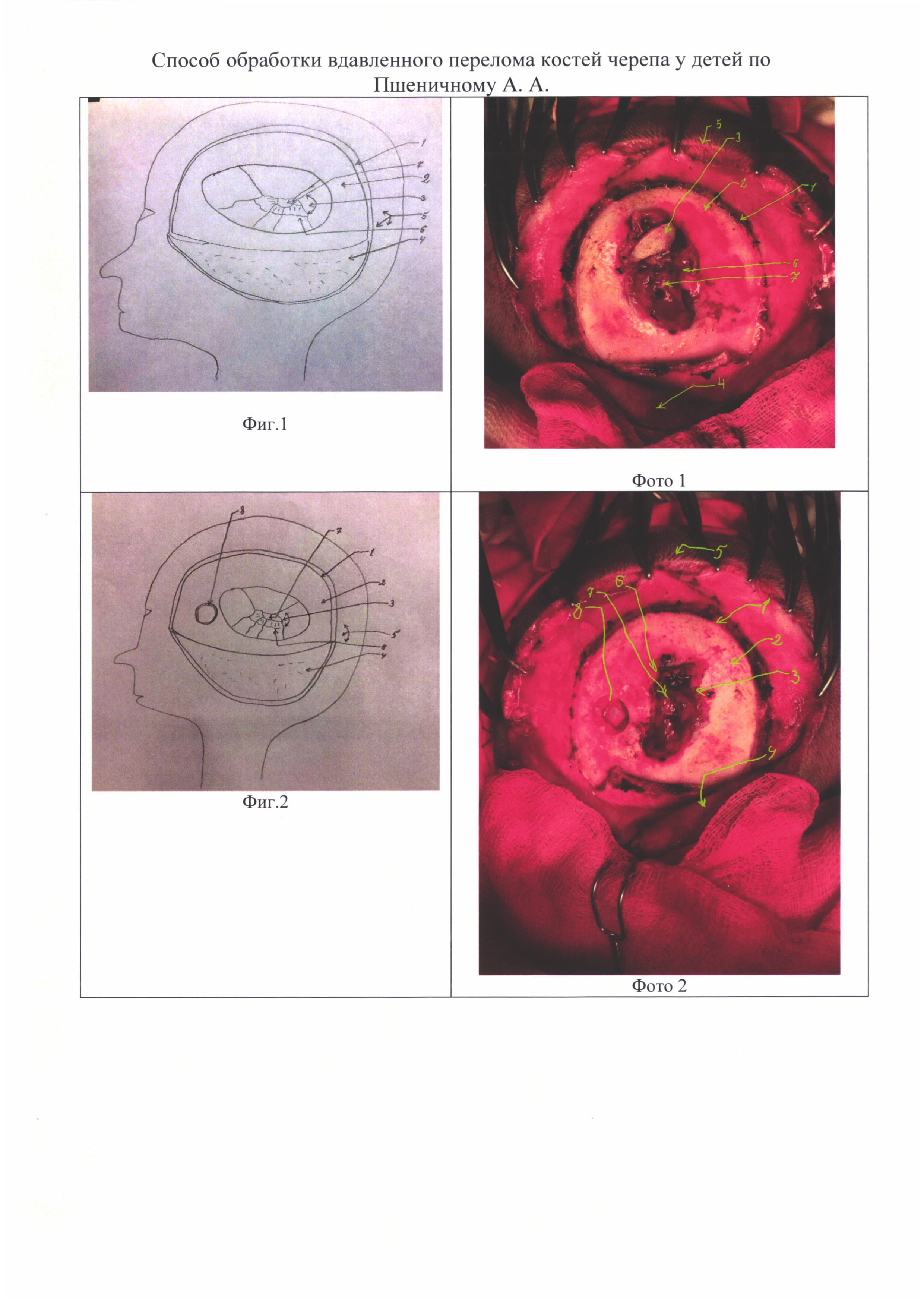 Задачей заявляемого изобретения является создание упрощенного способа обработки вдавленного перелома костей черепа у детей, позволяющего одноэтапно провести оперативное вмешательство при данном виде травмы костей черепа, устраняя зону сдавления паренхимы головного мозга, восстанавливая целостность черепной коробки, тем самом улучшая результаты проводимых краниопластических вмешательств.