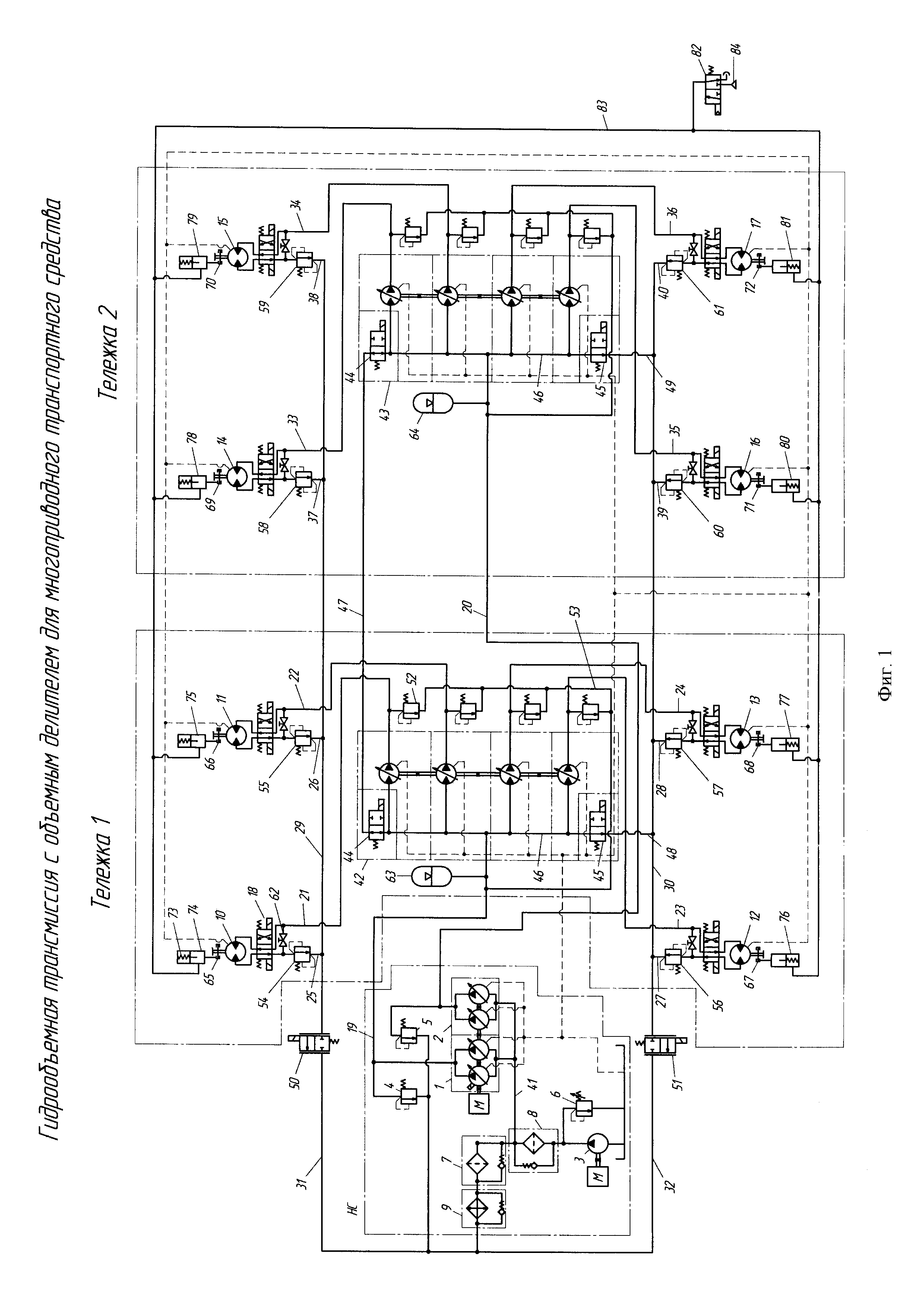 1. Гидрообъемная трансмиссия для многоприводного транспортного средства, оборудованного стояночными тормозами, включаемыми пружинами и выключаемыми пневмокамерами, содержащая насосную станцию, состоящую из групп регулируемых насосов высокого давления и подпиточного насоса, имеющих привод от теплового двигателя, предохранительные клапаны, фильтры и теплообменный аппарат, реверсивные плунжерные радиальные гидравлические мотор-колеса с регуляторами направления вращения, связанные с регулируемыми насосами высокого давления магистральными гидролиниями для подвода и отвода рабочей жидкости и образующие несколько циркуляционных гидравлических контуров, отличающаяся тем, что в каждый гидравлический контур, содержащий одну группу насосов высокого давления, установлен аксиальный делитель потока, объединяющий дифференциально и гидравлически в отдельный контур несколько гидравлических контуров привода реверсивных плунжерных радиальных мотор-колес, каждый аксиальный делитель имеет дополнительно секции, содержащие пилотные клапаны с электрическим управлением, при этом одна секция через пилотный клапан соединяет между собой общие полости для подвода жидкости каждого аксиального делителя в одну сообщающуюся линию, а другая секция соединяет через пилотный клапан перепускными гидролиниями эти же полости со сливными магистральными гидролиниями, в конце которых расположены гидравлические краны торможения с электрическим управлением, каждый гидравлический контур привода реверсивных плунжерных радиальных мотор-колес содержит предохранительный клапан, вмонтированный в подающую гидролинию между аксиальным делителем и радиальным мотор-колесом, переливная линия которого соединена с подающей магистральной гидролинией для подвода жидкости к аксиальному делителю, и клапан перепада давлений, расположенный в сливной гидролинии каждого плунжерного радиального мотор-колеса. 2. Гидрообъемная трансмиссия для многоприводного транспортного средства по п. 1, отличающаяся тем, что в каждом гидравлическом контуре привода реверсивных плунжерных радиальных мотор-колес подающая и сливная гидролинии соединены между собой через запорный элемент.