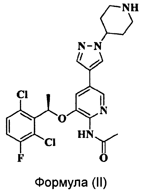 100 мг полученного N-ацетил-3-[(1R)-1-(2,6-дихлор-3-фторфенил)этокси]-5-[1-(4-N-Вос-пиперидил)-1Н-пиразола-4-ил]-2-пиридиламина растворяли в небольшом количестве дихлорметана. 2 мл раствора 4 н. HCl в диоксане добавляли при перемешивании при 0°С, полученную смесь перемешивали в течение 20 минут, и затем растворитель отгоняли при пониженном давлении. Добавляли 10 мл воды, и полученную смесь доводили с помощью бикарбоната натрия до рН=10, экстрагировали с применением дихлорметана и затем сушили, упаривали и очищали при помощи колоночной хроматографии с получением 71 мг белого твердого вещества (выход 85%). МС: m/е 492 (М+1).