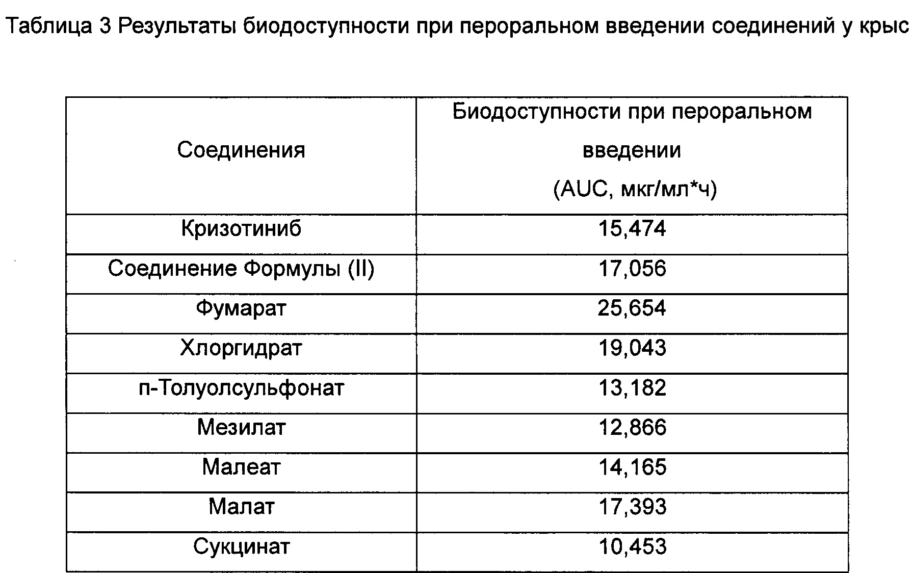 Двадцать семь здоровых самцов крыс линии Спрег-Доули, весом 200 г-220 г, кормили стандартным рецептурным гранулированным кормом для крыс ежедневно в определенное время. Крыс не кормили в течение 12 ч перед экспериментом и снова кормили через 4 часа после введения лекарственного средства. Крысы могли свободно пить воду до и после эксперимента, а также в ходе эксперимента. Крыс произвольным образом разделили на 9 групп. Однократная доза Кризотиниба была интрагастрально введена первой группе; однократная доза соединения Формулы (II) была интрагастрально введена второй группе; и однократные дозы соединения Формулы (III), и гидрохлорида, п-толуолсульфоната, мезилата, малеата, малата и сукцината соединения Формулы (II) были интрагастрально введены с третьей группы по девятую группу, соответственно. Все дозы, введенные 9 группам крыс, составляли 0,11 ммоль/кг, и от 0,2 до 0,3 мл крови отбирали из венозного сплетения глазного дна перед введением лекарственного средства (0 ч) и через 0,5 ч, 1 ч, 2 ч, 4 ч, 6 ч, 8 ч, 10 ч и 24 ч после введения лекарственного средства. Гепарин применяли для антикоагуляции крови, и кровь центрифугировали для отделения плазмы крови. 0,1 мл плазмы крови точно измеряли и добавляли в пробирку с замком Eppendorf, и затем добавляли 1,2 мл этилацетата. Полученную смесь равномерно перемешивали с высокой скоростью в течение 5 мин при помощи Вортекс-миксера и центрифугировали в течение 5 мин (8000 обмин-1). Надосадочную жидкость собирали, и растворитель выпаривали при 30°С азотом на приборе продувки азотом. Осадок растворяли в 100 мкл подвижной фазы, равномерно перемешивали с высокой скоростью в течение 1 мин при помощи Вортекс-миксера и центрифугировали в течение 5 мин (14000 об мин-1). 80 мкл надосадочной жидкости переносили в виалу для образца, и 10 мкл надосадочной жидкости вводили для определения при помощи ВЭЖХ, и регистрировали хроматограмму ВЭЖХ. Результаты показаны в Таблице 3: