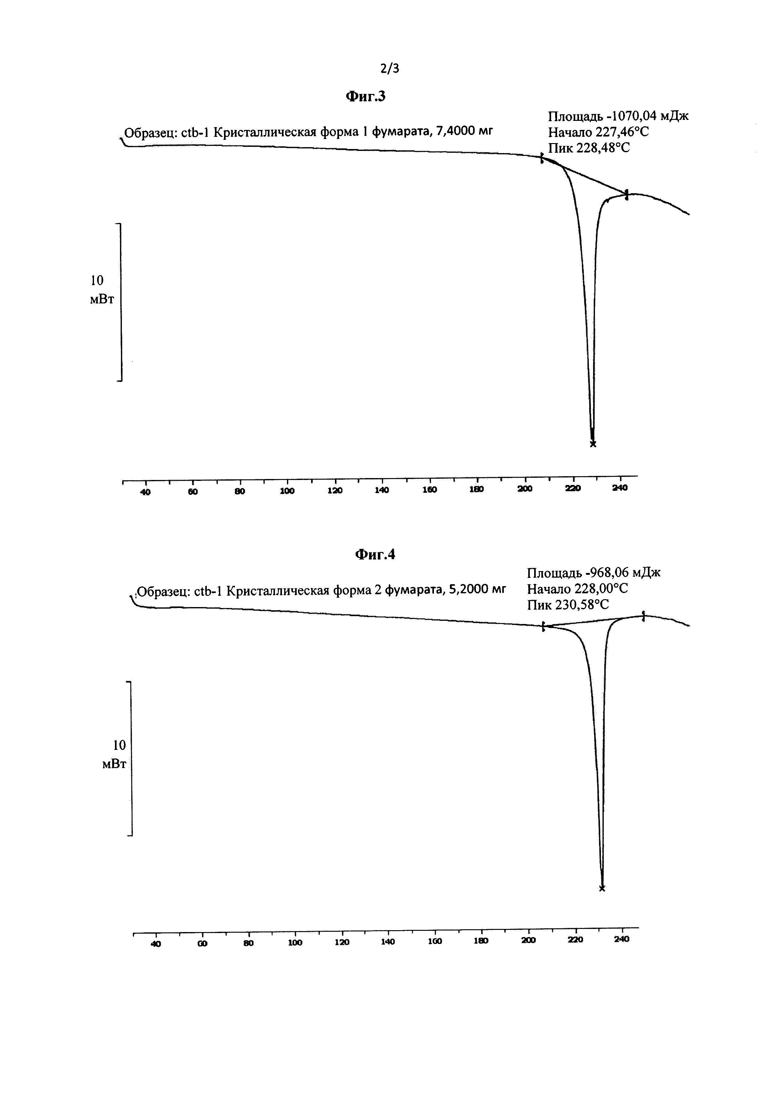 Фиг. 3 представляет собой термограмму дифференциальной сканирующей калориметрии (ДСК) кристаллической Формы А соединения Формулы (III), полученной в Примере 3.