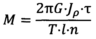 Угол закручивания участка вала 1 (фиг. 1), определяющий изменение времени между прохождением меток 4 относительно каждого из датчиков 5 и 6, определяется как величиной крутящего момента (М), так и геометрическими (Jρ, ) и упругой характеристикой (G) участка вала. Отсюда измеряемую величину вращающего момента на валу определяют по изменению времени между прохождением меток относительно каждого из датчиков, согласно зависимости