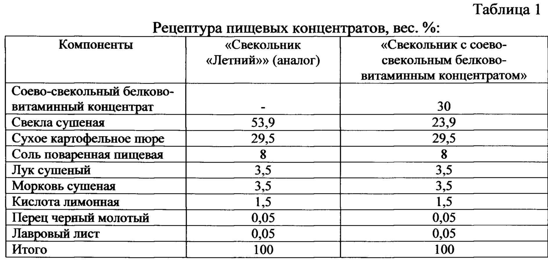 Изобретение относится к пищевой промышленности, в частности к производству пищевых концентратов первых обеденных блюд и может быть использовано при производстве концентратов функционального и специализированного назначения. Известен способ приготовления пищевого концентрата «Свекольник «Летний»», включающий подготовку сушеных овощей и дополнительных компонентов, их дозирование в количестве, предусмотренном рецептурой, смешивание, фасование и упаковку (В.Н. Гуляев, Н.В. Дремина и др. Справочник технолога пищеконцентратного и овощесушильного производства. - М.: Легкая и пищевая промышленность, 1984. - С. 26-99. Аналог). Недостатком данного способа является относительно не высокая пищевая и биологическая ценность готового продукта из-за низкого содержания жира, белковых, минеральных веществ и витаминов. Известен также способ приготовления пищевого концентрата «Свекольник», обогащенного натуральными экологически чистыми растительными компонентами, витаминами, минеральными солями, с улучшенным вкусом, включающий получение смеси, в состав которой входят: порошкообразная сухая бульонная основа, мука пшеничная, порошок квасного сусла и экстракт свекольного сока, в качестве наполнителя - высушенная при температуре 45-60°С и размолотая до порошкообразного состояния свекольная ботва (Патент РФ №2341158. Пищевой концентрат «Свекольник». МПК7 А23L 3/00, А23L 1/39. Прототип). Недостатком данного способа является незначительное содержание в готовом продукте белковых веществ и витаминов Е и С. Задачей настоящего изобретения является получение продукта в виде пищевого концентрата повышенной пищевой и биологической ценности. Технический результат заключается в том. что данный способ позволяет получить продукт, содержащий физиологически ценные ингредиенты, в т.ч. растительные белок и жир. минеральные вещества, витамины С и Е. а также янтарную кислоту. Это достигается тем. что в качестве белкового компонента в рецептуру пищеконцентратной смеси вводят соево-свекольный белково-витаминный концентрат в количестве до 30% обшей массы компонентов. Способ осуществляется следующим образом. Из семян сои и свежей свеклы столовой готовят соево-свекольный белково-витаминный концентрат. Для этого в равных количествах смешивают подготовленное соевое зерно и свежую свеклу, дезинтегрируют их в воде. получая, таким образом, соево-свекольный экстракт и проводят коагуляцию в нем белковых веществ комбинированным коагулянтом -композицией аскорбиновой и янтарной кислот, взятых в соотношении 1:1, отделяют белково-витаминный сгусток, формуют гранулы, которые сушат до влажности не более 10%. Одновременно подготавливают сухое картофельное пюре, сушеные свеклу, морковь и луж, соль поваренную пищевую, лимонную кислоту, перец черный молотый и лавровый лист. Компоненты загружают в смеситель в следующей последовательности: сушеные овощи, соево-свекольный белково-витаминный концентрат, сухое картофельное пюре, соль поваренная пищевая, лимонная кислота и пряности, тщательно перемешивают до получения однородной массы с равномерно распределенными в ней компонентами. Полученную смесь фасуют и упаковывают. Пример 1 Семена сои моют и замачивают в воде для набухания и размягчения. Свеклу свежую моют, очищают от кожицы и режут на кусочки. Замоченные семена сои смешивают 