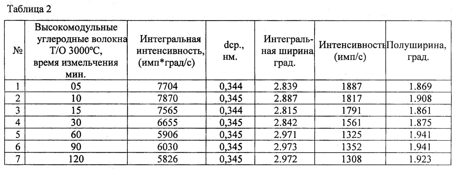 Способ исследования различий структурного состояния углеродных волокон после различных термомеханических воздействий методом рентгеноструктурного анализа, включающий пробоподготовку, установку образца в держателе рентгеновской установки с острофокусной рентгеновской трубкой предпочтительно с «Со» анодом, с изогнутым координатно-чувствительным детектором и с одновременной регистрацией дифракционной картины в большом интервале углов, отличающийся тем, что пробоподготовка заключается в приготовлении порошка измельченных образцов углеродных волокон, прошедших высокотемпературную обработку при разных режимах термообработки и температурах, включает в себя резку жгута углеродного волокна до размера не более 2 мм, измельчение в шаровой мельнице в течение 12-15 мин, рассеивание полученного порошка до фракции -50/+40 мкм, а также в других размольных агрегатах, позволяющих получить порошок углеродного волокна данной фракции, установка образца в держателе производится подпрессовкой полученной фракции порошка в кювете под давлением 0,2 МПа, при этом съемка дифрактограмм производится с полным набором рефлексов, во всем диапазоне углов.