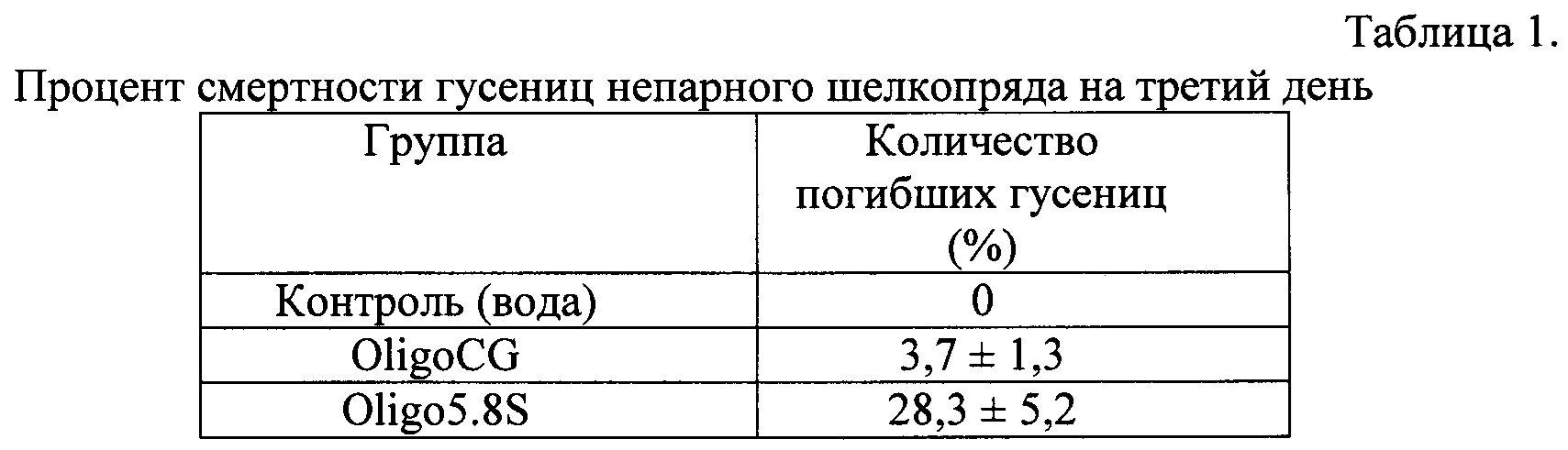 Изобретение относится к области борьбы с листогрызущими насекомыми на личиночной стадии развития. Непарный шелкопряд (Lymantria dispar (Lepidoptera: Lymantriinae)), являясь полифагом, относится к числу серьезных вредителей древесных и кустарниковых пород растений Северного полушария. Периодические вспышки массового размножения непарного шелкопряда наблюдаются ежегодно в тех или иных частях его ареала. Довольно часто они носят местный характер и образуются на небольших площадях, иногда же распространяются на огромных пространствах, захватывая несколько ландшафтно-географических зон, нанося существенный экономический ущерб. На сегодняшний день остро требуются эффективные препараты для контроля численности непарного шелкопряда в Хабаровском крае, Алтайском крае, Тюменской области, Курганской области и других регионах Российской Федерации. Общий объем средств, необходимый для регуляции численности непарного шелкопряда по оценкам, сделанным через доступные ресурсы в открытой печати и Интернете, позволяют говорить о сумме, превышающей 1 миллиард рублей в год. Сумма ущерба от неконтролируемого роста численности непарного шелкопряда оценивается в сотни раз больше, чем предупредительные меры борьбы, в частности для лесозаготовительных предприятий. Чаще всего в борьбе с непарным шелкопрядом применяют доступные, но неизбирательные в действии химические препараты - пиретроиды, фосфорорганические соединения, карбаматы, ингибиторы синтеза хитина, неоникотиноиды. Биологическая регуляция численности непарного шелкопряда происходит реже и основана на использовании избирательных в действии, но дорогих препаратов на основе вируса ядерного полиэдроза непарного шелкопряда и бактерии Bacillus thuringiensis. На сегодняшний день на стадии разработки для борьбы с листогрызущими насекомыми находятся препараты на основе коротких немодифицированных антисмысловых ДНК-олигонуклеотидов, которые способны объединить наилучшие характеристики современных препаратов - доступность и избирательность. Это связано с тем, что синтез ДНК становится все более недорогим, а комбинация азотистых оснований в каждом отдельном ДНК-олигонуклеотиде (ДНК-инсектициде) уникальна и обеспечивает безопасность для нецелевых организмов. Кроме этого, ДНК является полимером природного происхождения и не будет накапливаться в окружающей среде. Известен способ борьбы с непарным шелкопрядом при помощи химического инсектицида - димилина [Berry, R.E., Moldenke A.F., Miller J.C., Wernz J.G. (1993). Toxicity of diflubenzuron in larvae of gypsy moth (Lepidoptera: Lymantriidae): effects of host plant. Journal of Economic Entomology. V. 86, P. 809-814], в котором используются действующее вещество дифторбензурон, нарушающее процессы хитинообразования, что приводит к появлению нежизнеспособных особей, имеющих истонченные покровы и погибающих в результате разрыва кутикулы и излияния гемолимфы в период линьки или вскоре после нее. Недостатками этого метода является то, что дифторбензурон не обладает избирательностью в действии и способен уничтожить нецелевых насекомых, включая полезных и хищных насекомых, а также навредить позвоночным животным (стимулировать возникновение рака, снижать уровень тестостерона, вызывать раздражение глаз) и иметь продолжительный негативный эффект на членистоногих, живущих в водоемах. В лесных экосистемах дифторбензурон способен сохранятьс