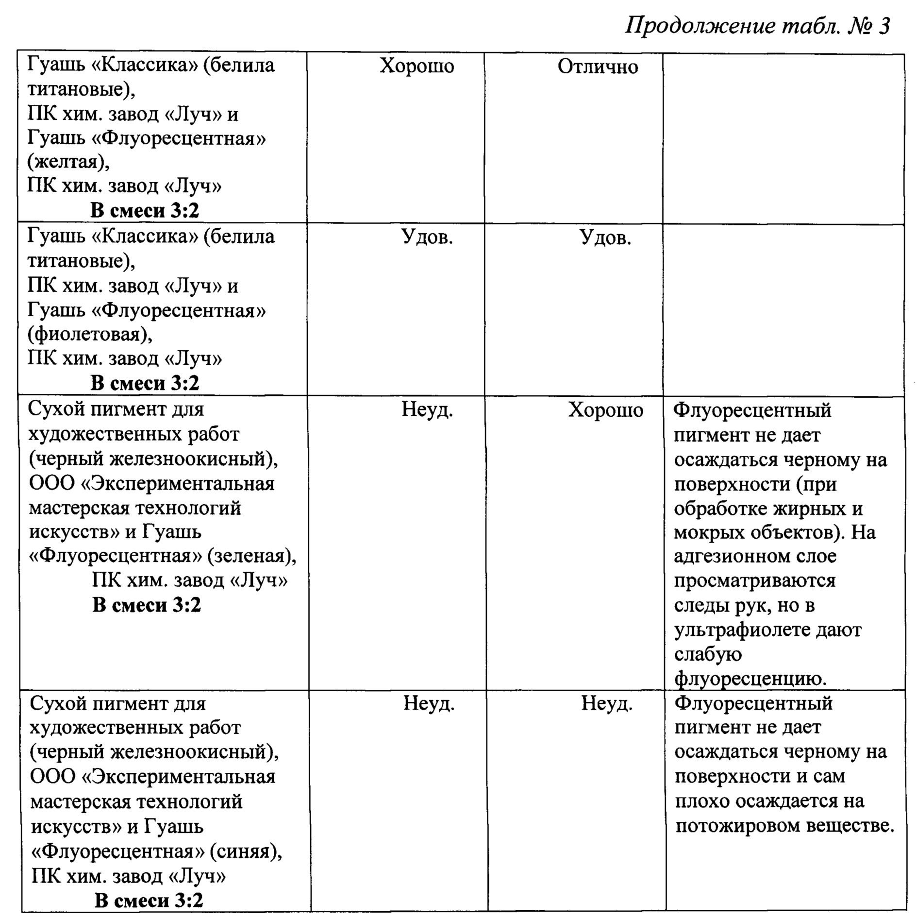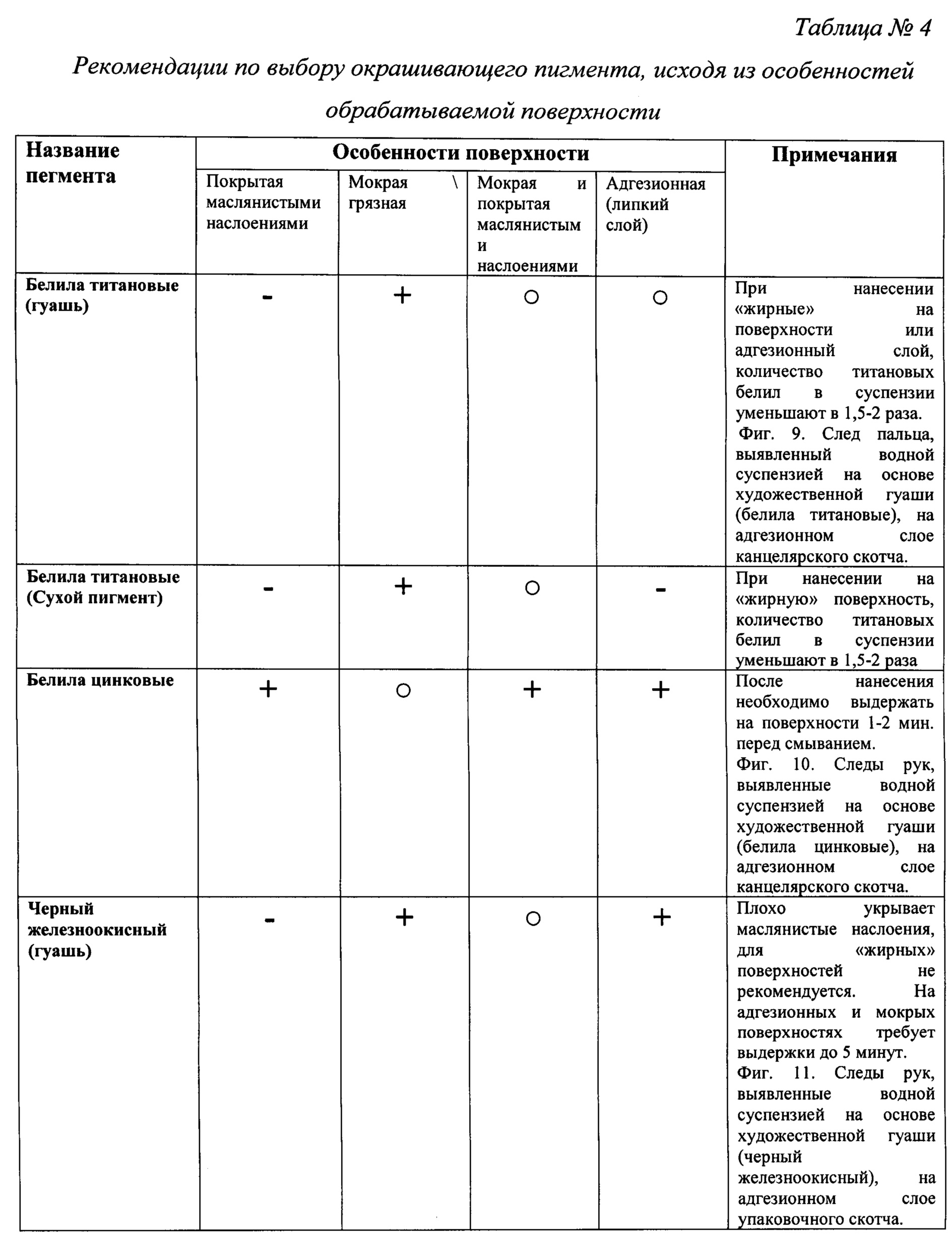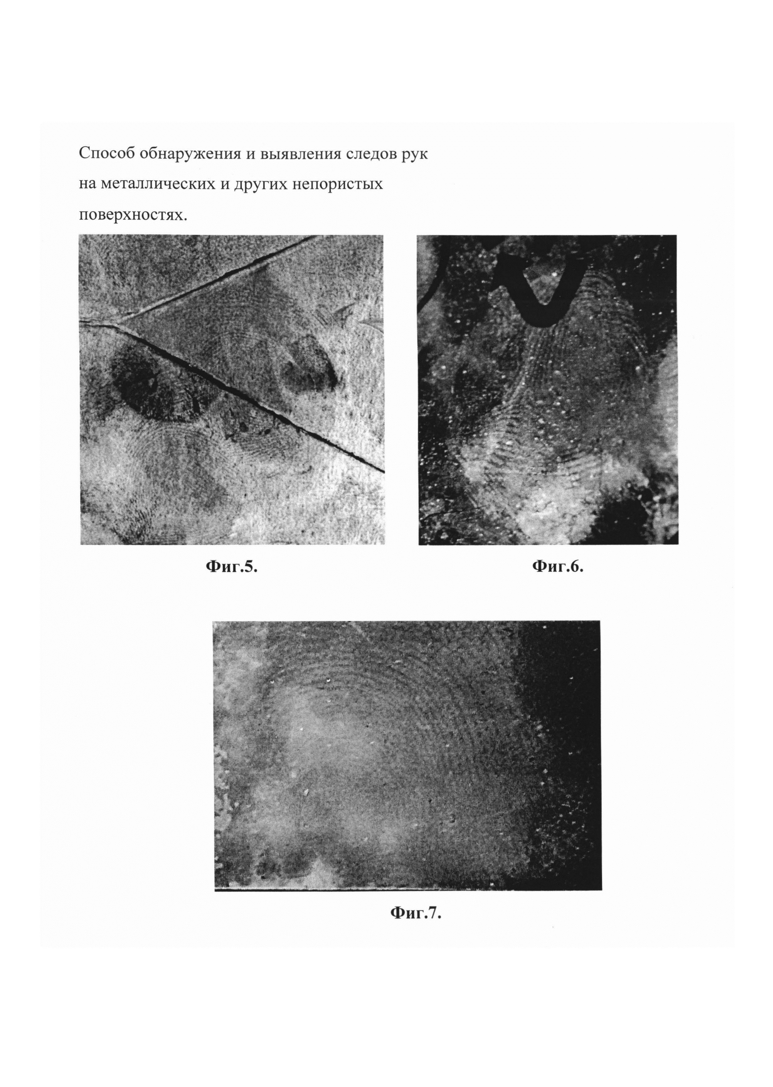 Изобретение относится к криминалистике, судебной медицине и может быть использовано для обнаружения и выявления следов рук для проведения дактилоскопических исследований. Для этого обрабатывают исследуемую загрязненную «жирную» поверхность со следами рук из пульверизатора или погружением в сосуд, где происходит нанесение суспензии состоящей из окрашивающего вещества, ополаскивателя и дистиллированной воды с дальнейшим УФ воздействием. Изобретение направлено на создание эффективного и доступного способа выявления следов пальцев и ладоней рук. Суспензия состоит из окрашивающего вещества (ОВ), ополаскивателя (ОП) (жидкое моющее средство) и дистиллированной воды (ДВ) в соотношении как (1-5):1:(1-20) соответственно, где в качестве (1-5) окрашивающих веществ используются художественные водорастворимые краски (гуаши) и «сухие» пигменты, что позволяет получать качественные контрастные следы рук без использования расчистки дактилоскопической кистью на «жирных» загрязненных металлических и других непористых поверхностях, время воздействия суспензии 1-5 минут, при этом металлические и другие непористые поверхности со следами рук были подвергнуты неблагоприятному воздействию внешней среды: низкие и высокие температуры от - 18°C до +40°C, высокая влажность (вода, снег, лед, грязь), и оружейная смазка, а следы могут быть любой давности с ледообразования. Свойства следовоспринимающей поверхности оказывают существенное влияние на эффективность выявления следов различными методами. При всем многообразии, эти поверхности можно объединить в девять основных групп: гладкие непористые поверхности, бумага и картон; пластический упаковочный материал; мягкий винил (ПВХ); резина и кожа; металл (незащищенный); неполированное дерево; воск и провощенные поверхности, поверхности, покрытые слоем клея. Среди перечисленных основных групп названа металлическая поверхность и вощенные поверхности, на которых проводились испытания. Правильно зафиксированные и изъятые с места происшествия следы рук на металлических и других непористых поверхностях, находящихся в снегу, при низкой температуре, загрязненных оружейной смазкой и т.д. (т.е. подвергнувшихся воздействию окружающей среды), дают возможность раскрыть преступление даже по истечении длительного времени с момента его совершения. Успех работы со следами зависит от множества факторов, основной среди которых - обнаружение, фиксация и изъятие следов рук в процессе осмотра места происшествия. Выявление следа может быть результатом комплексного использования способов: от слабовидимых путем наблюдения и контрастных после проведения соответствующей обработки, например, дактилоскопическими порошками. Физические и физико-химические методы основаны на свойствах адгезии и избирательной адсорбции вещества следа. Метод, где используются ультрафиолетовые и инфракрасные лучи применяется при обнаружения старых, а также невидимых следов на многоцветных объектах и является универсальным, т.е. может быть применен как на месте, так и в лабораторных условиях. В ультрафиолетовых лучах выявляются невидимые и слабо видимые следы рук, образованные люминесцирующими дактилоскопическими порошками. Известны физические методы выявления следов рук на различных поверхностях (Типовые экспертные методики иссле