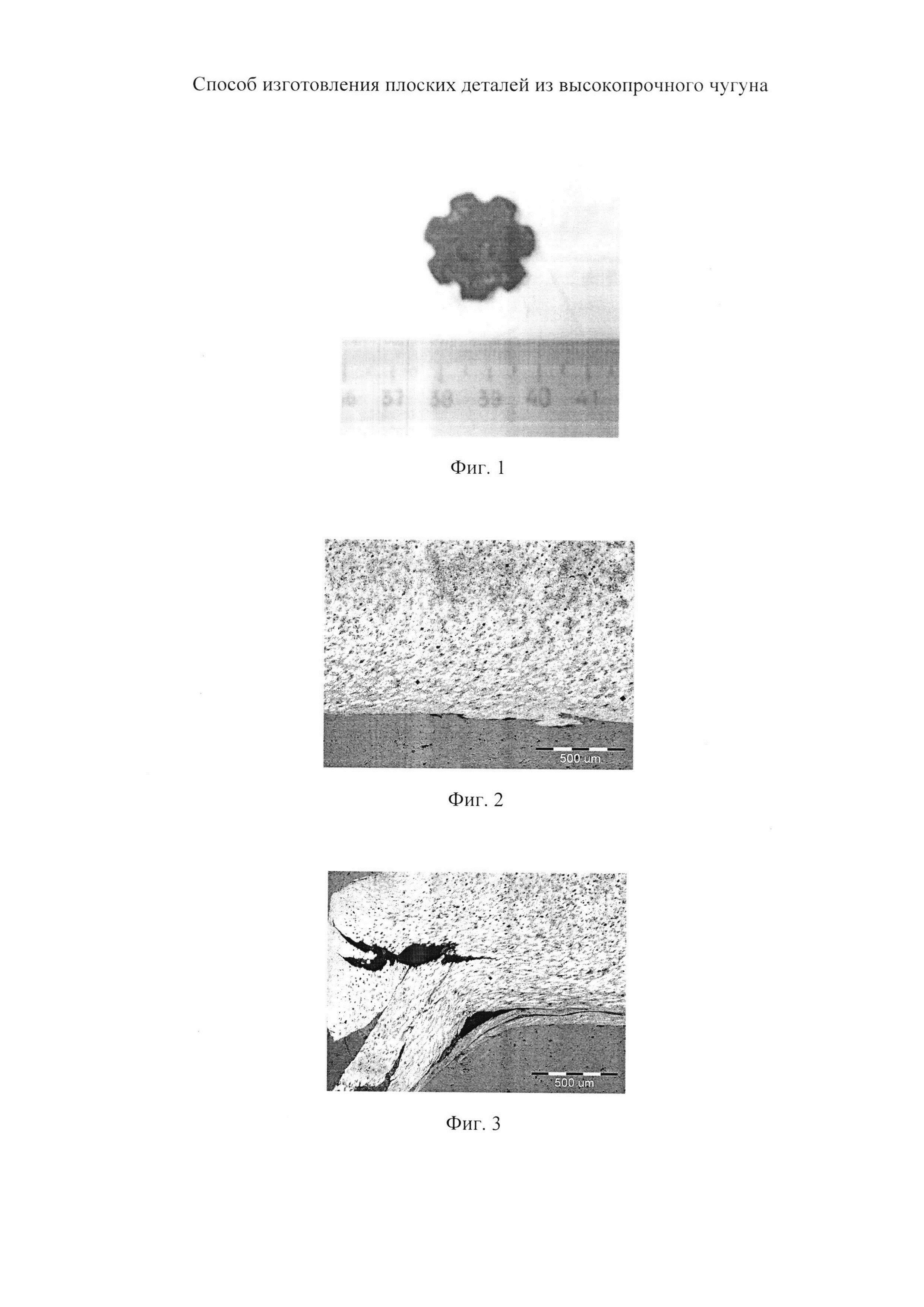 Изобретение относится к машиностроению, в частности к области обработки металлов давлением, и может быть использовано при изготовлении плоских деталей из высокопрочного чугуна для дальнейшего изготовления из них штампованных изделий. Предварительно нагретую трубную заготовку осаживают на прессе плоскими бойками в поперечном направлении с получением сдвоенной плоской заготовки. Затем у полученной сдвоенной заготовки срезают зоны перегиба. Нагрев осуществляют до температуры Т, удовлетворяющей неравенству 950°C<T<T. Плоские бойки нагревают до температуры Т, удовлетворяющей неравенству Т<Т<Т. T- температура солидус высокопрочного чугуна, Т- температура начала фазовых превращений аустенита в мартенсит в высокопрочном чугуне. В результате обеспечивается повышение производительности способа изготовления плоских деталей из высокопрочного чугуна за счет снижения количества переходов. 3 ил., 1 пр.
