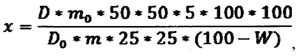 Способ количественного определения суммы флавоноидов в траве монарды дудчатой, с предварительным получением водно-спиртового извлечения из травы монарды дудчатой путем экстракции 1 г точной навески измельченной до частиц 1 мм травы монарды дудчатой этиловым спиртом, в пересчете на вещество флавоноидной природы, методом дифференциальной спектрофотометрии, отличающийся тем, что экстракцию сырья осуществляют однократно, в качестве экстрагента используют этиловый спирт в концентрации 60% в соотношении «сырье-экстрагент» - 1:50, количественное определение суммы флавоноидов в траве монарды дудчатой проводят при длине волны 394 нм в пересчете на цинарозид и содержание суммы флавоноидов (X в %) в пересчете на цинарозид и абсолютно сухое сырье рассчитывают по формуле где D - оптическая плотность испытуемого раствора; D0 - оптическая плотность раствора Государственного стандартного образца цинарозида; m - масса сырья, г; m0 - масса Государственного стандартного образца цинарозида, г; W - потеря в массе при высушивании, %; в случае отсутствия стандартного образца цинарозида используют теоретическое значение его удельного показателя поглощения, равное 350, и содержание суммы флавоноидов (X в %) рассчитывают по формуле где D - оптическая плотность испытуемого раствора; m - масса сырья, г; 350 - удельный показатель поглощения W - потеря в массе при высушивании, %.