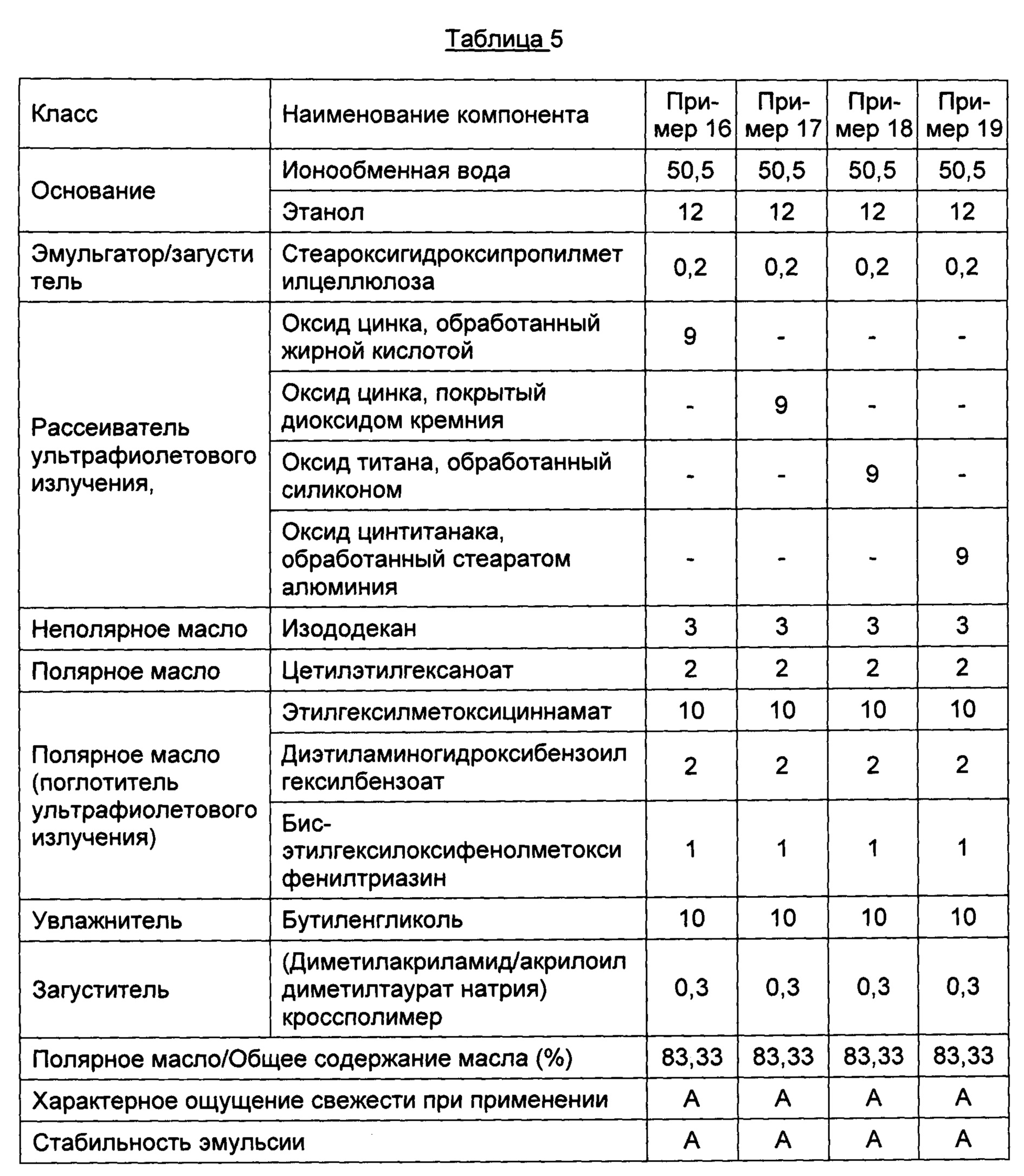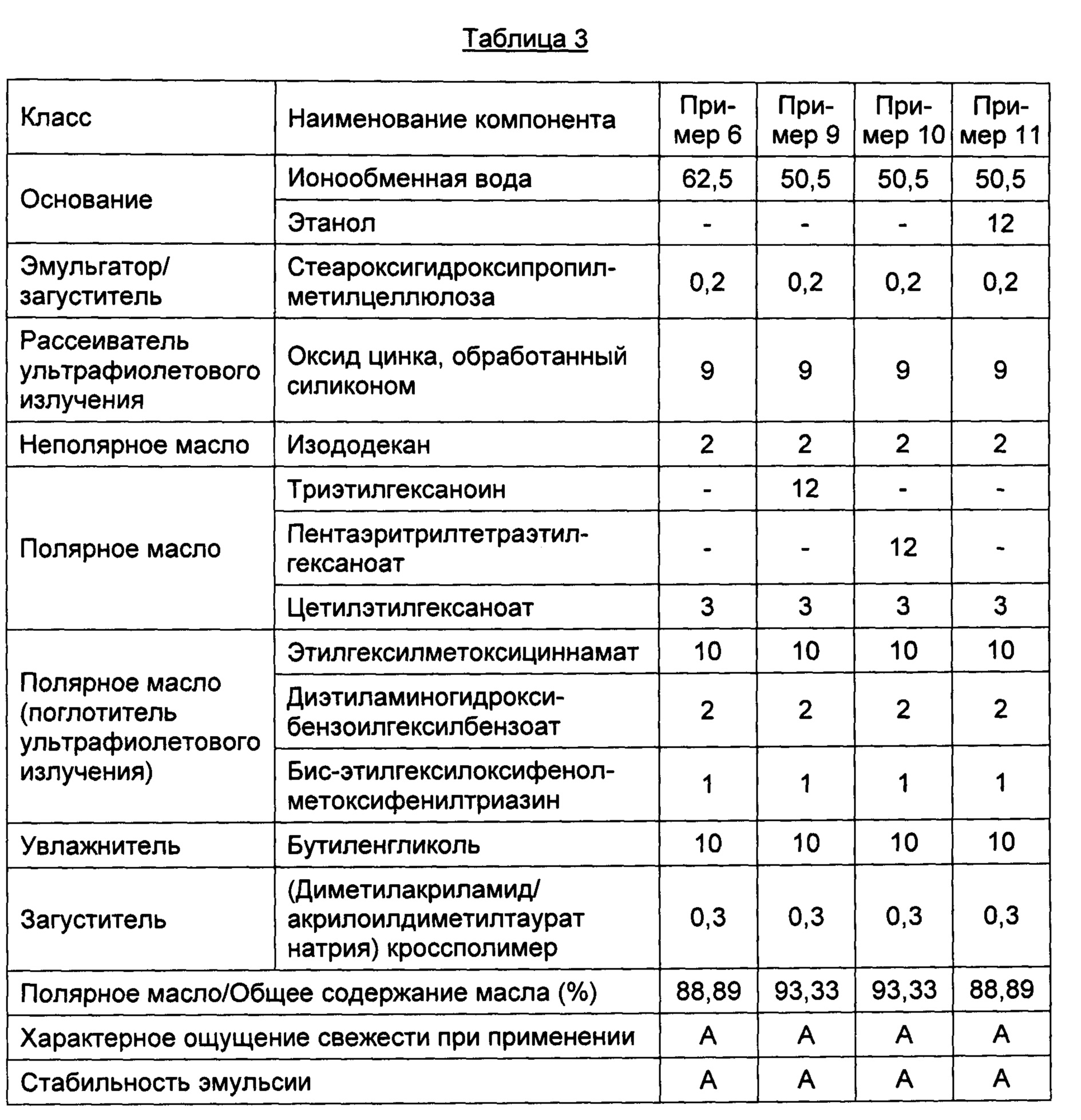 ОБЛАСТЬ ТЕХНИКИ Настоящее изобретение относится к косметическому средству в форме эмульсии типа "масло в воде", в частности, к солнцезащитному косметическому средству, содержащему поглотитель ультрафиолетового излучения и рассеиватель ультрафиолетового излучения, обеспечивающему помимо характерного ощущения свежести при применении высокую защитную способность от ультрафиолетового излучения (SPF, англ. sun protection factor - солнцезащитный фактор). ПРЕДШЕСТВУЮЩИЙ УРОВЕНЬ ТЕХНИКИ Косметическое средство в форме эмульсии типа "масло в воде" широко используется в качестве основного материала для обеспечения ощущения свежести при применении в отличие от эмульсии типа "вода в масле". Однако при добавлении в их внутреннюю фазу (масляную фазу) порошкообразных веществ, в частности, гидрофобно обработанных порошков, эмульсионная система во многих случаях становится нестабильной. В качестве одного из способов стабилизации эмульсионной системы используют водорастворимый загуститель, увеличивающий вязкость внешней фазы (водной фазы) базового материала типа "масло в воде". Однако проблема заключается в том, что происходит уменьшение вязкости водной фазы за счет вымывания ионов из гидрофобно обработанного порошка, добавленного во внутреннюю фазу (масляную фазу), и т.п., что приводит к дестабилизации и является причиной налипания (Патентный документ 1). В Патентном документе 1 раскрыто, что такое вымывание можно предотвратить с помощью прочного покрытия поверхности неорганического порошка. В качестве других способов стабилизации были предложены способы с использованием низковязких масел, способствующих диспергированию порошка (дисперсионной среды), или диспергирующих агентов. Например, в Патентном документе 2 описано, что гидрофобно обработанный рассеиватель ультрафиолетового излучения (оксид цинка) стабильно замешивали в масляную фазу с помощью летучего масла и жидкой высшей жирной кислоты (дисперсионной среды) и силикона, имеющего в структуре карбоксильную группу, или сложного эфира сахаров (диспергирующего агента). Однако (летучие) неполярные масла, такие как низковязкие углеводородные масла или силиконовые масла, широко применяются в качестве дисперсионных сред, добавляемых для диспергирования порошков, причем было известно, что использование полярных масел во внутренней фазе увеличивает степень распространения в масляную фазу гидрофильных групп в поверхностно-активном соединении и тем самым затрудняет эмульгирование. Другими словами, для получения высокой защитной способности от ультрафиолетового излучения необходимо добавлять высокополярный поглотитель ультрафиолетового излучения и, в некоторых случаях, полярное масло, выступающее в качестве его растворителя, что, в то же время, влечет за собой необходимость включения неполярного масла в качестве дисперсионной среды для стабильного эмульгирования масляной фазы, содержащей рассеиватель ультрафиолетового излучения, так что было крайне сложно сокращать общее содержание масла, сохраняя при этом высокую защитную способность от ультрафиолетового излучения. Например, в Патентном документе 3 описано, что была получена стабильная эмульсия при использовании 2-этилгексил-2-этилгексаноата и/или изононил-2-этилгексаноата в качестве эмульгатора в системе, в которой 