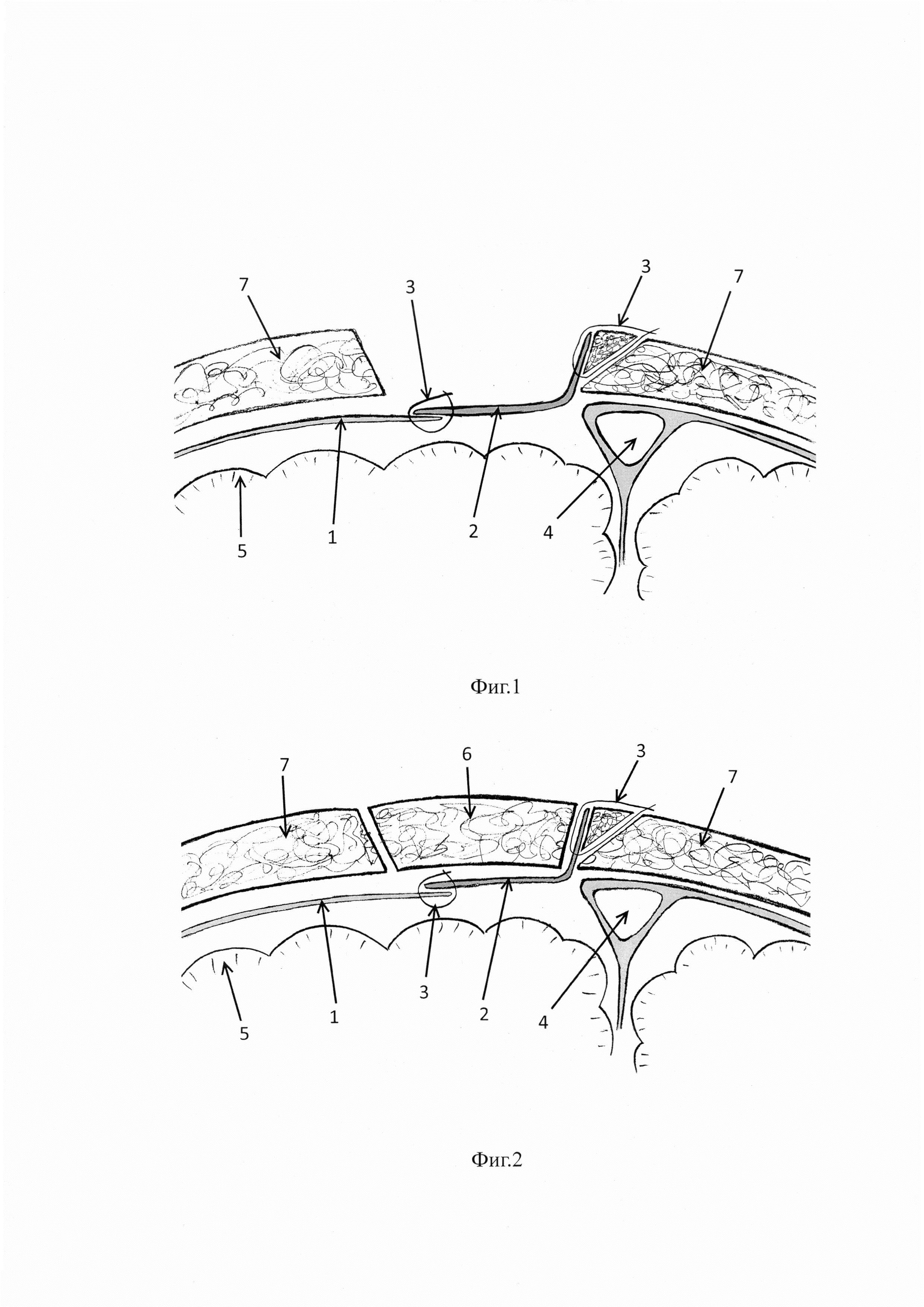 Способ пластики дефекта твердой мозговой оболочки и герметизации субдурального пространства в области костного дефекта свода черепа Изобретение относится к области медицины, в частности, к областям нейрохирургии и оперативной хирургии и может быть использовано для выполнения пластики дефектов твердой оболочки головного мозга, прилежащих к венозным синусам твердой мозговой оболочки, при операциях на головном мозге. Нарушение целостности твердой мозговой оболочки при плановых и экстренных оперативных вмешательствах на головном мозге, создавая сообщения субдурального пространства с окружающей средой, обуславливает риск развития послеоперационной наружной и скрытой ликвореи, внутричерепных инфекционных осложнений. Наличие операционных дефектов твердой оболочки головного мозга повышает риск истечения цереброспинальной жидкости в послеоперационном периоде, препятствует своевременному заживлению операционной раны, способствует формированию оболочечно-мозгового рубца, в ряде случаев влечет за собой необходимость повторного нейрохирургического вмешательства, ухудшает качество жизни пациента, увеличивает сроки его нахождения в стационаре и повышает стоимость лечения. В связи с этим разработка способов пластики твердой мозговой оболочки остается одной из актуальных задач современной нейрохирургии. Классическим способом восстановления целостности твердой мозговой оболочки является ушивание ее дефекта, либо использование ауто-, алло- или ксенотрансплантантов для закрытия дефекта, герметизация с использованием клеевых композиций. Известен способ пластики дефектов твердой мозговой оболочки у края костного дефекта, при котором рекомендуется увеличивать костный дефект за счет резекции кости, чтобы получить доступ к краю оболочки, оказавшемуся во время оперативного вмешательства под костью, для фиксации трансплантата к нему (Кушель Ю.В., Семин В.Е. Краниотомия. - М: Новое время, 1998. - 76 с.). Недостатки способа: увеличение площади трепанационного дефекта, превышающего по размерам выпиленный костный лоскут, что не позволяет выполнить краниопластику аутокостью (ввиду нарушения конгруэнтности костного лоскута и краев трепанационного дефекта), увеличение общей продолжительности операции, увеличение риска повреждения прилегающих венозных синусов твердой мозговой оболочки и развития угрожающей жизни кровопотери. Наиболее близким к заявляемому является способ замещения дефекта твердой мозговой оболочки (Старых B.C., Гинзбург Е.Р. RU 2 201 163 С1, 27.03.2003), принятый за прототип. Для трансплантата твердой мозговой оболочки используют одноименную брефоткань размером больше дефекта черепа. Проводят просверливание в кости у края дефекта черепа. Подводят трансплантат оболочки под края кости в дефекте. Прикрепляют центр трансплантата оболочки нитями из длительно рассасывающегося материала через каналы, просверленные в центре пластины. Закрывают костный дефект пластиной и фиксируют ее лигатурами к костям через просверленные в них каналы. При этом сначала к дефекту черепа в ране прикладывают стерильную прозрачную и упругую пленку и на ее поверхность наносят метки контуров дефекта черепа и отверстий просверленных каналов в костях и в пластине. Затем трансплантат оболочки вместе с приложенной к нему пленкой вырезают 