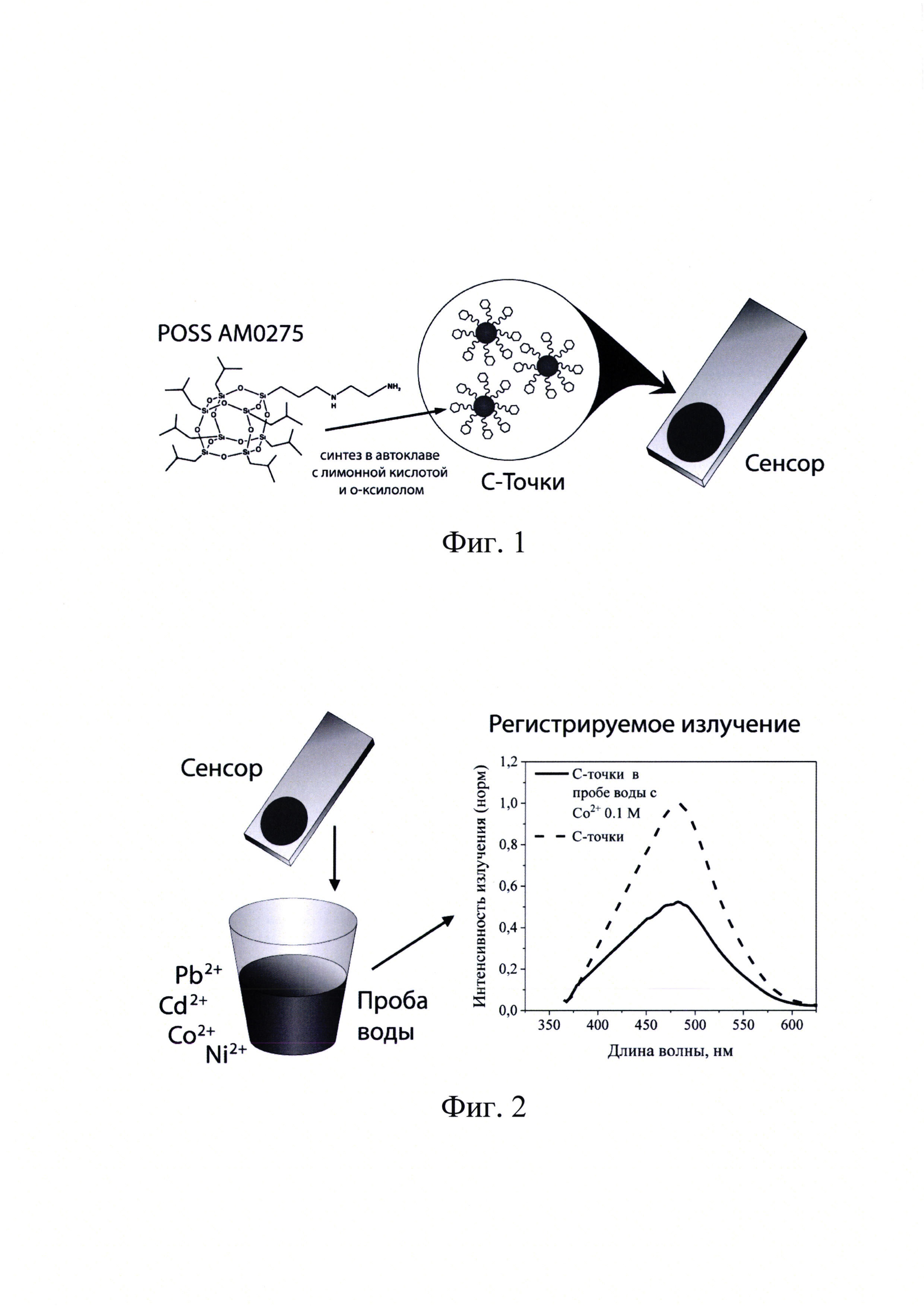 Изобретение относится к области измерительной техники и касается люминесцентного сенсора для определения концентрации ионов тяжелых металлов в воде. Сенсор включает в себя стеклянную пластину, на которую нанесены полученные методом автоклавируемого синтеза углеродные точки (С-точки), покрытые оболочкой аминоэтиламинопропилизобутилом полиэдрического олигомерного силсесквиоксана (ПОС). При погружении сенсора в пробу воды двухвалентные ионы тяжелых металлов связываются с поверхностью С-точек в ПОС-оболочке. По степени изменения интенсивности люминесценции по сравнению с предварительно зафиксированной люминесценцией сенсора до опускания в раствор определяют наличие и концентрацию ионов тяжелых металлов в пробе. Технический результат заключается в упрощении процесса изготовления, увеличении срока эксплуатации и повышении чувствительности сенсора. 2 н.п. ф-лы, 2 ил.