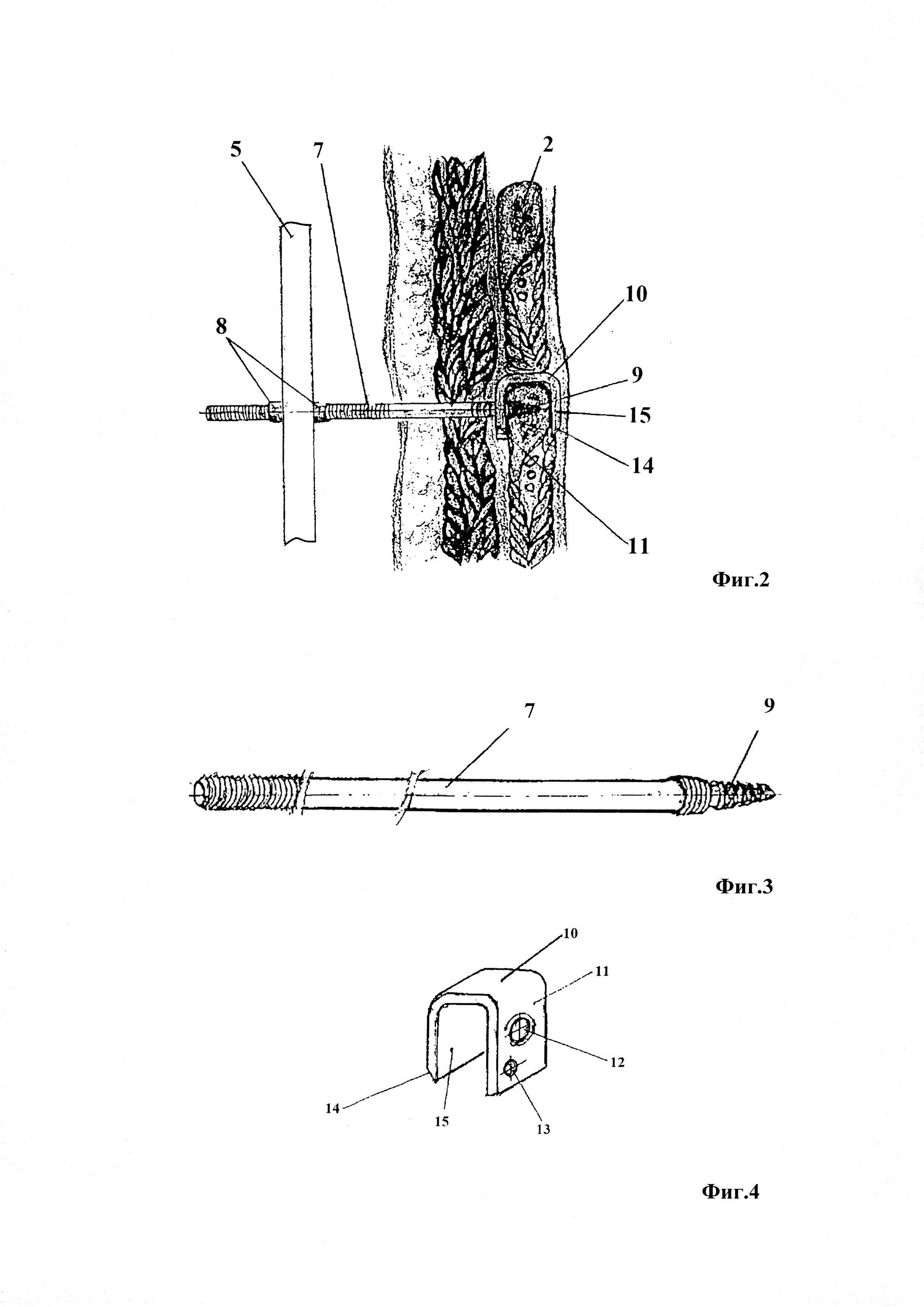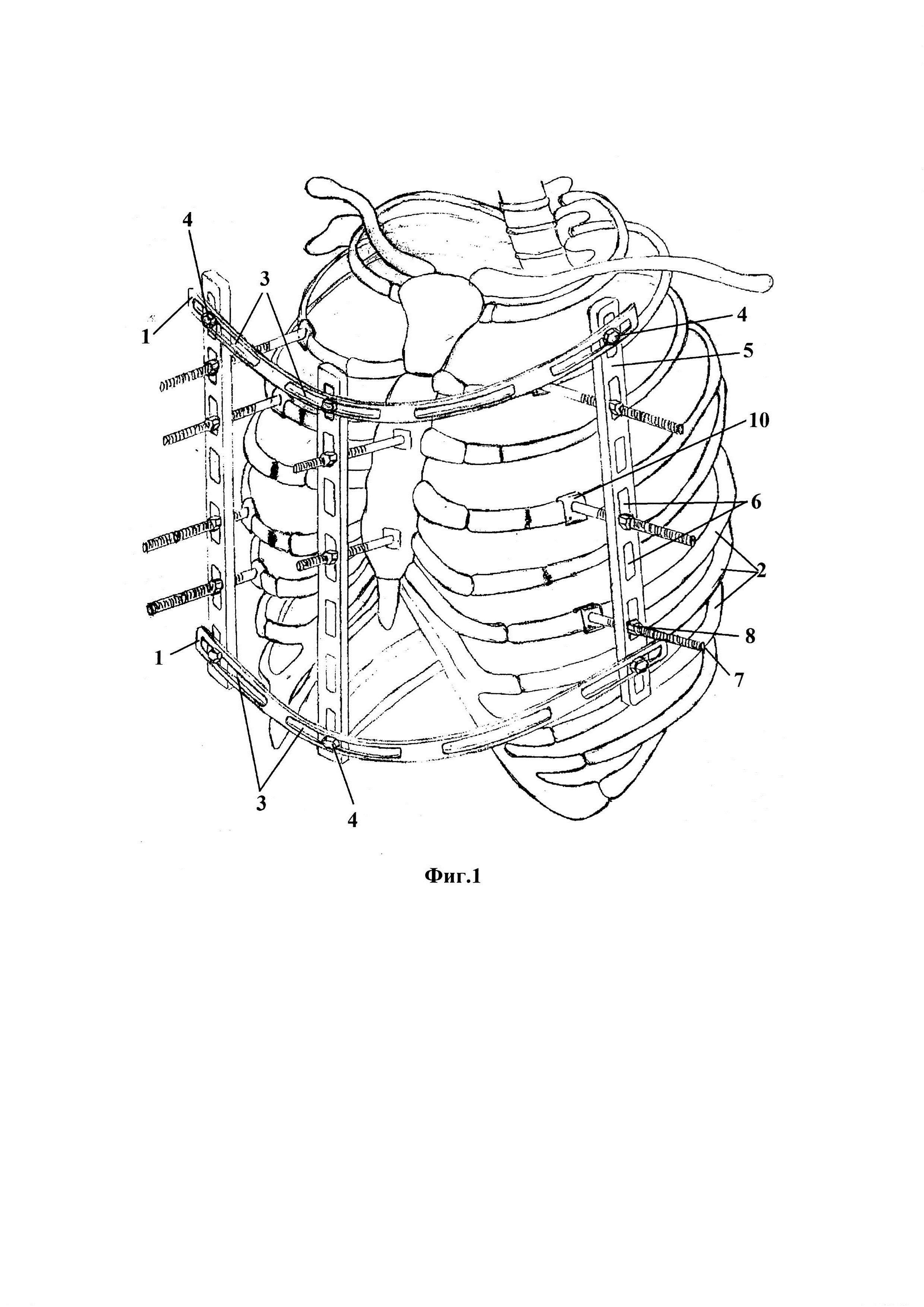 Изобретение относится к медицине, а именно к травматологии и ортопедии, и может быть использовано для остеосинтеза при множественных флотирующих переломах ребер. Частота и тяжесть повреждения грудной клетки в последние годы имеет тенденцию к увеличению, на ее долю приходится до 35-50% от всех травм. Механизм переломов ребер следующий: сначала происходит перелом в месте приложения силы от переразгибания ребра, затем, на противоположной стороне - от сгибания. Имеет значение и площадь приложения силы. При множественных переломах ребер по двум, и более, линиям возникает флотирующая реберная панель с нарушением каркасности грудной клетки, и невозможностью создать в ней отрицательное давление из-за парадоксальных движений участков грудной стенки. При этом реберный клапан западает на вдохе и выбухает на выдохе. Столь грубые расстройства биомеханики дыхания за короткий срок могут вызвать "плевро-пульмональный шок" и респираторный дистресс-синдром (РДС) который быстро завершается терминальным отеком легких. Известен способ лечения множественных двойных переломов ребер, заключающийся в использовании вытяжения с помощью пулевых щипцов за флотирующий реберный клапан через блоки на раме Брауна [1]. Недостатком способа является сложность и высокая травматичность, большое количество осложнений и крайнее неудобство для больного. Большое количество осложнений в предложенном способе связано с необходимостью фиксации реберного клапана пулевыми щипцами за ребра, при этом возможно повреждение сосудисто-нервного пучка, проходящего по нижнему краю ребер. Известен также способ лечения множественных двойных переломов ребер и устройство для его осуществления [2]. Он включает в себя изготовление шины из термопластической пластины, путем ее нагревания, прикладывание к грудной клетки, причем размер шины должен превышать площадь флотирующего реберного клапана. Реберный клапан фиксируют нитями через отверстия в изготовленной шине лигатурами, проведенными через мышцы грудной клетки и надкостницу в проекции реберного клапана и в области неповрежденных ребер. Концы лигатур проводят в соседние отверстия шины, расположенные ближе к местам выхода лигатур на поверхность грудной клетки. Связывают концы каждой лигатуры поверх шины, которую фиксируют к грудной клетке. Основные недостатки: громоздкость, неудобство для больного, возможность смещения шины с течением времени и при движениях пациента, или транспортировке. Учитывая то, что указанная шина изготовлена из синтетического материала, возможна опрелость кожных покровов под ней, возможность же перевязки выхода лигатур из мягких тканей исключается из-за того, что предлагаемое устройство не съемное. Кроме того, стабильная фиксация фрагментов ребер и репозиция двойных переломов данным устройством затруднительна т.к. дистракционное усилие, создаваемое через лигатуры, проведенные через мягкие ткани, недостаточно и может приводить к прорезыванию лигатур. Наиболее близким, по своему техническому решению, является способ миниинвазивного остеосинтеза флотирующих переломов ребер [3], заключающийся в введении стержней на всю толщину ребра, через предварительно просверленные отверстия, накладывают поперечно изогнутую пластину на поврежденное ребро и, закрепляют с помощью гаек на стержнях