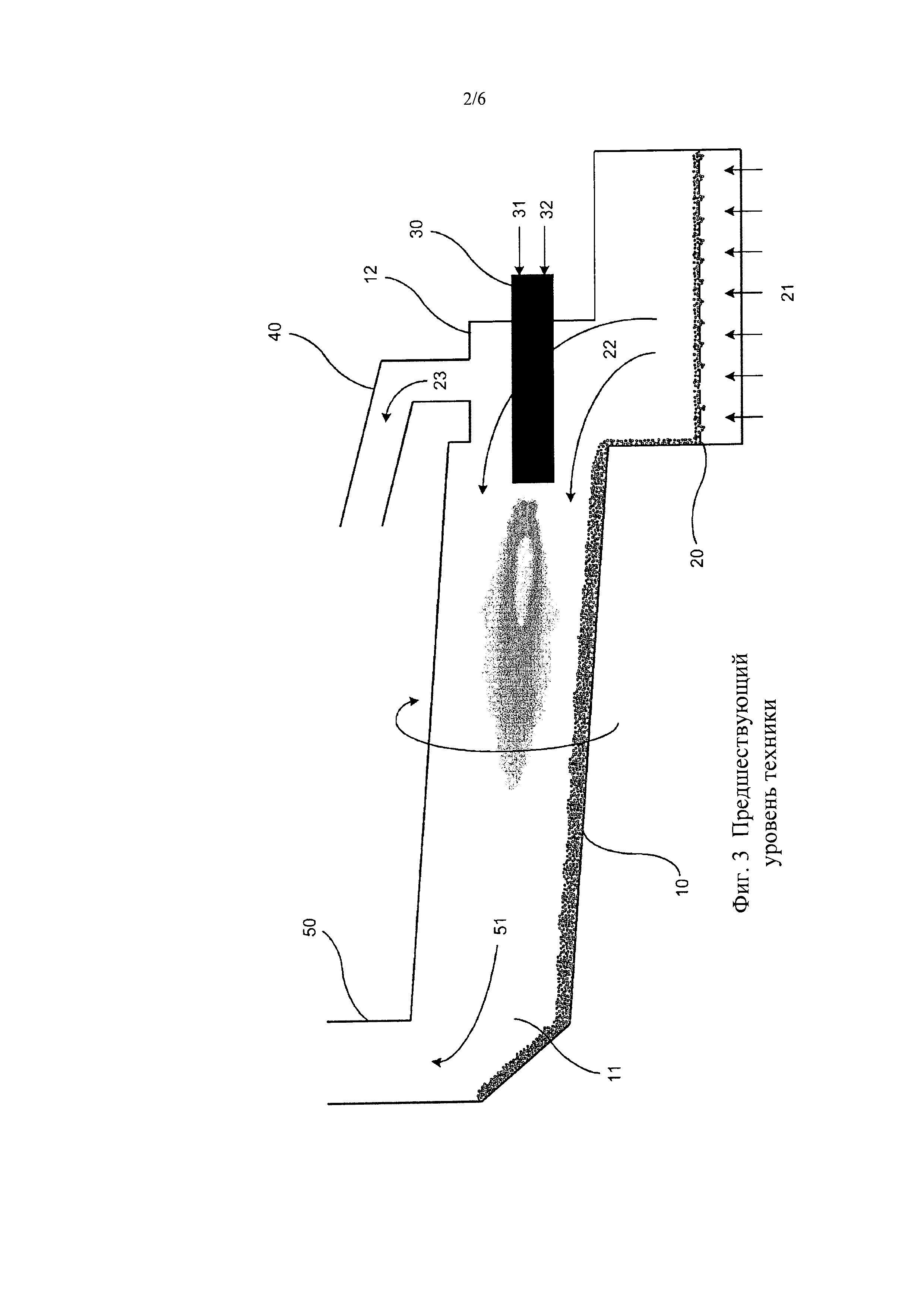 Настоящее изобретение относится к вращающимся печам для производства гидравлических связующих, таких как цемент и известь. Такие вращающиеся печи имеют, в целом, по существу цилиндрическую форму, при этом длина цилиндра намного больше его ширины. Печь вращается вокруг оси вращения, которая расположена наклонно относительно горизонтали и соответствует продольной оси цилиндра. Материал, подлежащий пирообработке в печи, перемещается вниз через печь под действием силы тяжести. Печь содержит расположенный на ее нижнем конце горелочный блок, предназначенный для сжигания основного топлива для того, чтобы вырабатывалось тепло, необходимое для осуществления пирообработки. Пламя, созданное горелочным блоком, направлено по существу вдоль продольного направления печи. Дымовые газы, образующиеся в печи, удаляются из печи на ее верхнем конце. Прошедший пирообработку материал, такой как известь или клинкер, передается из печи в охлаждаемый воздухом охладитель материала. Известно применение горячего охлаждающего воздуха в качестве вторичного окислителя для горения основного топлива в целях повторного использования тепловой энергии горячего охлаждающего воздуха, выходящего из охладителя. В этом случае горелочный блок инжектирует в печь основное топливо и первичный окислитель для горения для того, чтобы обеспечить частичное сгорание основного топлива с первичным окислителем для горения. Горячий воздух из охладителя материала подается в печь для предоставления вторичного окислителя для горения, предназначенного для обеспечения по существу полного сгорания указанного основного топлива. Вращающиеся печи для производства гидравлических связующих имеют тот недостаток, что во время работы печи на цилиндрической стенке печи образуется толстый слой локализованных отложений или образований, называемых также кольцами. Такие отложения (которые обычно содержат материал, не прошедший пирообработку, и/или частично или полностью подвергнутый пирообработке материал, золу и пыль) могут существенно ограничивать производительность печи и делают невозможной ее стабильную работу. В действительности такие отложения ведут к уменьшению свободной внутренней площади поперечного сечения/свободного внутреннего диаметра вращающейся печи, что, во-первых, ведет к образованию узкого прохода для потока материала и, к тому же, приводит к увеличению перепада давления на протяжении длины печи. Вследствие этого увеличения перепада давления, когда вентилятор, известный как вытяжной вентилятор, осуществляющий подачу в печь вторичного окислителя для горения посредством расположенного ниже по потоку охладителя материала, прошедшего пирообработку, работает при постоянной мощности, количество окислителя для горения, подаваемое в печь, уменьшается, вызывая уменьшение вырабатываемого в печи тепла и соответствующее уменьшение выхода прошедшего пирообработку материала. Если, в соответствии с другим вариантом, увеличивается мощность, подаваемая на вентилятор, который может представлять собой вытяжной вентилятор с искусственной тягой или ID-вентилятор, для того, чтобы компенсировать увеличение перепада давления и поддерживать неизменным общее количество окислителя для горения, подаваемого в печь, то это приводит к значительному уменьшению 