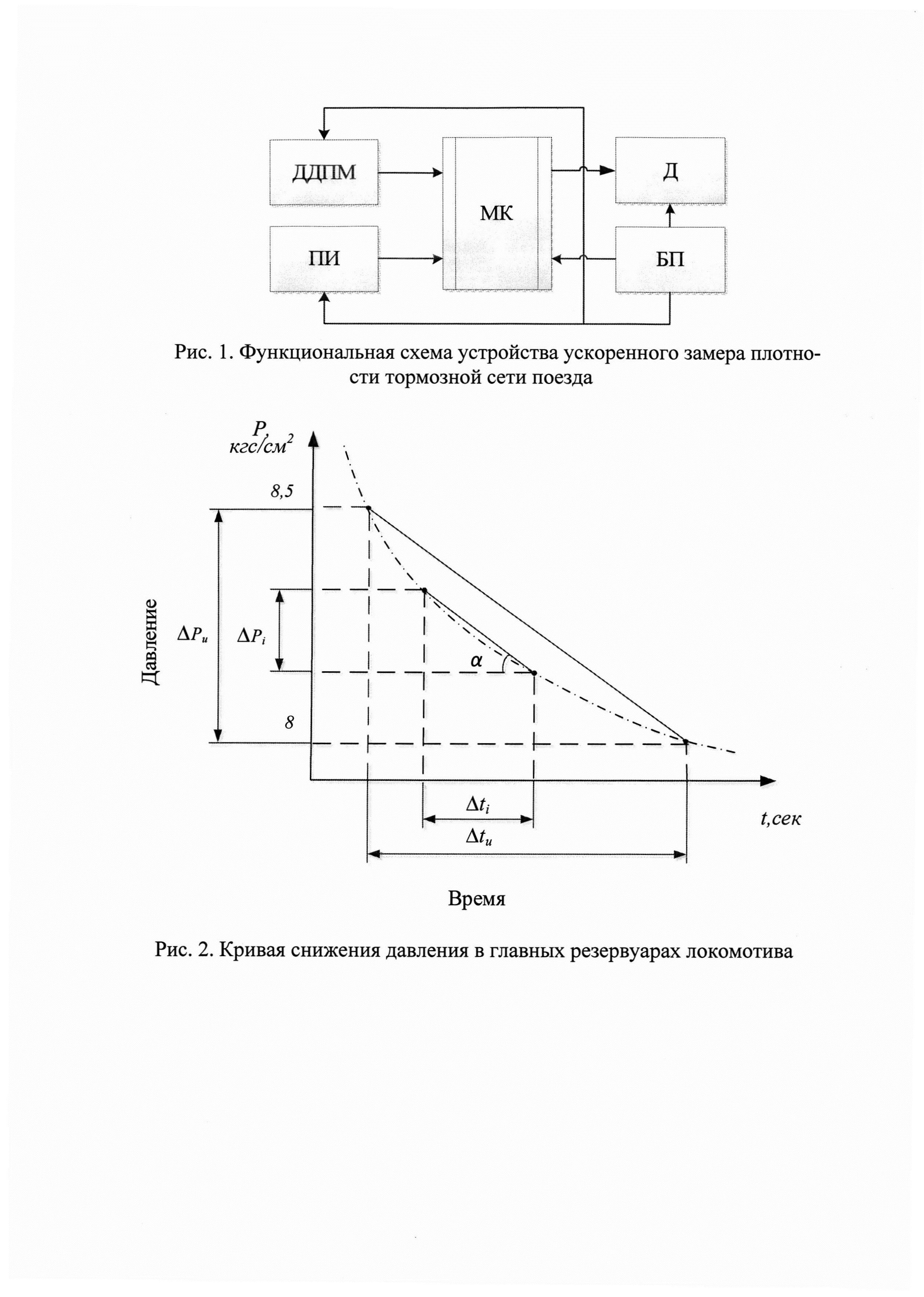 Изобретение относится к железнодорожному транспорту, а именно к устройствам для диагностики тормозной сети поезда. Согласно способу ускоренного замера плотности тормозной сети поезда (УЗПТСП) во время работы локомотива с поездом независимо от давления в главных резервуарах устройство ускоренного замера плотности тормозной сети поезда осуществляет непрерывный замер времени изменения давления на заданный минимальный интервал, например с 8,95 кгс/смдо 8,85 кгс/см, то есть заданным шагом в 0,1 кгс/см, после чего при помощи дискретной обработки кривой снижения давления в главных резервуарах от времени под воздействием утечек тормозной сети поезда посредством математической модели вычисляется ее плотность и осуществляется вывод информации на дисплей. Устройство для реализации способа УЗПТСП состоит из блока питания, микроконтроллера, блока интерфейса, измерителя давления питательной магистрали и дисплея и предназначено для реализации способа ускоренного замера плотности тормозной сети поезда. Измеритель давления питательной магистрали выполнен с возможностью подать на микроконтроллер сигнал, характеризующий величину давления в главных резервуарах локомотива. Микроконтроллер выполнен с возможностью после поступления указанного сигнала вычислить время снижения давления на заданный минимальный шаг 0,1 кгс/сми при помощи итерационного коэффициента приведения, осуществляющего поправку на экспоненциальность кривой снижения давления в главных резервуарах локомотива от утечек, вычислить инструкционную плотность. В результате повышается безопасность движения поездов, увеличивается скорость. 2 н.п. ф-лы, 2 ил.