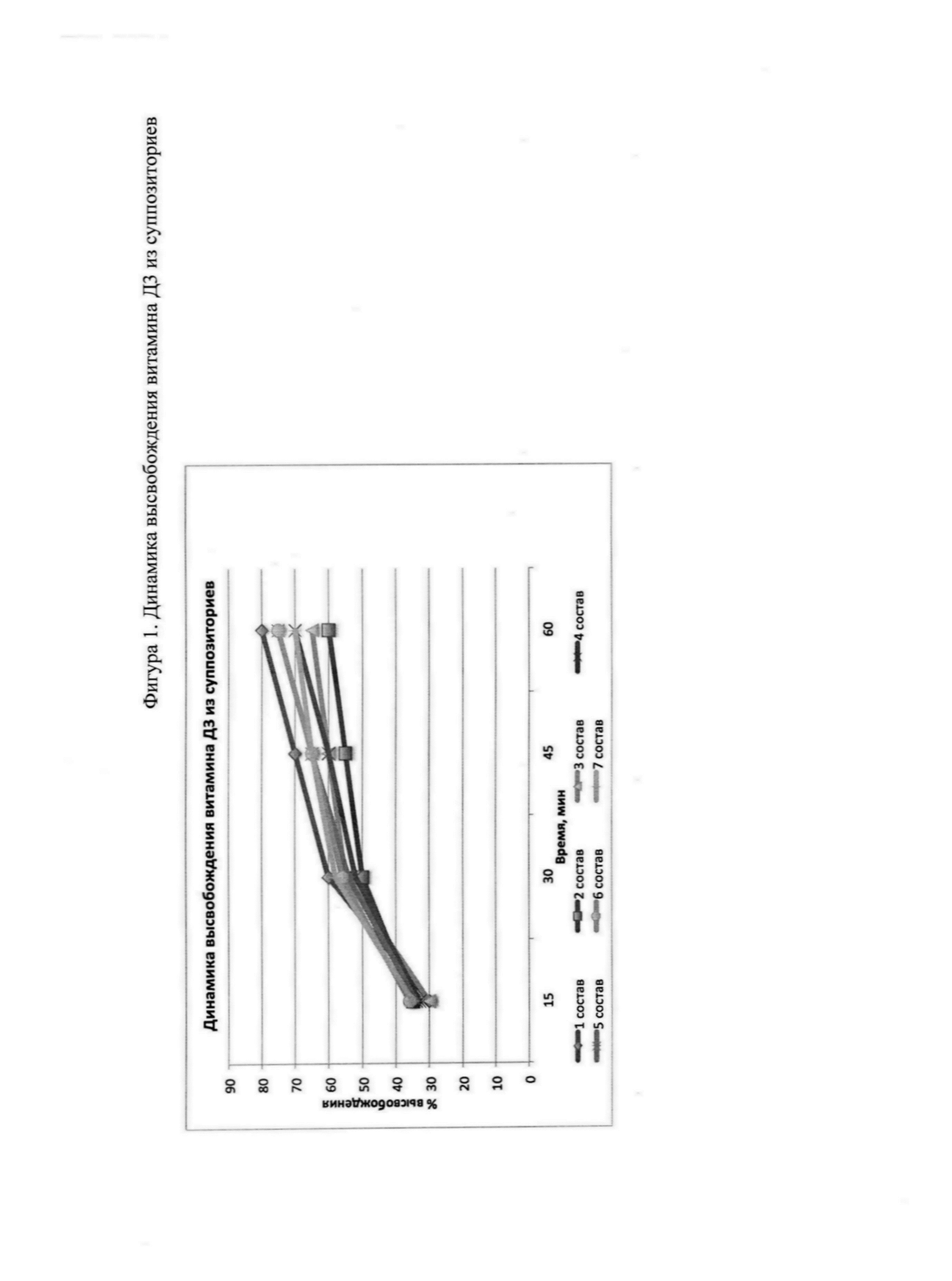 Изобретение относится к фармацевтической промышленности, а именно к производству лекарственной формы для лечения воспалительного заболевания кишечника (ВЗК) - язвенного колита (ЯК). Средство в форме ректальных суппозиториев для лечения ЯК, содержащее витамин Д3, полиэтиленгликоль 1500 (ПЭГ 1500), полиэтиленгликоль 6000 (ПЭГ 6000), эмульгатор Т-2, кремофор RH-40 и лутрол F-127 обладает широким спектром биологической и лечебной активности: оказывает противовоспалительное, антибактериальное, репаративное действие, с равномерным высвобождением действующего вещества. Предлагаемое изобретение относится к области медицины, а именно к фармации, и касается разработки медицинских суппозиториев, содержащих витамин Д3, и может быть использовано в комплексном лечении язвенного колита. Известна пероральная фармацевтическая композиция в форме гранулята, полученного без сферонизации, содержащая в составе месалазин для терапии заболеваний желудочно-кишечного тракта (ЗЖКТ), предпочтительно болезни Крона или неспецифического язвенного колита. Композиция содержит 92-98% по массе месалазина или его фармацевтически приемлемой соли, 2-8% по массе поливинилпирролидона и оболочку, содержащую этилцеллюлозу, где отношение массы указанной оболочки к массе месалазина составляет 0,3-1,5% и масса оболочки из этилцеллюлозы составляет 0,11-0,15 мг/см2. Гранулят упакован в саше, капсулу или блистерную упаковку [патент RU 2547552, 2015]. Однако на сегодняшний день известен широкий спектр нежелательных побочных явлений, возникающих у пациентов в процессе терапии лекраственным средствами, содержащими месалазин. Известно лекарственное средство, представляющее собой ректальный поликомплексный гель для лечения язвенного колита, болезни Крона, свищей и осложнений, вызванных этими заболеваниями характеризующийся тем, что он содержит метронидазол, тимоген, карбопол, пропиленгликоль, динатриваевую соль ЭДТА, пропилпарагидроксибензоат, метилпарагидроксибензоат, натрия гидроксид и воду, причем компоненты в геле находятся в определенном соотношении в г/150 г. [патент RU 2605615, 2016]. Однако данное изобретение может вызывать ряд неудобств во время применения пациентами: локальное раздражение кожного покрова, зуд, дискомфорт. Описано лекарственно средство, содержащее 5-аминосалициловую кислоту (5-АСК) или вещество, распадающееся в организме с образованием 5-АСК и лиофильно высушенной микробной массы живых бифидобактерий или лактобактерий или их смесь, где бактерии могут быть иммобилизованы на сорбенте. Компоненты препарата сгруппированы в две капсулы, при этом одна капсула содержит микробную массу живых бактерий, а другая - месалазин или сульфасалазин[патент RU 297835, 2007]. Тем не менее, на сегодняшний день известен широкий спектр побочных действий, возникающих вследствие применения месалазина. Известна фармацевтическая композиция, проявляющая специфическую противовоспалительную активность на модели экспериментального дисбиоза, состоящая из штаммов Bifidobacteriumlongum GT15, Lactobacillusrhamnosus K32, Enterococcusfaecium L-3. Изобретение может быть использовано для лечения воспалительных заболеваний кишечника, в том числе и язвенного колита [патент RU 2616899, 2017]. Однако предложенное лекарственное средство может быть достаточно дорогостоящим вследствие затрат на его производство. Известно изобретение для лечения не