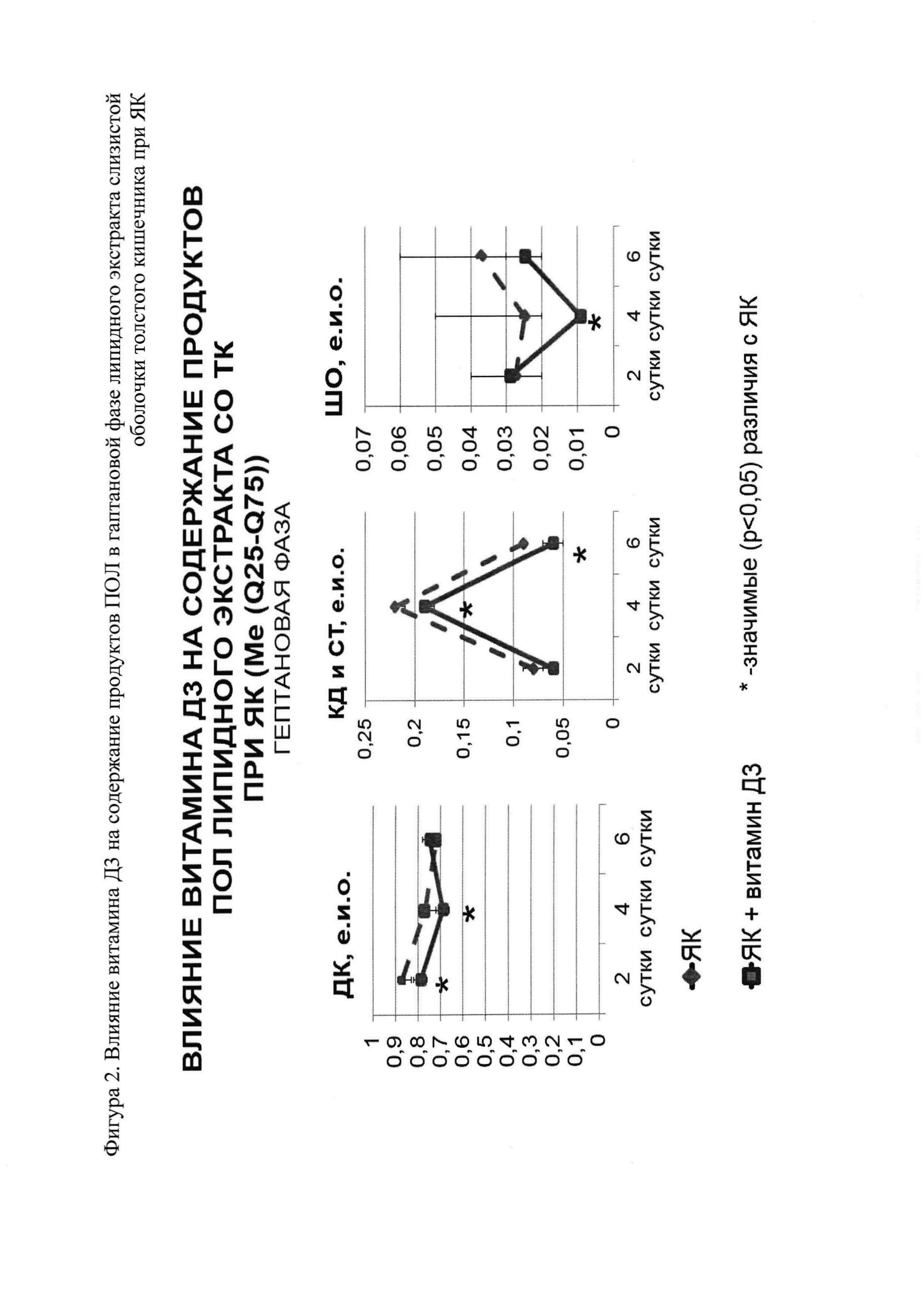 Изобретение относится к медицине и предназначено для комплексного лечения язвенного колита. Используют ректальные суппозитории, содержащие раствор витамина Д3 водный - 1500 ME; полиэтиленгликоль 1500 - 0,3 г; полиэтиленгликоль 6000 - 0,5 г; эмульгатор Т-2 - 0,1 г; кремофор RH-40 - 1,15 г; лутрол F-127 - 0,55 г. Средство обеспечивает расширение арсенала терапевтических средств. 5 ил., 2 табл., 3 пр.