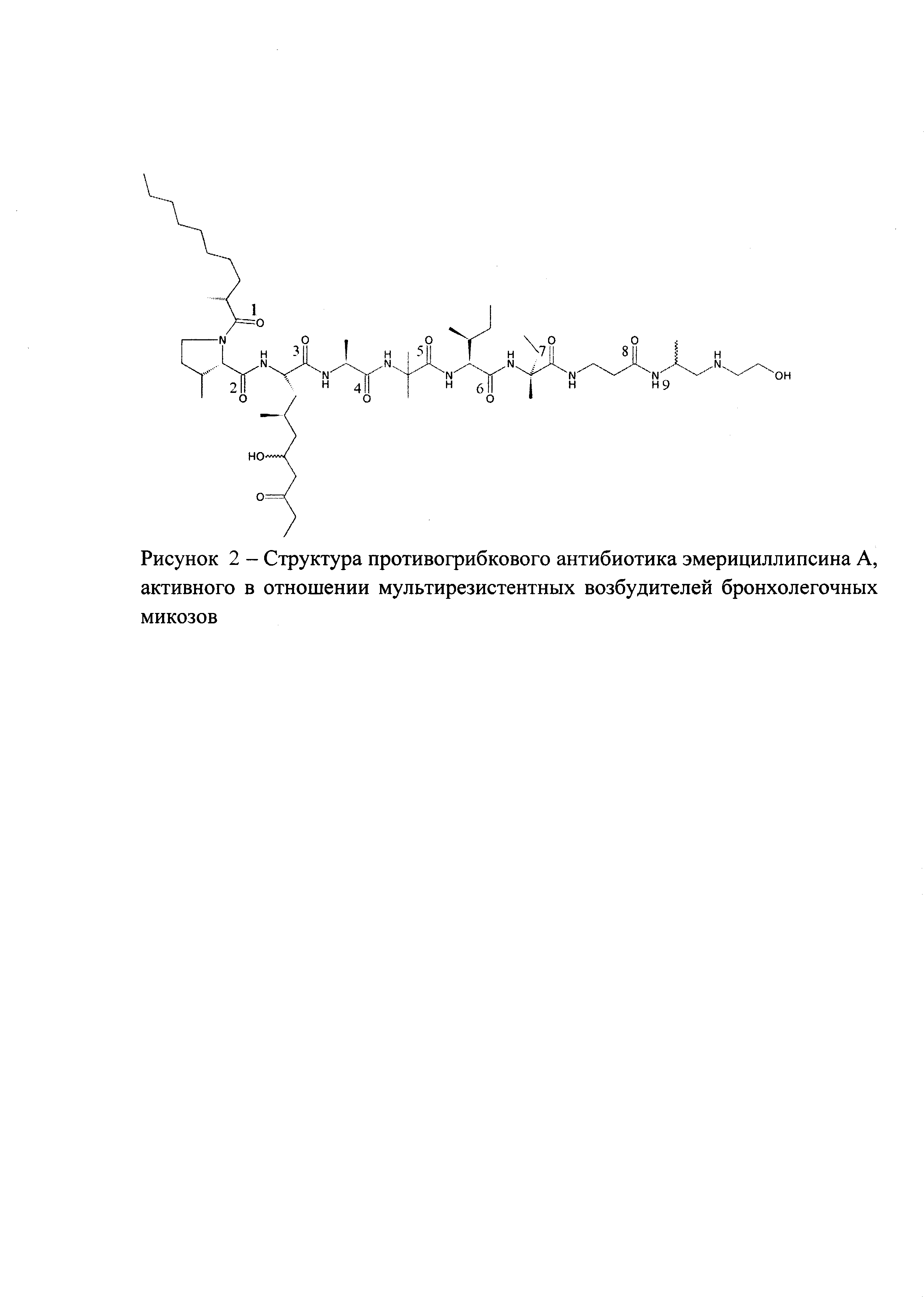 Изобретение относится к способу получения нового пептидного противогрибкового антибиотика эмерициллипсина А, продуцируемого штаммомF -1428, с противогрибковой активностью в отношении1402м,497м 2015, а также988м 2015 и1133м 2011, обладающих природной резистентностью ко всем применяемым в химиотерапии антибиотикам - азолам. Разработан способ получения нового антибиотика на специализированной жидкой щелочной питательной среде с выходом противогрибкового пептида 0,25 г/л. Эмерициллипсин А эффективен при лечении бронхолегочных инвазивных микозов, вызываемых плесневыми грибами и дрожжами. 2 н.п. ф-лы, 2 ил., 4 табл., 5 пр.
